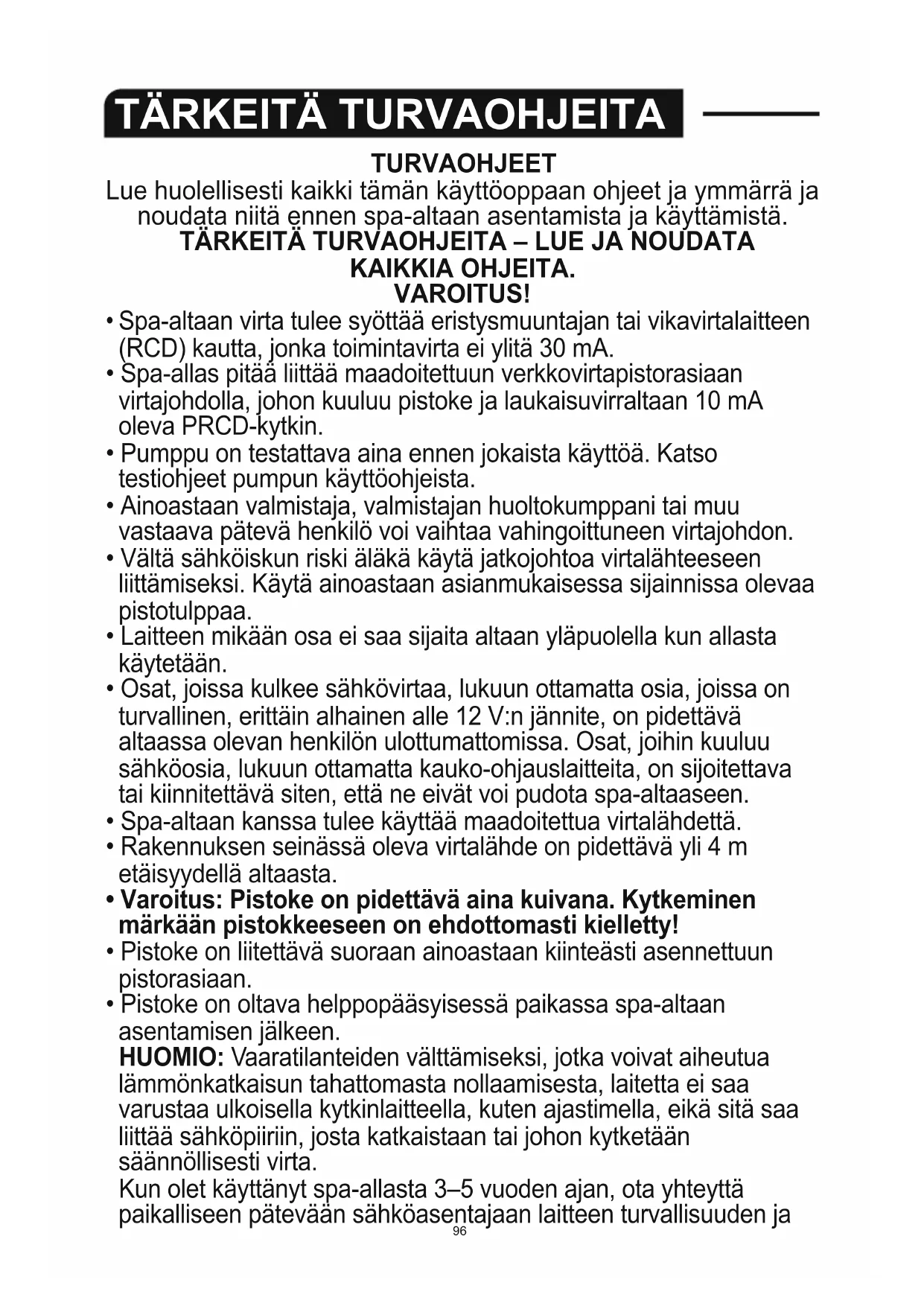 96TURVAOHJEET Lue huolellisesti kaikki tämän käyttöoppaan ohjeet ja ymmärrä ja noudata niitä ennen spa-altaan asentamista ja käyttämistä.