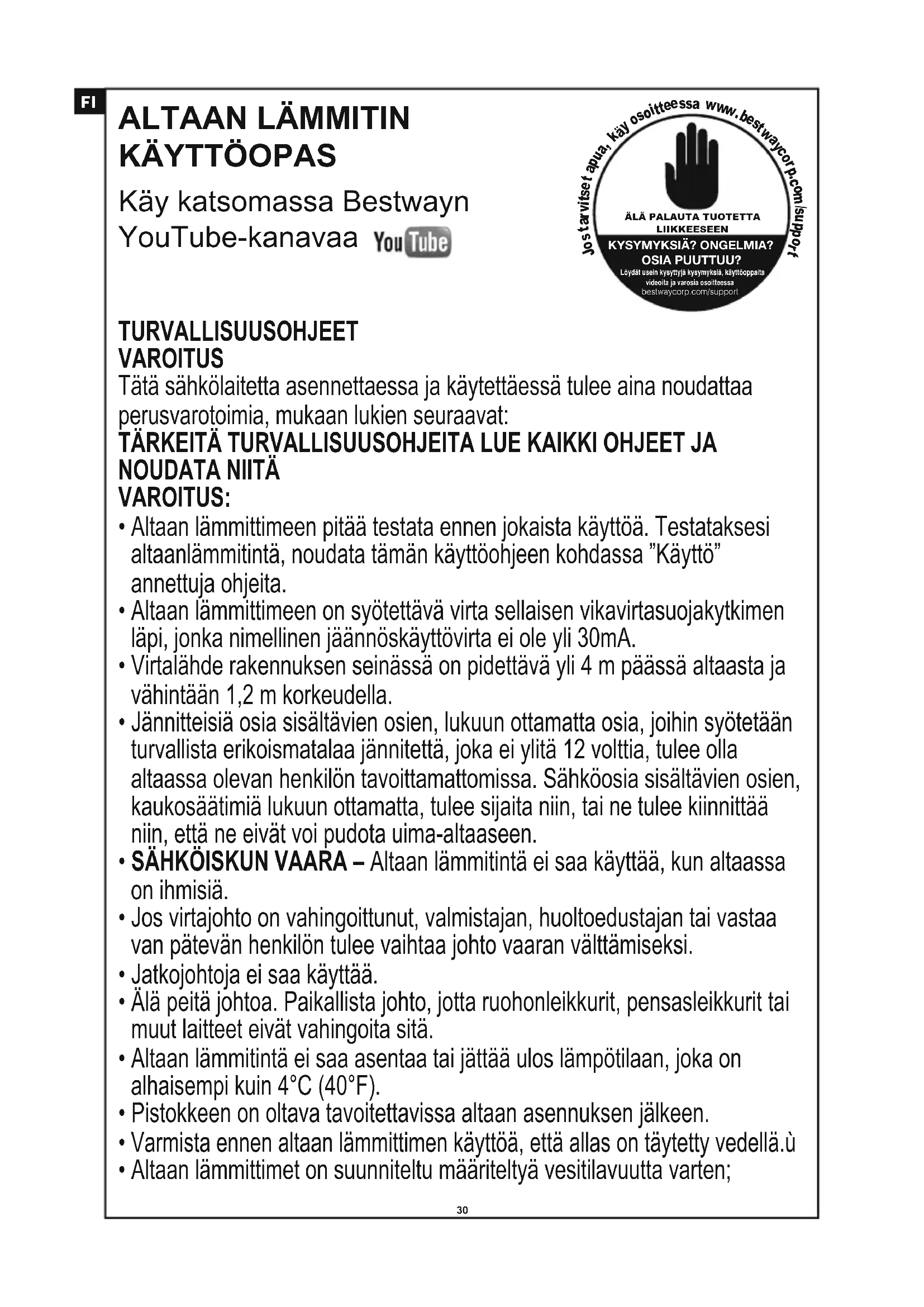 VAROITUS: Älä käytä lämmitintä, jos se ei läpäise testiä, Saat lisätietoja ja apua sivustomme Support-osasta (www.bestwaycorp.com).TURVALLISUUSOHJEET VAROITUS Tätä sähkölaitetta asennettaessa ja käytettäessä tulee aina noudattaa perusvarotoimia, mukaan lukien seuraavat: TÄRKEITÄ TURVALLISUUSOHJEITA LUE KAIKKI OHJEET JA NOUDATA NIITÄ VAROITUS: