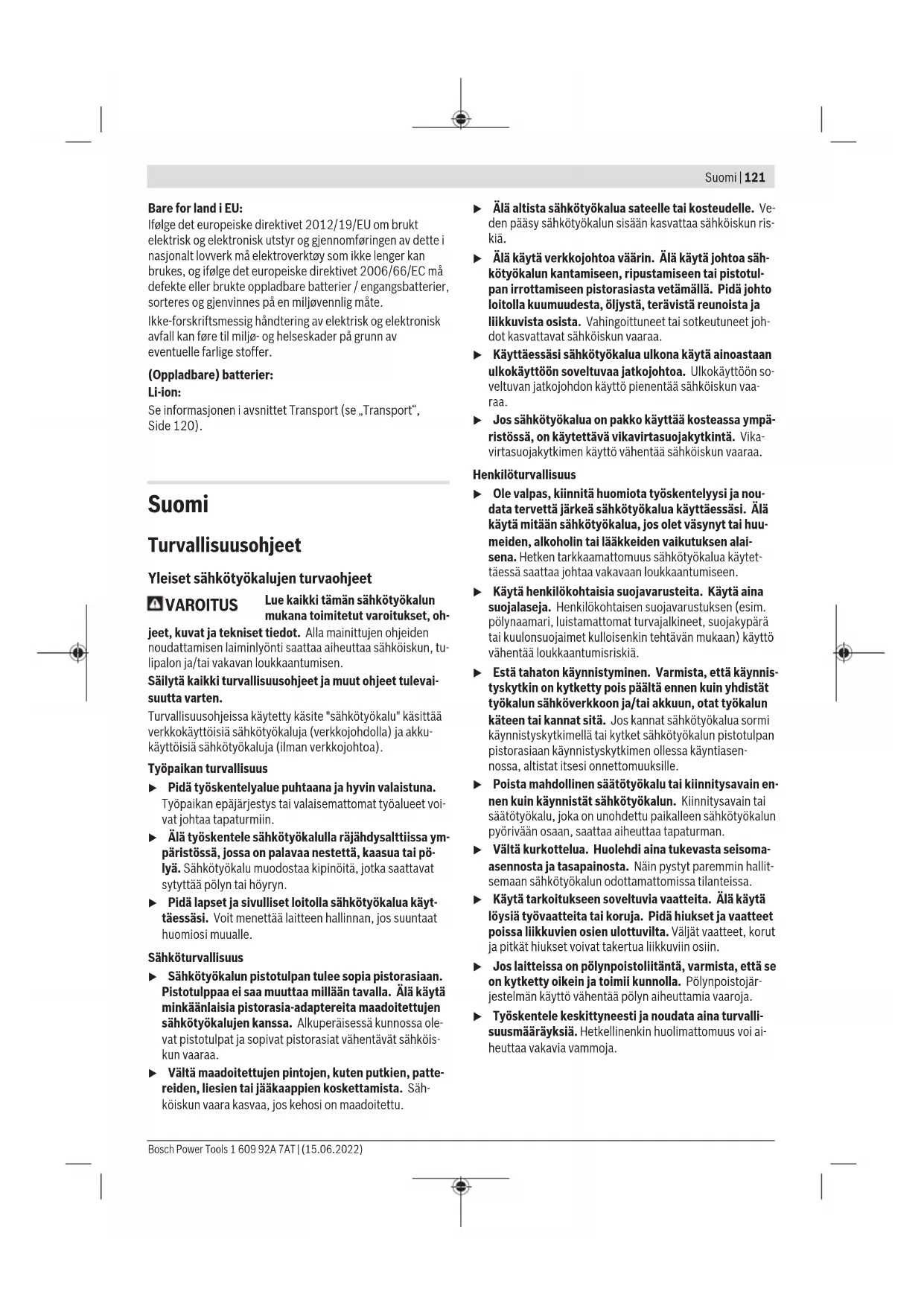 Ohuiden peltilevyjen tai muiden herkästi tärisevien suurialaisten ma- teriaalien hionta voi lisätä melutasoa jopa 15 dB:n verran. Melutasoa voi vähentää paksujen vaimennusmattojen avulla. Lisääntynyt melu- taso on huomioitava sekä melukuormituksen riskiarvioinnissa että so- pivien kuulosuojainten valinnassa. Näissä käyttöohjeissa ilmoitetut tärinä- ja melupäästötiedot on mitattu standardissa määritetyn mittausmenetelmän mu- kaan ja niitä voi käyttää sähkötyökalujen keskinäiseen vertai- luun. Ne soveltuvat myös tärinä- ja melupäästöjen alustavaan arviointiin. Ilmoitetut tärinä- ja melupäästöt vastaavat sähkötyökalun pääasiallisia käyttötapoja. Tärinä- ja melupäästöt saattavat kuitenkin poiketa ilmoitetuista arvoista, jos sähkötyökalua käytetään toisiin töihin, muilla käyttötarvikkeilla tai riittämät- tömästi huollettuna. Tämä saattaa suurentaa koko työsken- telyajan tärinä- ja melupäästöjä huomattavasti. Tärinä- ja melupäästöjen tarkaksi arvioimiseksi on huomioi- tava myös ne ajat, jolloin laite on sammutettuna tai tyhjä- käynnillä. Tämä voi vähentää huomattavasti koko työskente- lyajan tärinä- ja melupäästöjä. Määrittele tarvittavat lisävarotoimenpiteet käyttäjän suojele- miseksi tärinän aiheuttamilta haitoilta (esimerkiksi sähkötyö- kalujen ja käyttötarvikkeiden huolto, käsien pitäminen lämpi- minä ja työprosessien organisointi). Takaiskuun reagoiva toiminnan katkaisu Sähkötyökalun äkillisen takaiskun yhteydessä (esimerkiksi laikan jumittuessa katkaisuleik- kauksessa) elektroniikka katkaisee virransyö- tön moottoriin. Kun haluat ottaa sähkötyökalun uudelleen käyttöön, kytke käynnistyskytkin (8) pois päältä ja käynnistä moottori uudel- leen. Pysäytysjarru Sähkötyökalussa on elektroninen Bosch Brake System. Kun työkalu kytketään pois päältä, hio- matarvike pysähtyy muutamassa sekunnissa. Tämän ansiosta laikan pysähtymisaika lyhenee huomattavasti pysäytysjarruttomiin kulmahio- makoneisiin verrattuna. Siten voi asettaa sähkötyökalun en- tistä nopeammin syrjään. Pehmeä käynnistys Sähkötyökalun elektroninen pehmeä käynnistystoiminto ra- joittaa käynnistettäessä vääntömomenttia ja mahdollistaa työn tarkan aloituksen. Huomautus: jos sähkötyökalu kiihtyy käynnistettäessä heti täyteen nopeuteen, pehmeä käynnistystoiminto ja uudel- leenkäynnistyssuoja ovat epäkunnossa. Sähkötyökalu on lä- 1 609 92A 7AT | (15.06.2022) Bosch Power ToolsSuomi | 127 hetettävä viipymättä valtuutettuun huoltoon, katso osoitteet kohdasta "Huolto ja käyttöneuvonta". Uudelleenkäynnistyssuoja Uudelleenkäynnistyssuoja estää sähkötyökalun hallitsemat- toman käynnistymisen virtakatkoksen jälkeen. Kun haluat ottaa sähkötyökalun uudelleen käyttöön, kytke käynnistyskytkin (8) pois päältä ja käynnistä sähkötyökalu uudelleen. Toiminnan katkaisu työkalun pudotessa Sisäänrakennettu turvakatkaisin katkaisee toiminnan heti kun putoava sähkötyökalu iskeytyy lattiaan. Kun haluat ottaa sähkötyökalun uudelleen käyttöön, kytke käynnistyskytkin(8) pois päältä ja käynnistä moottori uudel- leen. Akku Bosch myy akkukäyttöisiä sähkötyökaluja myös ilman akkua. Pakkauksesta näet, sisältyykö akku sähkötyökalusi toimituk- seen. Akun lataminen u Käytä vain teknisissä tiedoissa ilmoitettuja latauslait- teita. Vain nämä latauslaitteet soveltuvat sähkötyökalus- sasi käytettävälle litiumioniakulle. Huomautus: kansainvälisten kuljetusmääräysten mukaisesti Li-ion-akut toimitetaan osittain ladattuina. Akun täyden suo- rituskyvyn varmistamiseksi akku tulee ladata täyteen ennen ensikäyttöä. Akun asentaminen Työnnä ladattu akku akun kiinnityskohtaan niin, että se lukit- tuu paikalleen. Akun irrottaminen Kun haluat ottaa akun pois, paina akun vapautuspainiketta ja vedä akku irti. Älä irrota akkua väkisin. Akussaon 2 lukitusvaihetta, millä estetään akun irtoaminen, jos painat tahattomasti akunvapautuspainiketta. Sähkötyö- kalussa oleva akku pysyy paikallaan jousen avulla. Akun lataustilan näyttö Akun lataustilan näytön vihreät LED-valot ilmoittavat akun la- taustilan. Turvallisuussyistä lataustilan tarkistaminen on mahdollista vain sähkötyökalun ollessa pysähdyksissä. Kun haluat nähdä lataustilan, paina lataustilan näytön paini- ketta tai . Tämä on mahdollista myös akun ollessa irro- tettuna. Jos lataustilan näytön painikkeen painaminen ei sytytä yh- tään LED-valoa, akku on viallinen ja täytyy vaihtaa. Akkutyyppi GBA 18V... LED-valo Kapasiteetti 3vihreää LED-valoa palaa jatkuvasti 60–100% 2vihreää LED-valoa palaa jatkuvasti 30–60% 1vihreä LED-valo palaa jatkuvasti 5–30% 1vihreä LED-valo vilkkuu 0–5% Akkutyyppi ProCORE18V... LED-valo Kapasiteetti 5vihreää LED-valoa palaa jatkuvasti 80–100% 4vihreää LED-valoa palaa jatkuvasti 60–80% 3vihreää LED-valoa palaa jatkuvasti 40–60% 2vihreää LED-valoa palaa jatkuvasti 20–40% 1vihreä LED-valo palaa jatkuvasti 5–20% 1vihreä LED-valo vilkkuu 0–5% Ohjeita akun optimaaliseen käsittelyyn Suojaa akku kosteudelta ja vedeltä. Säilytä akkua vain –20...50°C lämpötilassa. Älä jätä akkua esimerkiksi kuumana kesäpäivänä pitkäksi ajaksi autoon. Puhdista akun tuuletusaukot säännöllisin väliajoin peh- meällä, puhtaalla ja kuivalla siveltimellä. Huomattavasti lyhentynyt käyntiaika latauksen jälkeen osoit- taa, että akku on elinikänsä lopussa ja täytyy vaihtaa uuteen. Huomioi hävitysohjeet. Asennus Bluetooth® Low Energy -moduulin GCY42 asentaminen Huomautus: malleissa GWS18V-180PC (3601JH6E04, 3601JH6EB4) Bluetooth ® Low Energy -moduuli GCY42 kuuluu vakiovarustukseen, malliin GWS18V-180PC (3601JH6EE4) Bluetooth ® Low Energy -moduuli GCY42 on saatavana lisävarusteena. Lue asiaankuuluva käyttöopas, joka sisältää Bluetooth® Low Energy -moduulia GCY42 koskevat lisätiedot