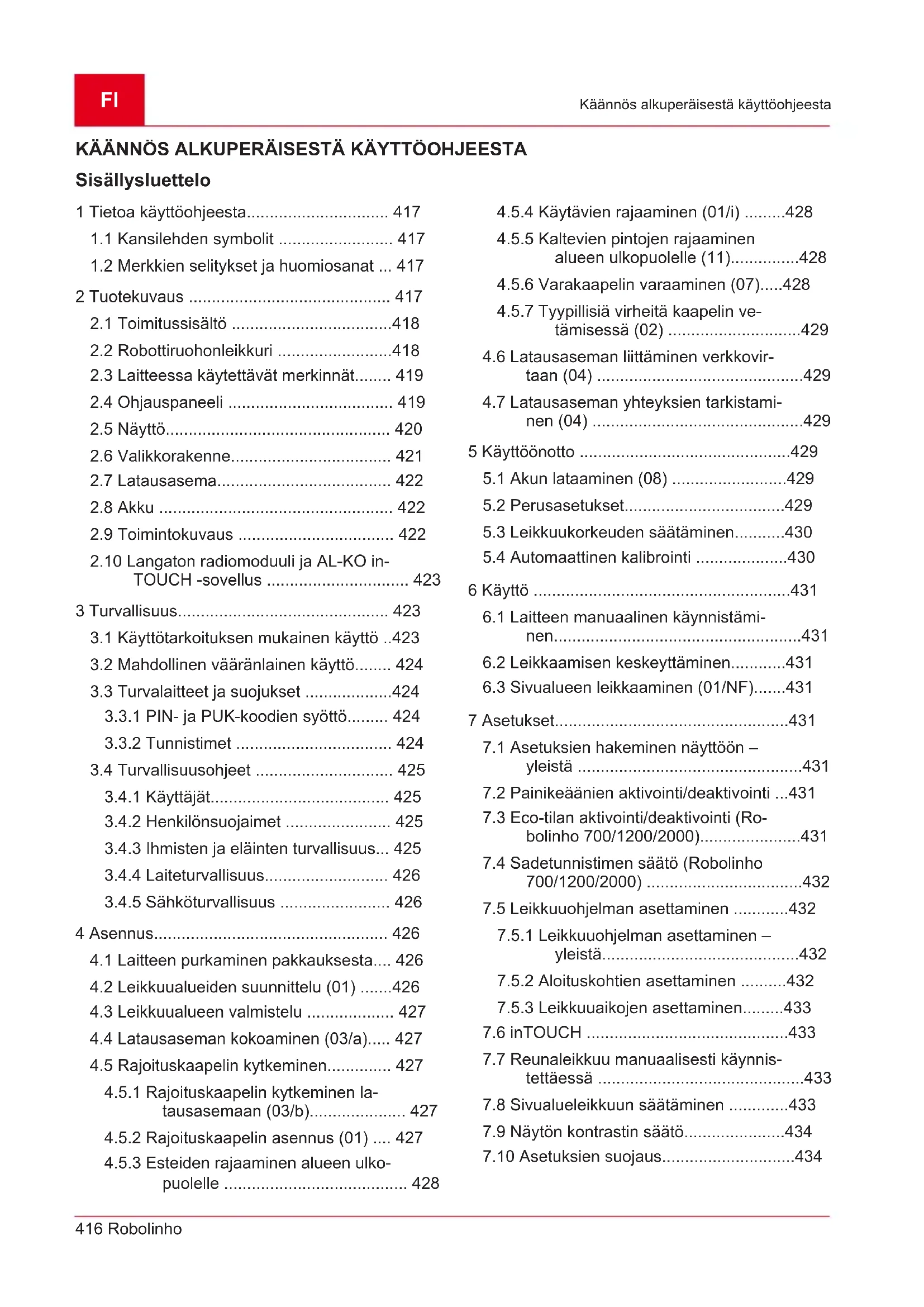 Ohjelmat Viikko-ohjelma katso Luku 7.5 "Leikkuuohjelman asettaminen", si- vu432 Aloituskohdat katso Luku 7.5.2 "Aloituskohtien asettaminen", si- vu432 Ohjelmatiedot katso Luku 8 "Tietojen näyttäminen", sivu434 Asetukset Kellonaika katso Luku 5.2 "Perusasetukset", sivu429 Päivämäärä katso Luku 5.2 "Perusasetukset", sivu429 Kieli katso Luku 5.2 "Perusasetukset", sivu429 PIN-koodi katso Luku 5.2 "Perusasetukset", sivu429 Painikeäänet katso Luku 7.2 "Painikeäänien aktivointi/deaktivointi", sivu431 EcoMode katso Luku 7.3 "Eco-tilan aktivointi/deaktivointi (Robolinho 700/1200/2000)", sivu431 * Sadetunnistinkatso Luku 7.4 "Sadetunnistimen säätö (Robolinho 700/1200/2000)", sivu432 * Sadetunnistimen viive" katso Luku 7.4 "Sadetunnistimen säätö (Robolinho 700/1200/2000)", sivu432* Sadeant. herkk. katso Luku 7.4 "Sadetunnistimen säätö (Robolin- ho 700/1200/2000)", sivu432* inTOUCH katso Luku 7.6 "inTOUCH", sivu433 Reunaleikkuu katso Luku 7.7 "Reunaleikkuu manuaalisesti käynnis- tettäessä", sivu433 Sivualue aktiivinen/ei aktiivinen katso Luku 7.8 "Si- vualueleikkuun säätäminen", sivu433 Näytön kontrasti katso Luku 7.9 "Näytön kontrastin säätö", si- vu434 Asetuksien suojaus katso Luku 7.10 "Asetuksien suojaus", si- vu434 Uudelleenkalibrointi katso Luku 7.11 "Uudelleenkalibrointi", si- vu434 Tehdasasetukset katso Luku 7.12 "Tehdasasetusten palauttami- nen", sivu434 Info Terähuolto katso Luku 8 "Tietojen näyttäminen", sivu434 Laitteisto katso Luku 8 "Tietojen näyttäminen", sivu434 Ohjelmisto katso Luku 8 "Tietojen näyttäminen", sivu434 Ohjelmatiedot katso Luku 8 "Tietojen näyttäminen", sivu434 Häiriöt katso Luku 8 "Tietojen näyttäminen", sivu434