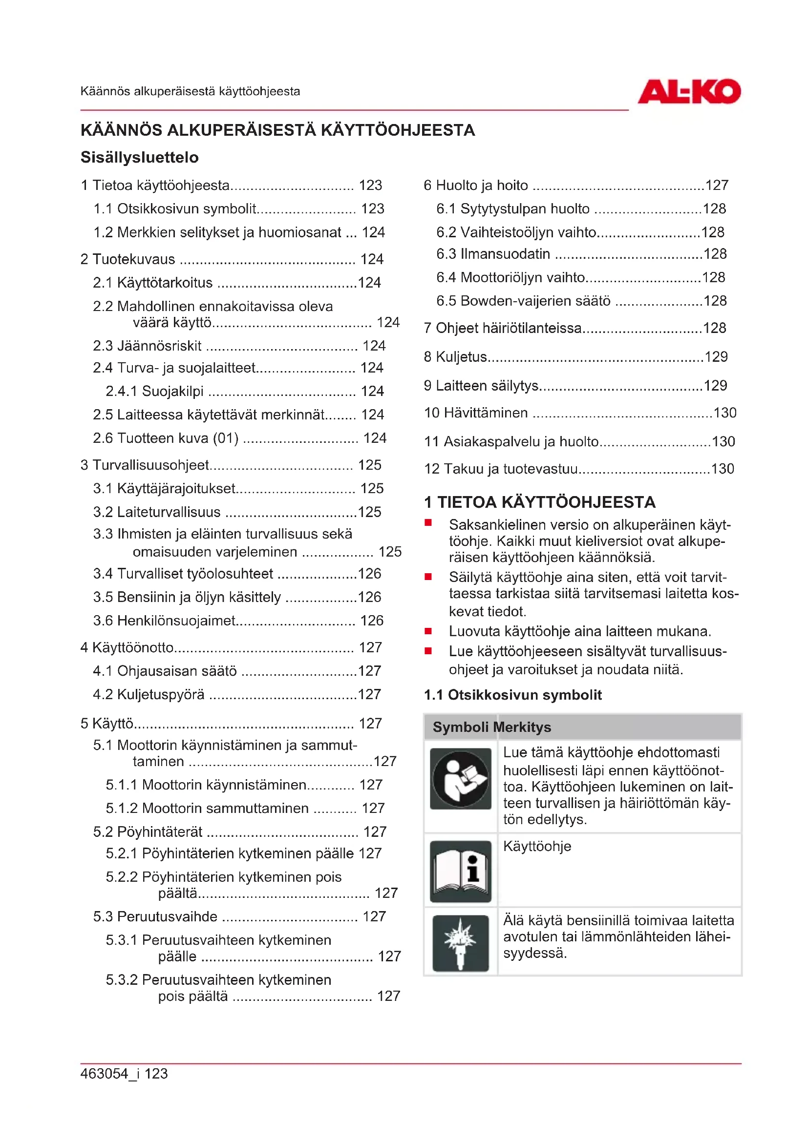 Tuotteen yleiskuvaan (01) on merkitty laitteen osat. Nro Osa 1 Kytkinvipu 2 Kaasukahva 3 Peruutusvaihteen vipu 4 Käynnistinköysi 5 Kuljetuspyörä 6 Pöyhintäterät 7 Suojalevyt 8 Suojalevy 9 Jarrutuki463054_i 125 Turvallisuusohjeet 3 TURVALLISUUSOHJEET VAARA! Hengenvaara ja vakavien vam- mojen vaara! Tietämättömyys turvallisuus- ja käyttöohjeista voi aiheuttaa erittäin vakavia vam- moja ja jopa kuoleman.