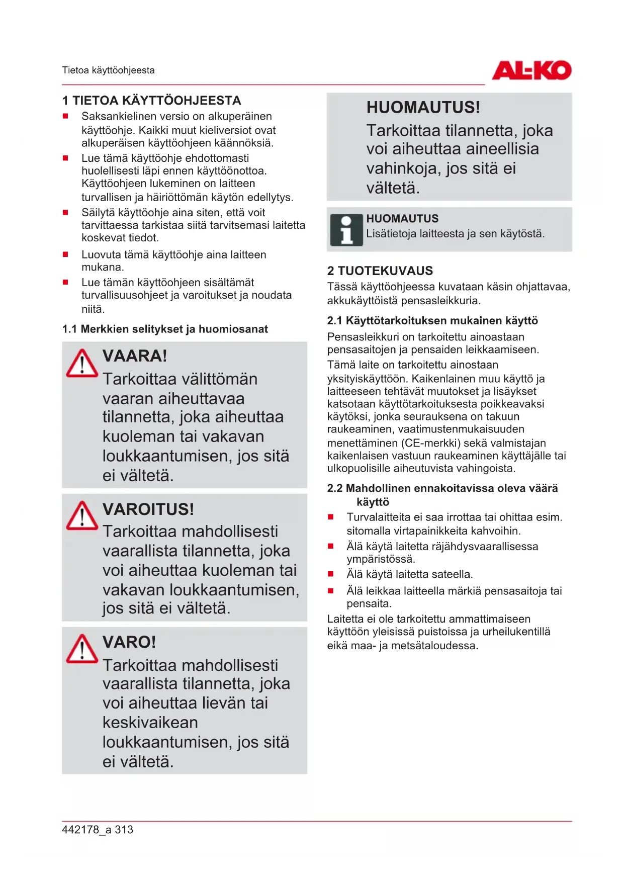 VAARA! Tarkoittaa välittömän vaaran aiheuttavaa tilannetta, joka aiheuttaa kuoleman tai vakavan loukkaantumisen, jos sitä ei vältetä. VAROITUS! Tarkoittaa mahdollisesti vaarallista tilannetta, joka voi aiheuttaa kuoleman tai vakavan loukkaantumisen, jos sitä ei vältetä. VARO! Tarkoittaa mahdollisesti vaarallista tilannetta, joka voi aiheuttaa lievän tai keskivaikean loukkaantumisen, jos sitä ei vältetä. HUOMAUTUS! Tarkoittaa tilannetta, joka voi aiheuttaa aineellisia vahinkoja, jos sitä ei vältetä. HUOMAUTUS Lisätietoja laitteesta ja sen käytöstä. 2 TUOTEKUVAUS Tässä käyttöohjeessa kuvataan käsin ohjattavaa, akkukäyttöistä pensasleikkuria.