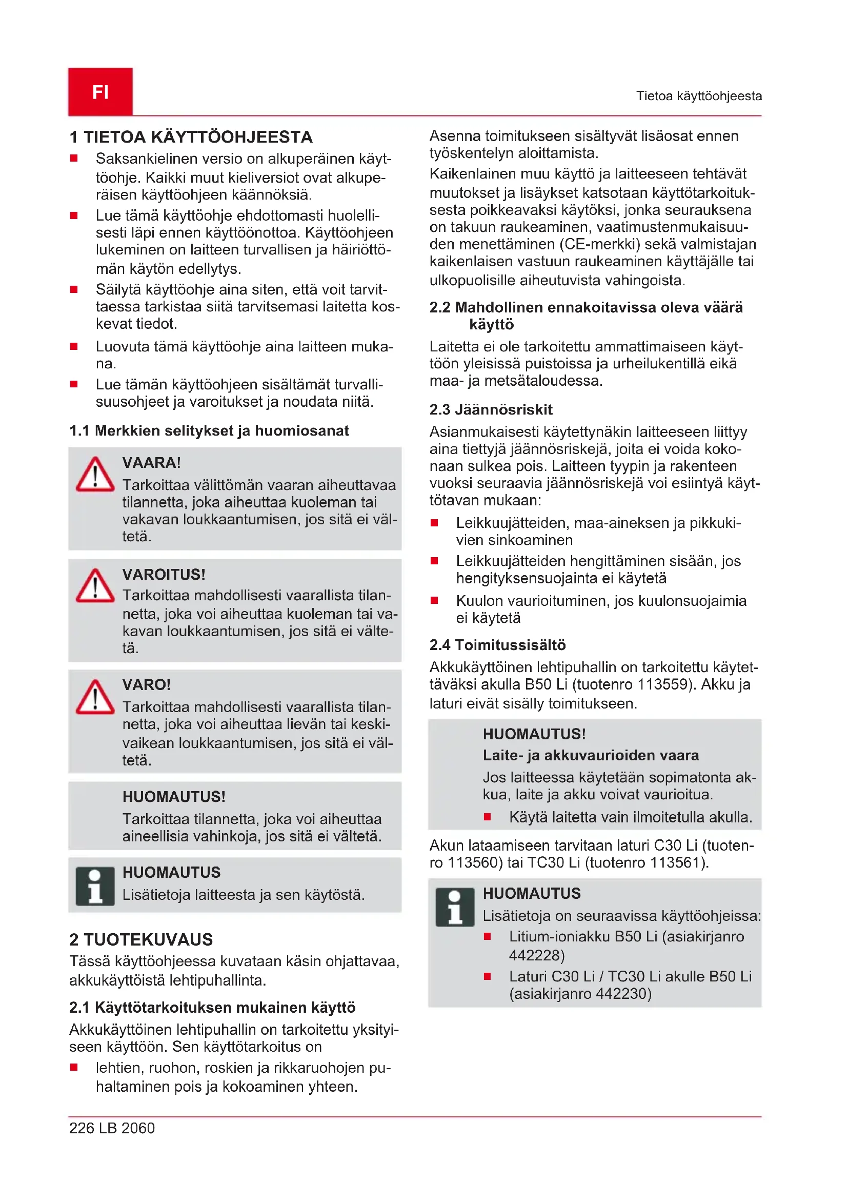 Säilytä kaikki turvaohjeet ja ohjeet tu- levaa tarvetta varten.FI 228 LB 2060 Turvallisuusohjeet Turvallisuusohjeissa käytettävä sähkötyökalun käsite viittaa verkkovirralla toimiviin sähkötyöka- luihin (verkkojohto) ja akkukäyttöisiin sähkötyöka- luihin (ei verkkojohtoa).