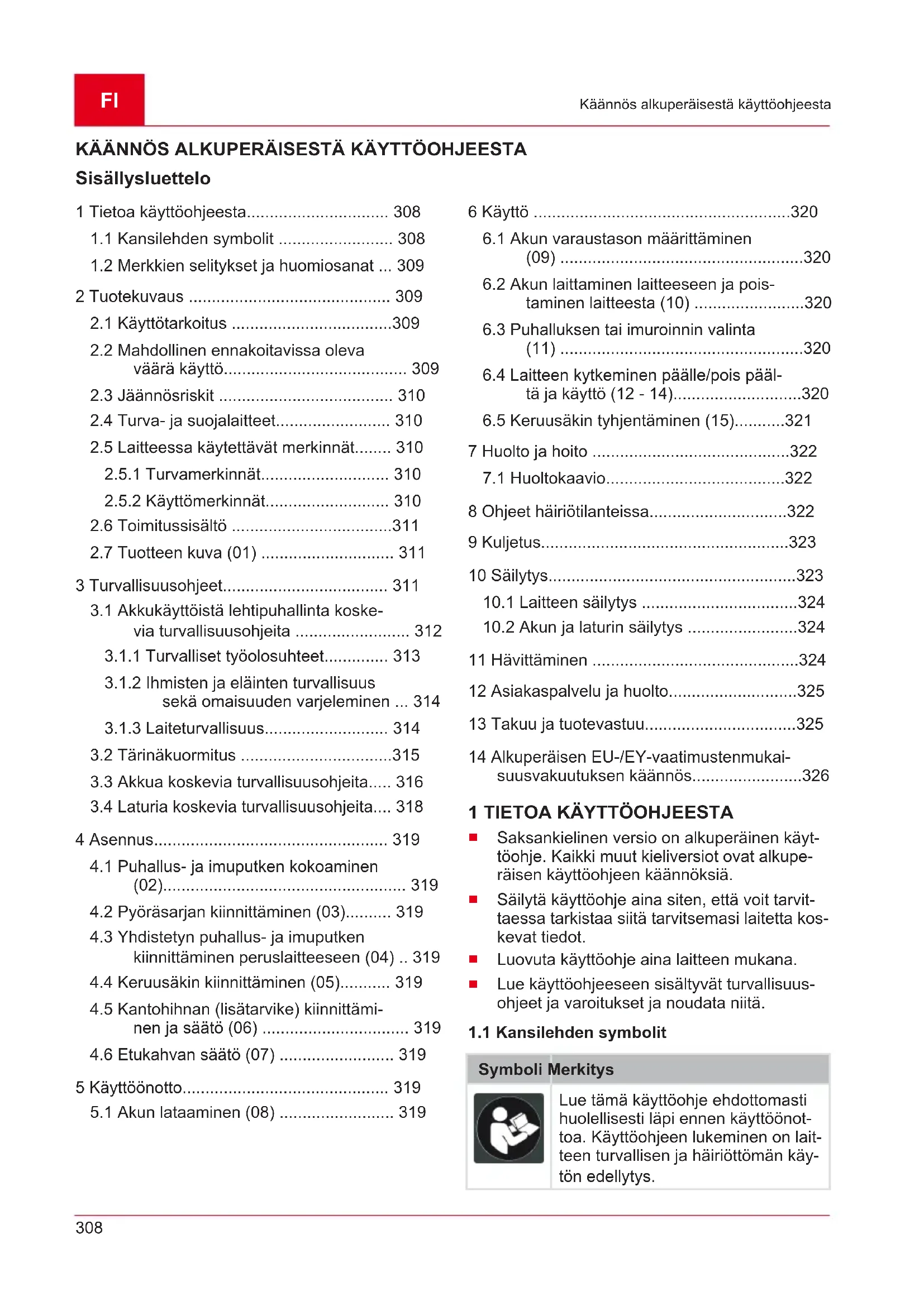 Käännös alkuperäisestä käyttöohjeesta KÄÄNNÖS ALKUPERÄISESTÄ KÄYTTÖOHJEESTA Sisällysluettelo 1 Tietoa käyttöohjeesta............................... 308
