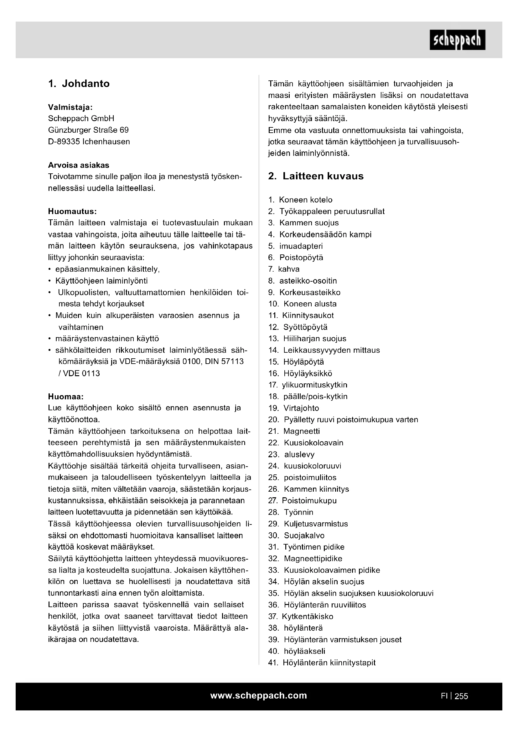 Valmistaja: Scheppach GmbH Günzburger Straße 69 D-89335 Ichenhausen Arvoisa asiakas Toivotamme sinulle paljon iloa ja menestystä työsken- nellessäsi uudella laitteellasi. Huomautus: Tämän laitteen valmistaja ei tuotevastuulain mukaan vastaa vahingoista, joita aiheutuu tälle laitteelle tai tä- män laitteen käytön seurauksena, jos vahinkotapaus liittyy johonkin seuraavista: