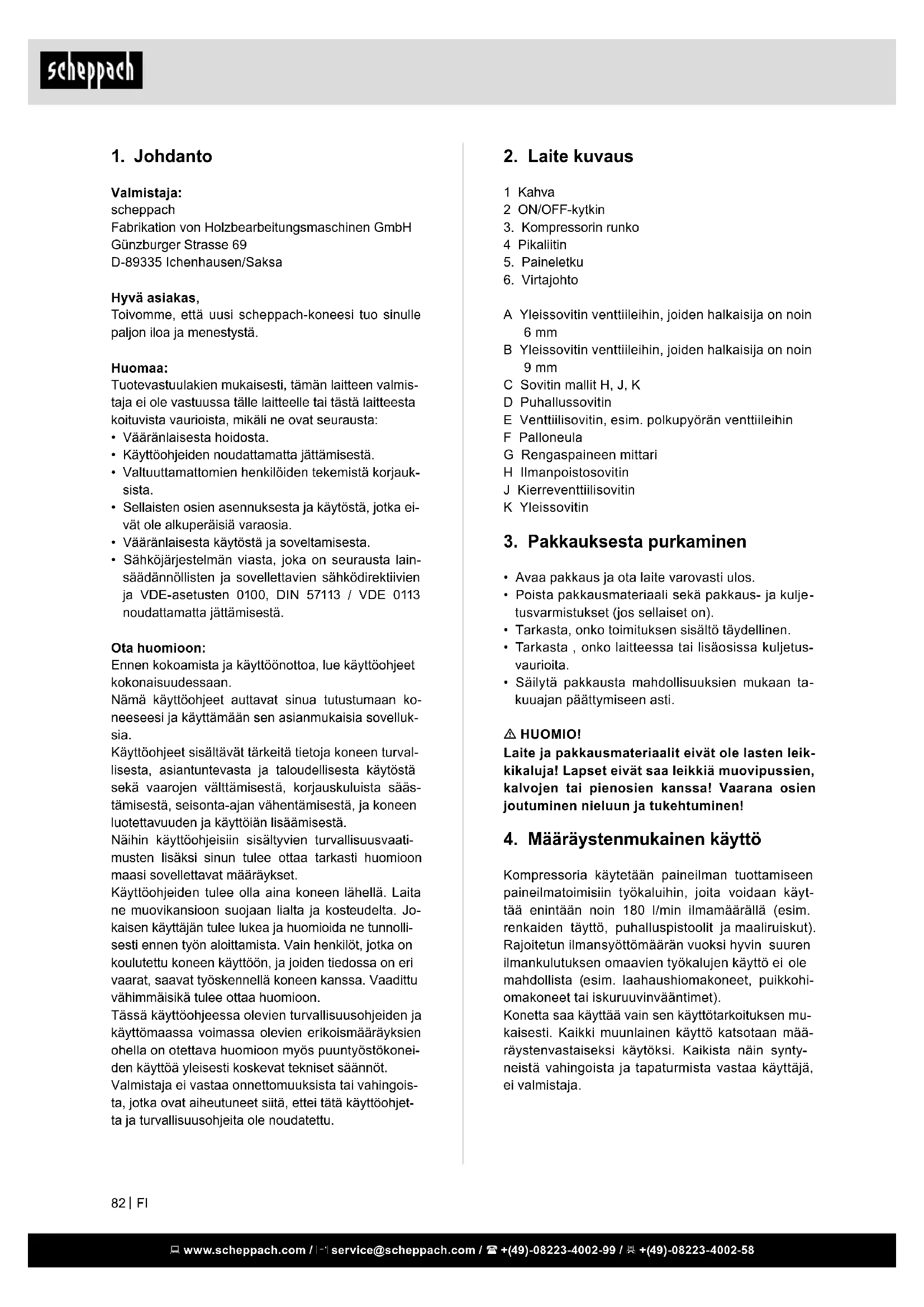 m Huomio! Tätä kompres soria käytettäessä on nou datettava seuraavia periaat teellisia turvallisuusmää räyksiä säh köiskujen, vammojen ja palo vaaran vält- tämiseksi. Lue ja huo mioi nämä ohjeet ennen lait- teen käyttöä. Turvallinen työskentely 1 Pidä työalue siistinä – Työalueen epäjärjestys li sää onnettomuusris - kejä. 2 Huomioi ympäristö vaiku tukset – Älä aseta kompresso ria alttiiksi sateelle. – Älä käytä kompressoria kos teassa tai märässä ympäristössä. Huolehdi hyvästä valaistuk sesta. – Älä käytä kompres soria helposti syttyvien nes- tei - den tai kaasujen lä hellä. 3 Suojaudu sähköiskun varalta – Vältä koskettamasta maadoitettuihin kappa lei - siin, kuten esim. put kiin, lämmittimiin, liesiin ja jää kaappeihin. 4 Pidä lapset poissa! – Älä anna muitten kos kea kompressoriin tai joh- toihin, pidä heidät poissa työ alueelta. 5 Säilytä kompressori tur vallisessa paikassa – Käytön väliaikoina tulee kompressori säilyttää kui vassa, suljetussa ti lassa poissa lasten ulot - tuvilta. 6 Älä ylikuormita komp ressoria – Työskentelet helpom min ja turvallisemmin an- netulla tehoalueella. 7 Käytä sopivaa työvaa tetusta – Älä käytä väljiä vaattei ta tai koruja, ne voivat taker tua liikkuviin osiin. – Työs kennellessä ulkona suositel laan kumikäsi - neitä ja pitäviä jalkineita. – Käytä hiusverkkoa, jos hiuksesi ovat pitkät. 8 Älä käytä johtoa väärin – Älä vedä kompressoria johdosta, äläkä irroita pis toketta vetämällä johdosta. Suojaa johto kuumuudelta, öljyltä ja teräviltä reunoilta. 9 Hoida kompressoria huo lella – Pidä kompressori puh taana voidaksesi työsken - nellä hyvin ja tur vallisesti. – Noudata huol - tomääräyk siä. – Tarkista pistoke ja johto säännöl - lisin väliajoin, ja toimita ne asiantuntevan am - mattiliikkeen vaihdetta vaksi, jos huomaat vau rioita. – Tarkista jatkojoh dot säännöllisesti ja vaihda vahingoittunut johto. www.scheppach.com / service@scheppach.com / +(49)-08223-4002-99 / +(49)-08223-4002-58