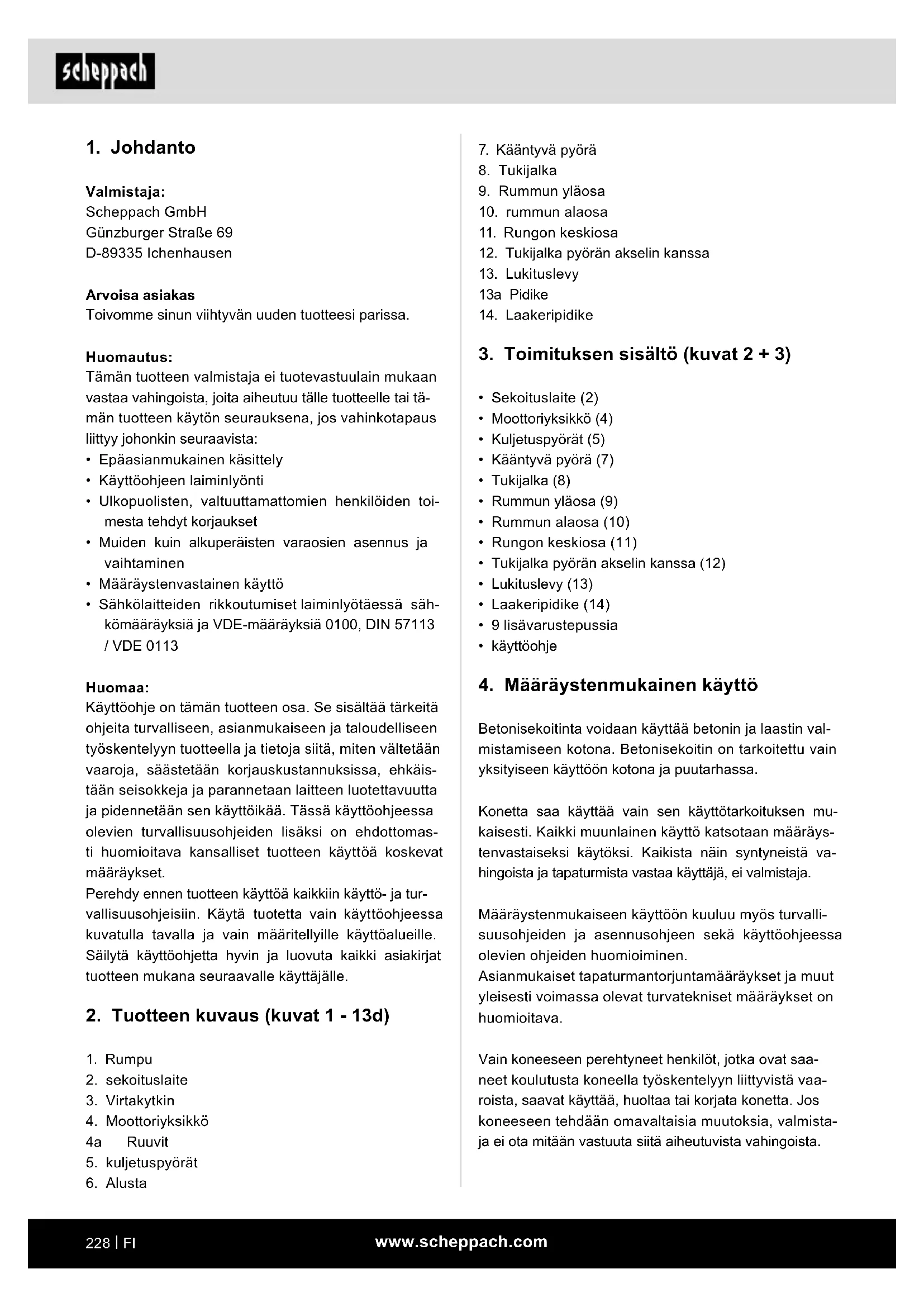 Valmistaja: Scheppach GmbH Günzburger Straße 69 D-89335 Ichenhausen Arvoisa asiakas Toivomme sinun viihtyvän uuden tuotteesi parissa. Huomautus: Tämän tuotteen valmistaja ei tuotevastuulain mukaan vastaa vahingoista, joita aiheutuu tälle tuotteelle tai tä- män tuotteen käytön seurauksena, jos vahinkotapaus liittyy johonkin seuraavista: