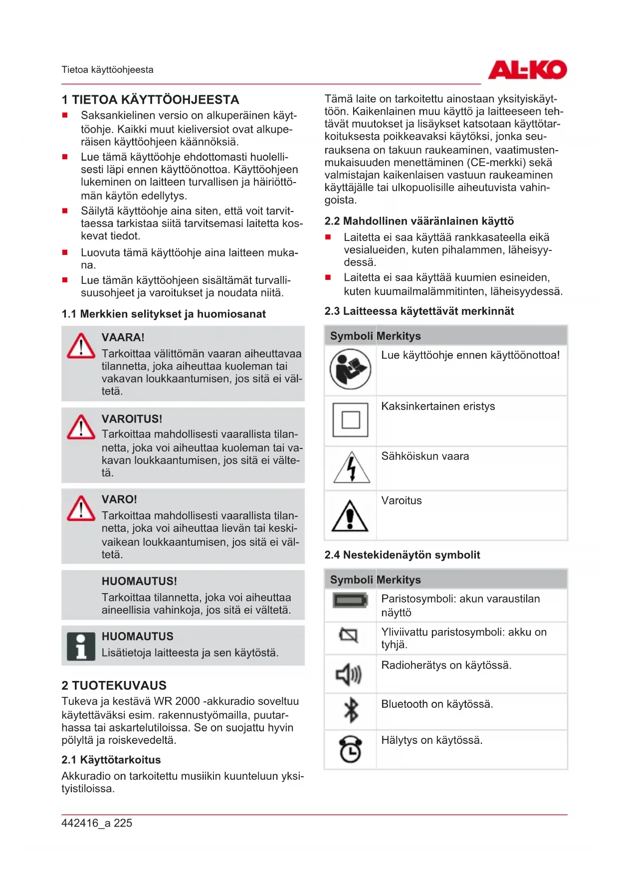 VAARA! Tarkoittaa välittömän vaaran aiheuttavaa tilannetta, joka aiheuttaa kuoleman tai vakavan loukkaantumisen, jos sitä ei väl- tetä. VAROITUS! Tarkoittaa mahdollisesti vaarallista tilan- netta, joka voi aiheuttaa kuoleman tai va- kavan loukkaantumisen, jos sitä ei välte- tä. VARO! Tarkoittaa mahdollisesti vaarallista tilan- netta, joka voi aiheuttaa lievän tai keski- vaikean loukkaantumisen, jos sitä ei väl- tetä. HUOMAUTUS! Tarkoittaa tilannetta, joka voi aiheuttaa aineellisia vahinkoja, jos sitä ei vältetä. HUOMAUTUS Lisätietoja laitteesta ja sen käytöstä. 2 TUOTEKUVAUS Tukeva ja kestävä WR2000 -akkuradio soveltuu käytettäväksi esim. rakennustyömailla, puutar- hassa tai askartelutiloissa. Se on suojattu hyvin pölyltä ja roiskevedeltä.