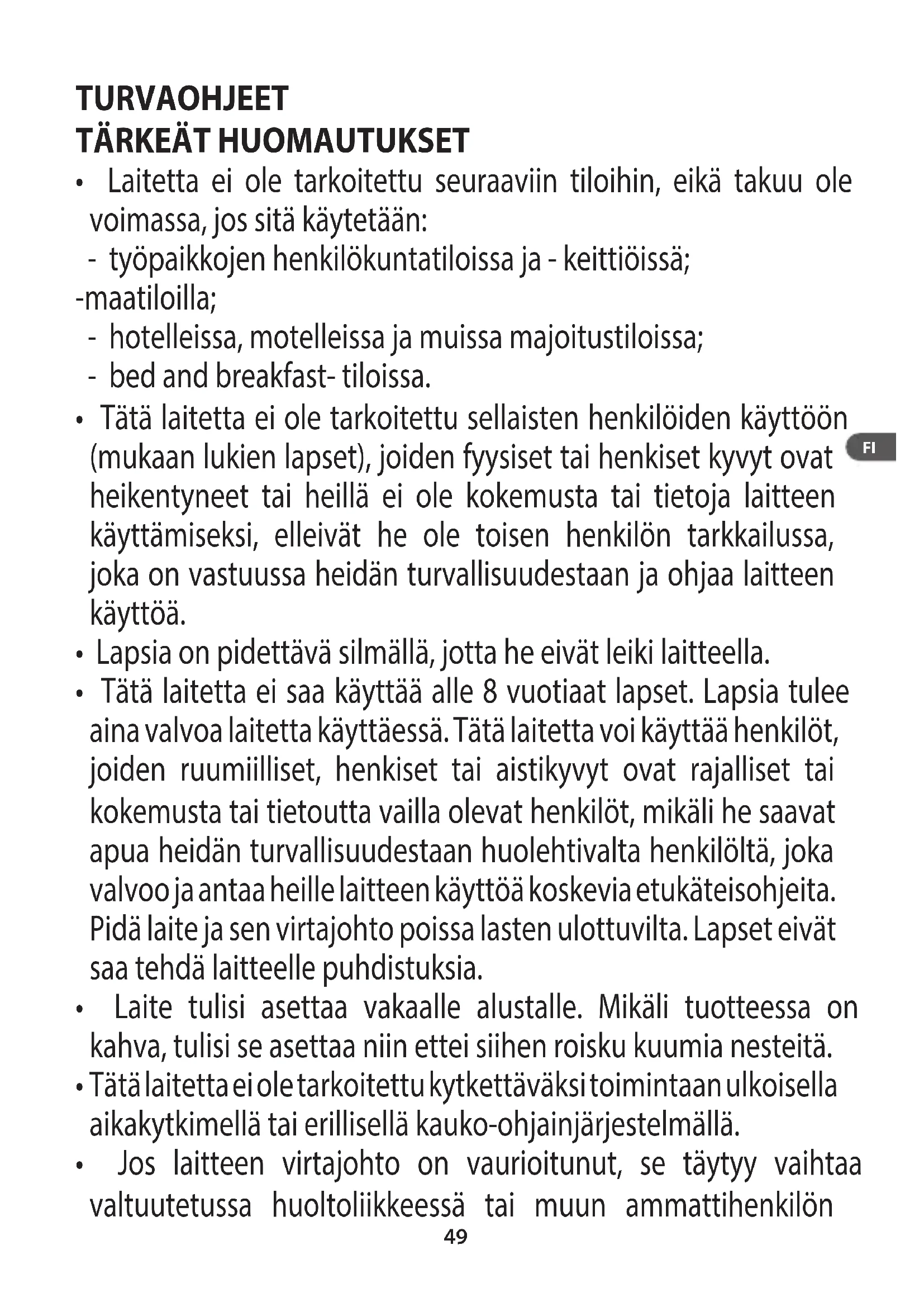 - Tätä laitetta ei saa käyttaa alle 8 vuotiaat lapset. Lapsia tulee aina valvoa laitetta käyttaessä. Tätä laitetta voi käyttaa henkilöt, joiden ruumiilliset, henkiset tai aistikvyt ovat rajalliset tai kokemusta tai tietoutta vailla olevat henkilöt, mikäi he saavat apua heidän turvallisuudestaan huolehtivalta henkilöltä, joka valvoo ja antaa/heille laitteen käyttoa koskevia etukäteisohjeita. Pidä laite ja sen virtajohto poissa lasten ulottuvilta. Lapset eivät saa tehdä laitteelle puhdistuksia.