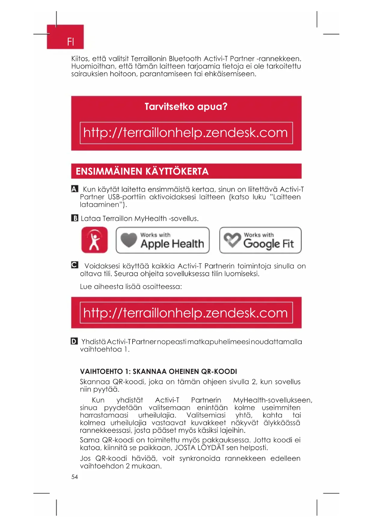Kiitos, että valitsit Terraillonin Bluetooth Activi-T Partner -rannekkeen. Huomioithan, että tämän laitteen tarjoamia tietoja ei ole tarkoitettu sairauksien hoitoon, parantamiseen tai ehkäisemiseen.