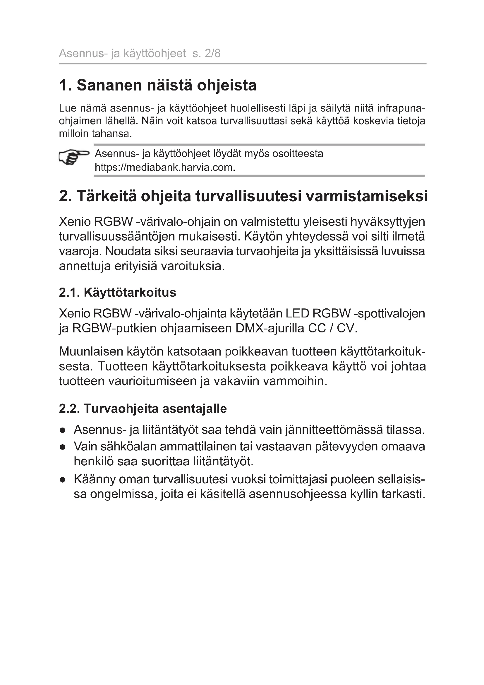 Xenio RGBW -värivalo-ohjain on valmistettu yleisesti hyväksyttyjen turvallisuussääntöjen mukaisesti. Käytön yhteydessä voi silti ilmetä vaaroja. Noudata siksi seuraavia turvaohjeita ja yksittäisissä luvuissa annettuja erityisiä varoituksia. 2.1. Käyttötarkoitus Xenio RGBW -värivalo-ohjainta käytetään LED RGBW -spottivalojen ja RGBW-putkien ohjaamiseen DMX-ajurilla CC / CV. Muunlaisen käytön katsotaan poikkeavan tuotteen käyttötarkoituk- sesta. Tuotteen käyttötarkoituksesta poikkeava käyttö voi johtaa tuotteen vaurioitumiseen ja vakaviin vammoihin. 2.2. Turvaohjeita asentajalle ● Asennus- ja liitäntätyöt saa tehdä vain jännitteettömässä tilassa. ● Vain sähköalan ammattilainen tai vastaavan pätevyyden omaava henkilö saa suorittaa liitäntätyöt. ● Käänny oman turvallisuutesi vuoksi toimittajasi puoleen sellaisis- sa ongelmissa, joita ei käsitellä asennusohjeessa kyllin tarkasti.FI Asennus- ja käyttöohjeet s. 3/8