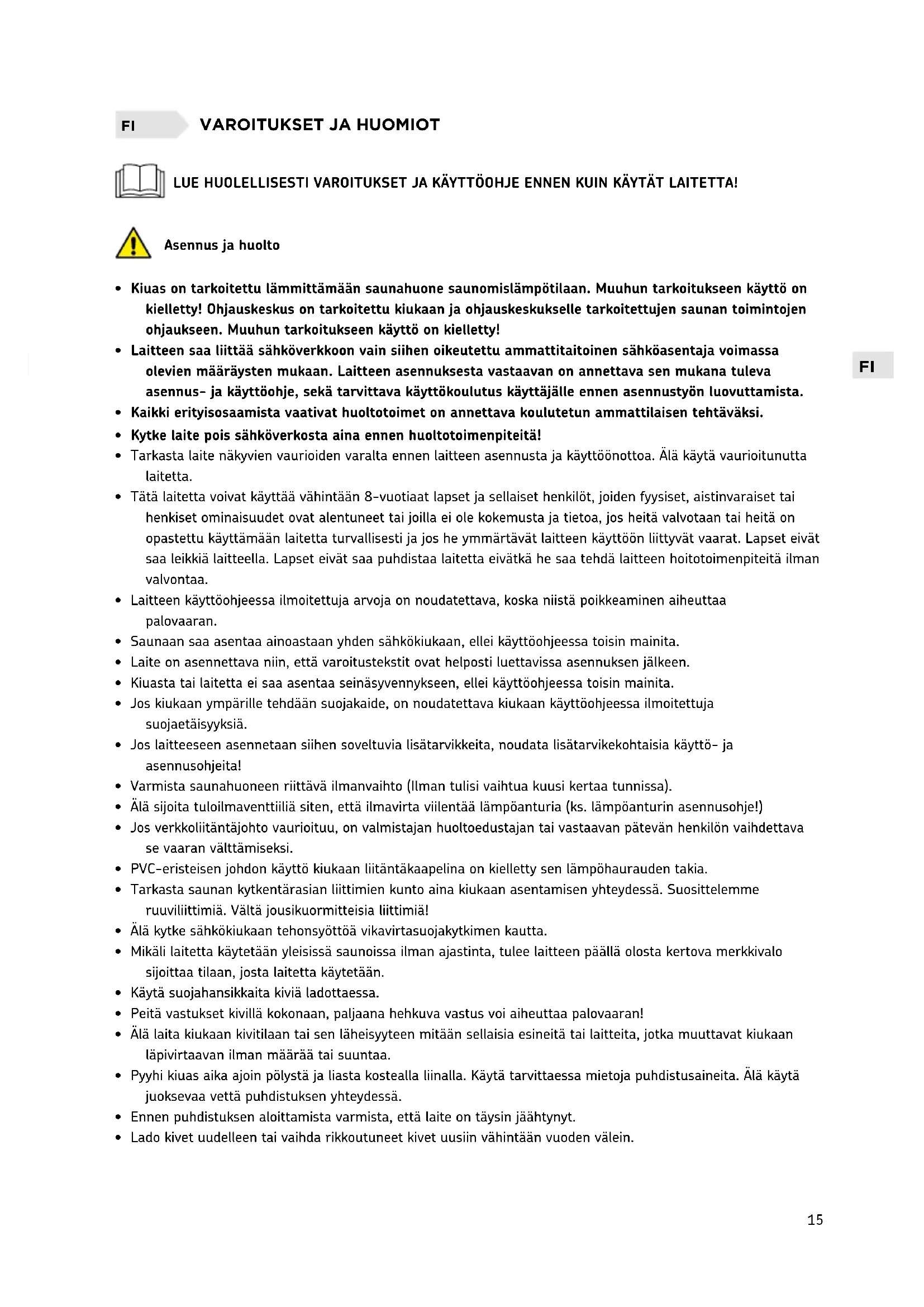 - Yleisissä saunoissa, joissa kiuasta käytetään ilman ajastinta tai yhtäjaksoisesti pidempiä aikoja kuin kiukaan tai ohjauslaitteen ajastin tehdasasetuksilla sallii, tulee laitetta valvoa jatkuvasti.