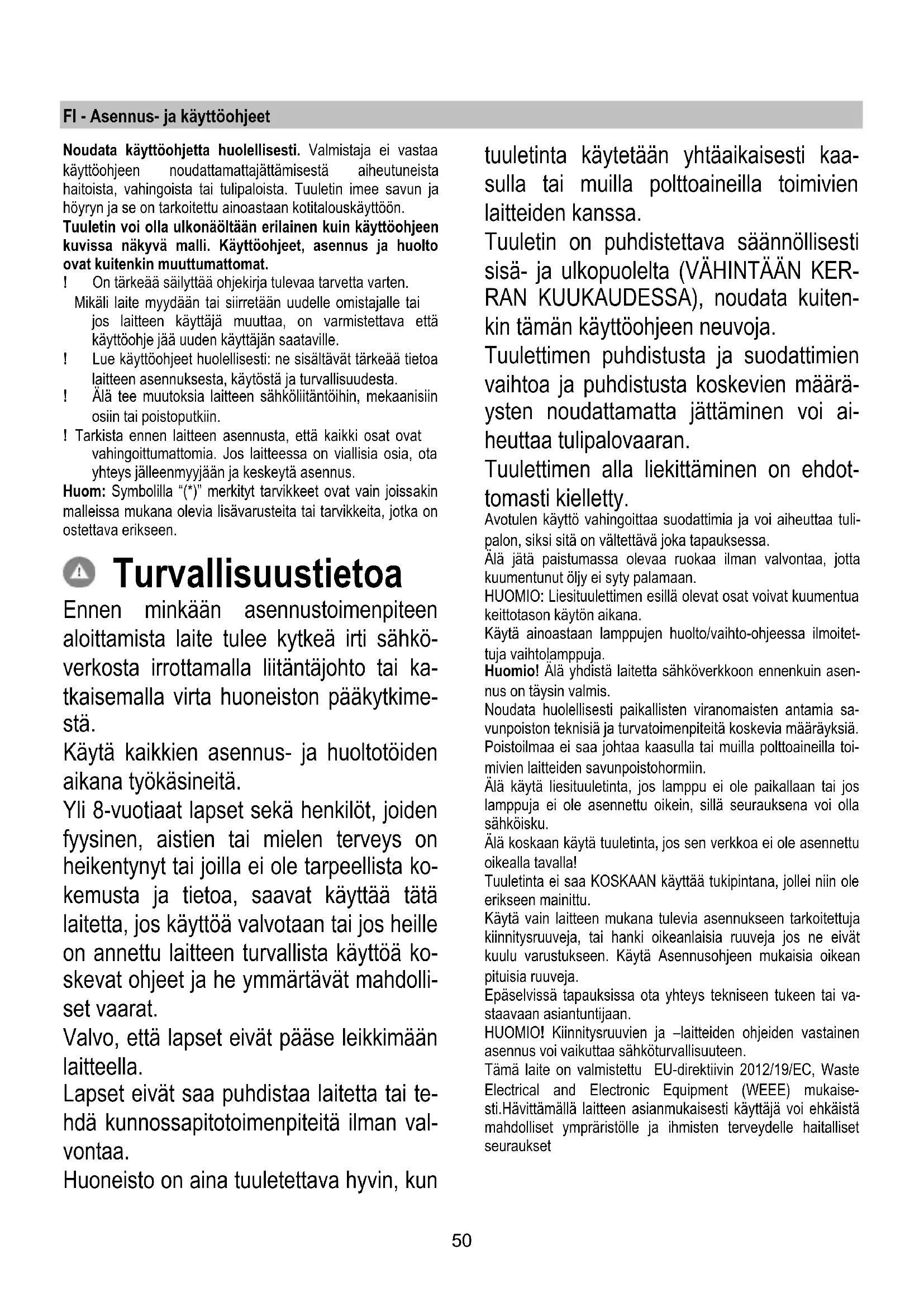 I det fall belysningen inte fungerar, kontrollera att lamporna är korrekt iskruvade i sitt säte innan ni kontaktar det tekniska servicekontoret.50 FI - Asennus- ja käyttöohjeet Noudata käyttöohjetta huolellisesti. Valmistaja ei vastaa käyttöohjeen noudattamattajättämisestä aiheutuneista haitoista, vahingoista tai tulipaloista. Tuuletin imee savun ja höyryn ja se on tarkoitettu ainoastaan kotitalouskäyttöön. Tuuletin voi olla ulkonäöltään erilainen kuin käyttöohjeen kuvissa näkyvä malli. Käyttöohjeet, asennus ja huolto ovat kuitenkin muuttumattomat. ! On tärkeää säilyttää ohjekirja tulevaa tarvetta varten. Mikäli laite myydään tai siirretään uudelle omistajalle tai jos laitteen käyttäjä muuttaa, on varmistettava että käyttöohje jää uuden käyttäjän saataville. ! Lue käyttöohjeet huolellisesti: ne sisältävät tärkeää tietoa laitteen asennuksesta, käytöstä ja turvallisuudesta. ! Älä tee muutoksia laitteen sähköliitäntöihin, mekaanisiin osiin tai poistoputkiin. ! Tarkista ennen laitteen asennusta, että kaikki osat ovat vahingoittumattomia. Jos laitteessa on viallisia osia, ota yhteys jälleenmyyjään ja keskeytä asennus. Huom: Symbolilla “(*)” merkityt tarvikkeet ovat vain joissakin malleissa mukana olevia lisävarusteita tai tarvikkeita, jotka on ostettava erikseen. Turvallisuustietoa Ennen minkään asennustoimenpiteen aloittamista laite tulee kytkeä irti sähkö- verkosta irrottamalla liitäntäjohto tai ka- tkaisemalla virta huoneiston pääkytkime- stä. Käytä kaikkien asennus- ja huoltotöiden aikana työkäsineitä. Yli 8-vuotiaat lapset sekä henkilöt, joiden fyysinen, aistien tai mielen terveys on heikentynyt tai joilla ei ole tarpeellista ko- kemusta ja tietoa, saavat käyttää tätä laitetta, jos käyttöä valvotaan tai jos heille on annettu laitteen turvallista käyttöä ko- skevat ohjeet ja he ymmärtävät mahdolli- set vaarat. Valvo, että lapset eivät pääse leikkimään laitteella. Lapset eivät saa puhdistaa laitetta tai te- hdä kunnossapitotoimenpiteitä ilman val- vontaa. Huoneisto on aina tuuletettava hyvin, kun tuuletinta käytetään yhtäaikaisesti kaa- sulla tai muilla polttoaineilla toimivien laitteiden kanssa. Tuuletin on puhdistettava säännöllisesti sisä- ja ulkopuolelta (VÄHINTÄÄN KER- RAN KUUKAUDESSA), noudata kuiten- kin tämän käyttöohjeen neuvoja. Tuulettimen puhdistusta ja suodattimien vaihtoa ja puhdistusta koskevien määrä- ysten noudattamatta jättäminen voi ai- heuttaa tulipalovaaran. Tuulettimen alla liekittäminen on ehdot- tomasti kielletty. Avotulen käyttö vahingoittaa suodattimia ja voi aiheuttaa tuli- palon, siksi sitä on vältettävä joka tapauksessa. Älä jätä paistumassa olevaa ruokaa ilman valvontaa, jotta kuumentunut öljy ei syty palamaan. HUOMIO: Liesituulettimen esillä olevat osat voivat kuumentua keittotason käytön aikana. Käytä ainoastaan lamppujen huolto/vaihto-ohjeessa ilmoitet- tuja vaihtolamppuja. Huomio! Älä yhdistä laitetta sähköverkkoon ennenkuin asen- nus on täysin valmis. Noudata huolellisesti paikallisten viranomaisten antamia sa- vunpoiston teknisiä ja turvatoimenpiteitä koskevia määräyksiä. Poistoilmaa ei saa johtaa kaasulla tai muilla polttoaineilla toi- mivien laitteiden savunpoistohormiin. Älä käytä liesituuletinta, jos lamppu ei ole paikallaan tai jos lamppuja ei ole asennettu oikein, sillä seurauksena voi olla sähköisku. Älä koskaan käytä tuuletinta, jos sen verkkoa ei ole asennettu oikealla tavalla! Tuuletinta ei saa KOSKAAN käyttää tukipintana, jollei niin ole erikseen mainittu. Käytä vain laitteen mukana tulevia asennukseen tarkoitettuja kiinnitysruuveja, tai hanki oikeanlaisia ruuveja jos ne eivät kuulu varustukseen. Käytä Asennusohjeen mukaisia oikean pituisia ruuveja. Epäselvissä tapauksissa ota yhteys tekniseen tukeen tai va- staavaan asiantuntijaan. HUOMIO! Kiinnitysruuvien ja –laitteiden ohjeiden vastainen asennus voi vaikuttaa sähköturvallisuuteen. Tämä laite on valmistettu EU-direktiivin 2012/19/EC, Waste Electrical and Electronic Equipment (WEEE) mukaise- sti.Hävittämällä laitteen asianmukaisesti käyttäjä voi ehkäistä mahdolliset ympräristölle ja ihmisten terveydelle haitalliset seuraukset51 Tuotteesta tai tuoteasiakirjoista löytyvä merkki ilmoit- taa, että tuotetta ei saa käsitellä talousjätteenä ja että se on toimitettava sähkö- ja elektronisten laitteiden kierrätyspistee- seen. Laite on hävitettävä paikallisten jätteenkäsittelysäännö- sten mukaisesti. Jos tarvitset lisätietoja laitteen käsittelystä, palautuksesta ja kierrätyksestä, ota yhteys paikalliseen vira- nomaiseen, jätehuoltoon tai liikkeeseen josta tuote on ostettu. Laitteisto suunniteltu, testattu ja valmistettu seuraavien standardien mukaisesti: