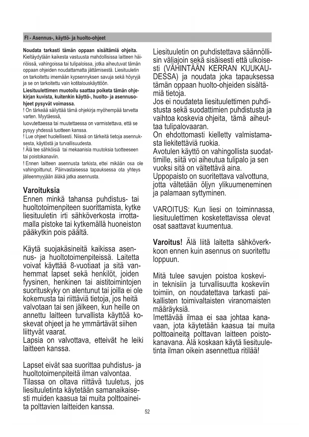 - Placera ut lådan i metall som innehåller de elektroniska komponenterna på ett område som är lättillgängligt för eventuella ingrepp från kundtjänstens sida och anslut även lådans elkontakter till äkten, (g.11).51 Drift För att produkten ska kunna fungera normalt behöver man öppna den ut- dragbara vagnen enligt följande. Skjut på glasrutan nedåt såsom det vi- sas i gur 12. Nu hakas glaset av och öppnas. När man väl har öppnat den utdragbara vagnen kan man aktivera äktmotorn genom att trycka på betjäningspanelen enligt nedan. Panelen stängs på motsvarande vis. Man behöver alltså trycka på den främ- re glasrutan tills vagnen har stängts helt. T1. T2. T3. Knapp ON/OFF för timer: tryck på knappen för att programmera den automatiska avstängningen: Hastighet 1: 20 minuter Hastighet 2: 15 minuter Hastighet 3: 10 minuter Intensiv hastighet: 5 minuter Knapp för fartminskning (effektminskning) hos själva utsugningen OFF 1: tryck på den här knappen era gånger för att minska på hastigheten tills äkten har stängts av. OFF 2: håll knappen intryckt länge oavsett hastighet. ON-knapp/knapp för fartökning (effektökning) hos själva uppsugningen (1-2-3-Intensiv). Intensivhastigheten varar i cirka 5 minuter. Därefter ställs hastighet 2 in automatiskt. Indikator för fulla lter Fläktkåpan anger när man behöver underhålla ltren: Fettlter (cirka var 40:e drifttimma): samtliga lysdioder är ljusblå. Odörlter med aktivt kol (cirka var 160:e drifttimma): samtliga lysdioder är ljusblå medan lysdiod L2 och L3 blin- kar. Återställning av fulla lter Efter att ha underhållit ltren ska man trycka länge på knapp T1 och T3. Nu kommer lysdioderna L1, L2 och L3 att blinka snabbt med ljusblått ljus innan de stängs av för gott. Aktivering av indikatorn för att odörltret med aktivt kol är fullt. Den här indikatorn är normalt avaktiverad. För att aktivera den går man tillväga på följande sätt: Med äkten avstängd trycker man och håller knapparna T1 och T2 intryckta länge och samtidigt: först tänds L1 och sedan även L2 och L3. I samband med att knapparna släpps upp blinkar sedan lysdioderna L2 och L3 snabbt för att indikera att aktiveringen är utförd. Inaktivering av lysdiod för fulla kollter: upprepa arbets- momentet som beskrivs ovan. Först tänds samtidigt lysdio- derna L1, L2 och L3. Sedan släcks lysdioderna L2 och L3 i samband med att knapparna släpps upp som en indikation på att inaktiveringen är utförd. UNDERHÅLL Fettlter Fångar upp fettpartiklar som uppkommit under tillagningen. Fettltret ska rengöras en gång i månaden (eller när sy- stemet för indikation om fulla lter - om något sådant har förutsetts för innehavd modell - anger att behovet nns), manuellt med icke frätande rengöringsmedel eller i diskma- skin vid låga temperaturer och med ett snabbt diskprogram. Vid diskning i diskmaskin kan fettltret i metall tappa färg. Filtrets ltreringsegenskaper påverkas dock absolut inte. Aktivt kollter (gäller enbart för versionen med återcirkule- ring). Filtret fångar upp obehaglig lukt som uppkommer när man lagar mat. Kolltret fylls efter att det har använts under en längre tid och beroende på kökstypen och på hur ofta fettltret i sin tur har rengjorts. Hur som helst så behöver man byta ut lterpatronen minst var fjärde månad. Efter att ha plockar bort fettltren kan man lägga in kolltren (Fig. 8).52 FI - Asennus-, käyttö- ja huolto-ohjeet Noudata tarkasti tämän oppaan sisältämiä ohjeita. Kieltäydytään kaikesta vastuusta mahdollisissa laitteen häi- riöissä, vahingoissa tai tulipaloissa, jotka aiheutuvat tämän oppaan ohjeiden noudattamatta jättämisestä. Liesituuletin on tarkoitettu imemään kypsennyksen savuja sekä höyryjä ja se on tarkoitettu vain kotitalouskäyttöön. Liesituulettimen muotoilu saattaa poiketa tämän ohje- kirjan kuvista, kuitenkin käyttö-, huolto- ja asennuso- hjeet pysyvät voimassa. ! On tärkeää säilyttää tämä ohjekirja myöhempää tarvetta varten. Myytäessä, luovutettaessa tai muutettaessa on varmistettava, että se pysyy yhdessä tuotteen kanssa. ! Lue ohjeet huolellisesti. Niissä on tärkeitä tietoja asennuk- sesta, käytöstä ja turvallisuudesta. ! Älä tee sähköisiä tai mekaanisia muutoksia tuotteeseen tai poistokanaviin. ! Ennen laitteen asennusta tarkista, ettei mikään osa ole vahingoittunut. Päinvastaisessa tapauksessa ota yhteys jälleenmyyjään äläkä jatka asennusta. Varoituksia Ennen minkä tahansa puhdistus- tai huoltotoimenpiteen suorittamista, kytke liesituuletin irti sähköverkosta irrotta- malla pistoke tai kytkemällä huoneiston pääkytkin pois päältä. Käytä suojakäsineitä kaikissa asen- nus- ja huoltotoimenpiteissä. Laitetta voivat käyttää 8-vuotiaat ja sitä van- hemmat lapset sekä henkilöt, joiden fyysinen, henkinen tai aistitoimintojen suorituskyky on alentunut tai joilla ei ole kokemusta tai riittäviä tietoja, jos heitä valvotaan tai sen jälkeen, kun heille on annettu laitteen turvallista käyttöä ko- skevat ohjeet ja he ymmärtävät siihen liittyvät vaarat. Lapsia on valvottava, etteivät he leiki laitteen kanssa. Lapset eivät saa suorittaa puhdistus- ja huoltotoimenpiteitä ilman valvontaa. Tilassa on oltava riittävä tuuletus, jos liesituuletinta käytetään samanaikaise- sti muiden kaasua tai muita polttoainei- ta polttavien laitteiden kanssa. Liesituuletin on puhdistettava säännölli- sin väliajoin sekä sisäisesti että ulkoise- sti (VÄHINTÄÄN KERRAN KUUKAU- DESSA) ja noudata joka tapauksessa tämän oppaan huolto-ohjeiden sisältä- miä tietoja. Jos ei noudateta liesituulettimen puhdi- stusta sekä suodattimien puhdistusta ja vaihtoa koskevia ohjeita, tämä aiheut- taa tulipalovaaran. On ehdottomasti kielletty valmistama- sta liekitettäviä ruokia. Avotulen käyttö on vahingollista suodat- timille, siitä voi aiheutua tulipalo ja sen vuoksi sitä on vältettävä ain
