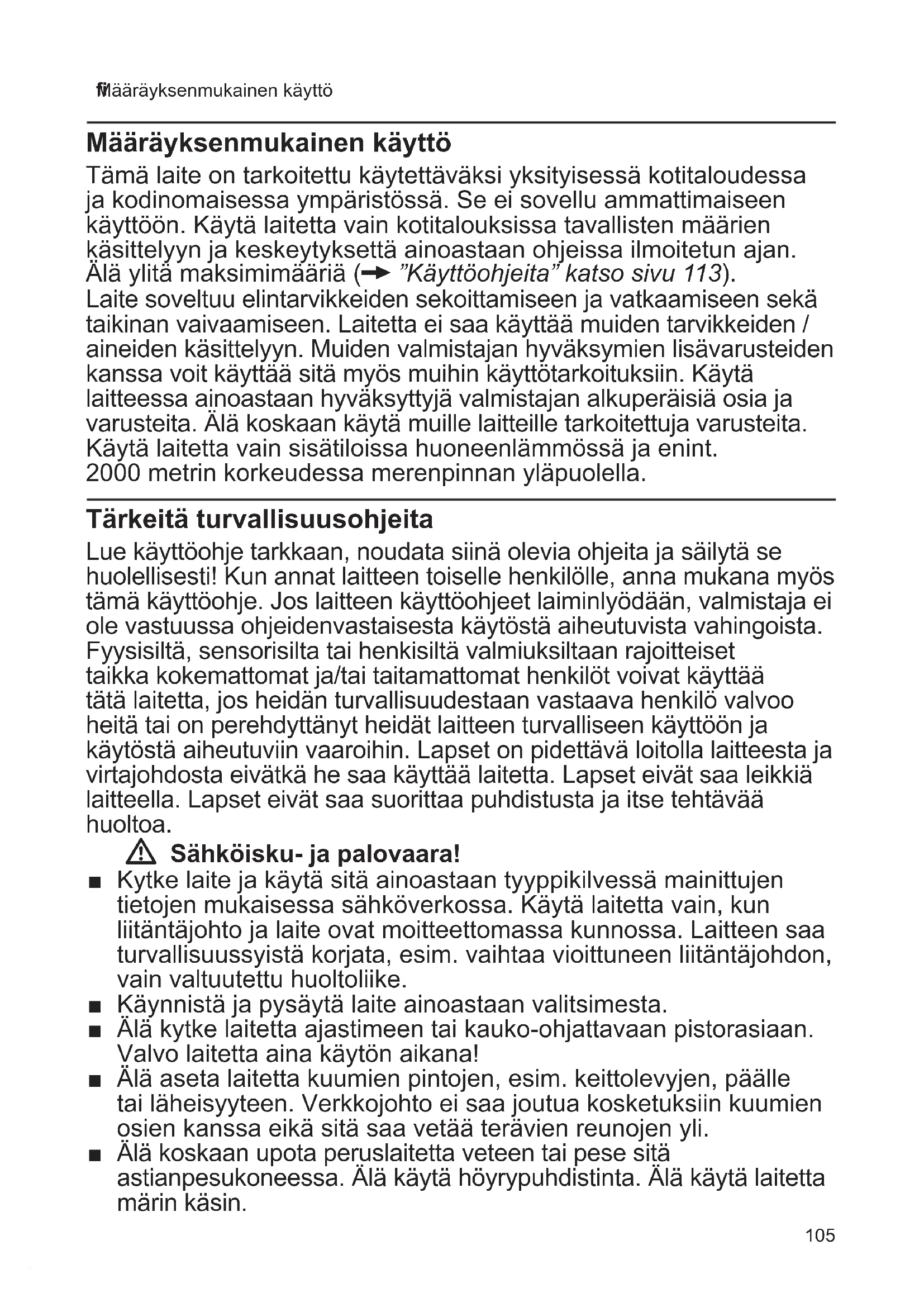Määräyksenmukainen käyttö Määräyksenmukainen käyttö Tämä laite on tarkoitettu käytettäväksi yksityisessä kotitaloudessa ja kodinomaisessa ympäristössä. Se ei sovellu ammattimaiseen käyttöön. Käytä laitetta vain kotitalouksissa tavallisten määrien käsittelyyn ja keskeytyksettä ainoastaan ohjeissa ilmoitetun ajan. Älä ylitä maksimimääriä (X ”Käyttöohjeita” katso sivu 113). Laite soveltuu elintarvikkeiden sekoittamiseen ja vatkaamiseen sekä taikinan vaivaamiseen. Laitetta ei saa käyttää muiden tarvikkeiden / aineiden käsittelyyn. Muiden valmistajan hyväksymien lisävarusteiden kanssa voit käyttää sitä myös muihin käyttötarkoituksiin. Käytä laitteessa ainoastaan hyväksyttyjä valmistajan alkuperäisiä osia ja varusteita. Älä koskaan käytä muille laitteille tarkoitettuja varusteita. Käytä laitetta vain sisätiloissa huoneenlämmössä ja enint. 2000 metrin korkeudessa merenpinnan yläpuolella. Tärkeitä turvallisuusohjeita Lue käyttöohje tarkkaan, noudata siinä olevia ohjeita ja säilytä se huolellisesti! Kun annat laitteen toiselle henkilölle, anna mukana myös tämä käyttöohje. Jos laitteen käyttöohjeet laiminlyödään, valmistaja ei ole vastuussa ohjeidenvastaisesta käytöstä aiheutuvista vahingoista. Fyysisiltä, sensorisilta tai henkisiltä valmiuksiltaan rajoitteiset taikka kokemattomat ja/tai taitamattomat henkilöt voivat käyttää tätä laitetta, jos heidän turvallisuudestaan vastaava henkilö valvoo heitä tai on perehdyttänyt heidät laitteen turvalliseen käyttöön ja käytöstä aiheutuviin vaaroihin. Lapset on pidettävä loitolla laitteesta ja virtajohdosta eivätkä he saa käyttää laitetta. Lapset eivät saa leikkiä laitteella. Lapset eivät saa suorittaa puhdistusta ja itse tehtävää huoltoa. W Sähköisku- ja palovaara! ■ Kytke laite ja käytä sitä ainoastaan tyyppikilvessä mainittujen tietojen mukaisessa sähköverkossa. Käytä laitetta vain, kun liitäntäjohto ja laite ovat moitteettomassa kunnossa. Laitteen saa turvallisuussyistä korjata, esim. vaihtaa vioittuneen liitäntäjohdon, vain valtuutettu huoltoliike. ■ Käynnistä ja pysäytä laite ainoastaan valitsimesta. ■ Älä kytke laitetta ajastimeen tai kauko-ohjattavaan pistorasiaan. Valvo laitetta aina käytön aikana! ■ Älä aseta laitetta kuumien pintojen, esim. keittolevyjen, päälle tai läheisyyteen. Verkkojohto ei saa joutua kosketuksiin kuumien osien kanssa eikä sitä saa vetää terävien reunojen yli. ■ Älä koskaan upota peruslaitetta veteen tai pese sitä astianpesukoneessa. Älä käytä höyrypuhdistinta. Älä käytä laitetta märin käsin.106 fi Tärkeitä turvallisuusohjeita ■ Laite on irrotettava verkkovirrasta aina, kun sen käyttö lopetetaan, sitä ei voida valvoa, ennen sen kokoamista, purkamista tai puhdistusta sekä häiriötilanteissa. W Loukkaantumisvaara! ■ Katkaise laitteesta virta ja irrota se verkkovirrasta, ennen kuin vaihdat varusteita tai lisäosia, jotka liikkuvat laitteen ollessa toiminnassa. Kone käy vielä jonkin aikaa pysäyttämisen jälkeen. Odota, että kone pysähtyy kokonaan. ■ Älä muuta varren asentoa laitteen virran ollessa kytkettynä. ■ Käytä välineitä vain, kun kulho, kansi ja käyttöliitäntöjen suojakannet ovat paikoillaan! Kun käytät lisävarusteita, kiinnitä kulho, kansi ja käyttöliitäntöjen suojakannet ohjeiden mukaisesti! ■ Älä koske kulhon tai täyttösuppilon sisälle koneen ollessa toiminnassa. Älä työnnä kulhoon tai täyttöaukkoon esineitä (esim. lastaa). Pidä kädet, hiukset, vaatteet tms. loitolla pyörivistä osista. ■ Älä käytä koskaan samanaikaisesti koneen omia tarvikkeita ja lisävarustetta tai 2 lisävarustetta. Kun käytät lisävarusteita, noudata sekä tätä ohjetta että varusteiden mukana toimitettavia käyttöohjeita. ■ Käytä varustetta vain, kun sen kaikki osat ovat paikoilleen kiinnitettyinä. Kokoa varuste aina ennen kuin asennat sen laitteen runkoon. Käytä varustetta vain sille tarkoitetussa käyttöasennossa. ■ Älä koske hienonnusterien teräviin teriin tai syrjiin. Tartu hienonnusteriin vain terän reunasta! ■ Älä koske tehosekoittimen terään paljain käsin. ■ Älä koske paikalleen kiinnitetyn tehosekoittimen sisälle! Älä koskaan käytä tehosekoitinta ilman kantta. ■ Ole varovainen käsitellessäsi teräviä teriä, tyhjentäessäsi astiaa ja puhdistaessasi laitetta. W Polttamisvaara! Kannessa olevan suppilon kautta tulee ulos höyryä sekoitettaessa kuumia aineksia. Täytä tehosekoittimeen kuumaa tai kuohuvaa nestettä enintään 0,5 litraa. W Tukehtumisvaara! Älä anna lasten leikkiä pakkausmateriaalilla. W Huomio! Älä jätä laitetta käyntiin pidemmäksi aikaa kuin mitä tarvitset elintarvikkeiden käsittelyyn. Älä käytä laitetta tyhjäkäynnillä. W Tärkeää! Laite on ehdottomasti puhdistettava huolellisesti jokaisen käytön jälkeen tai kun sitä ei ole käytetty pitkään aikaan (X ”Puhdistus ja hoito” katso sivu 112).107