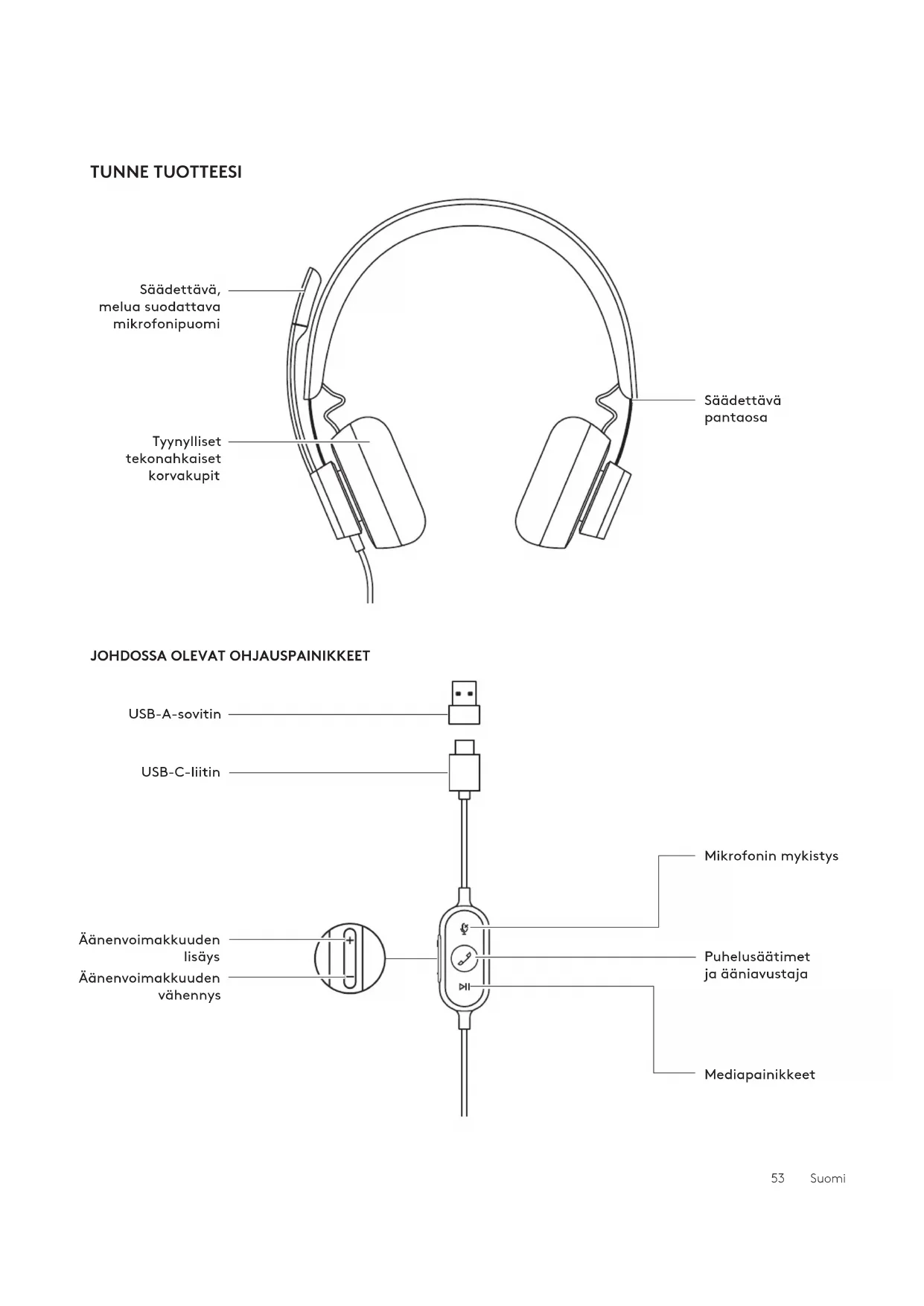 Mikrofonin mykistys Puhelusäätimet jaääniavustaja Äänenvoimakkuuden lisäys Äänenvoimakkuuden vähennys USB-C-liitin USB-A-sovitin Mediapainikkeet 53 SuomiUSB-A USB-C