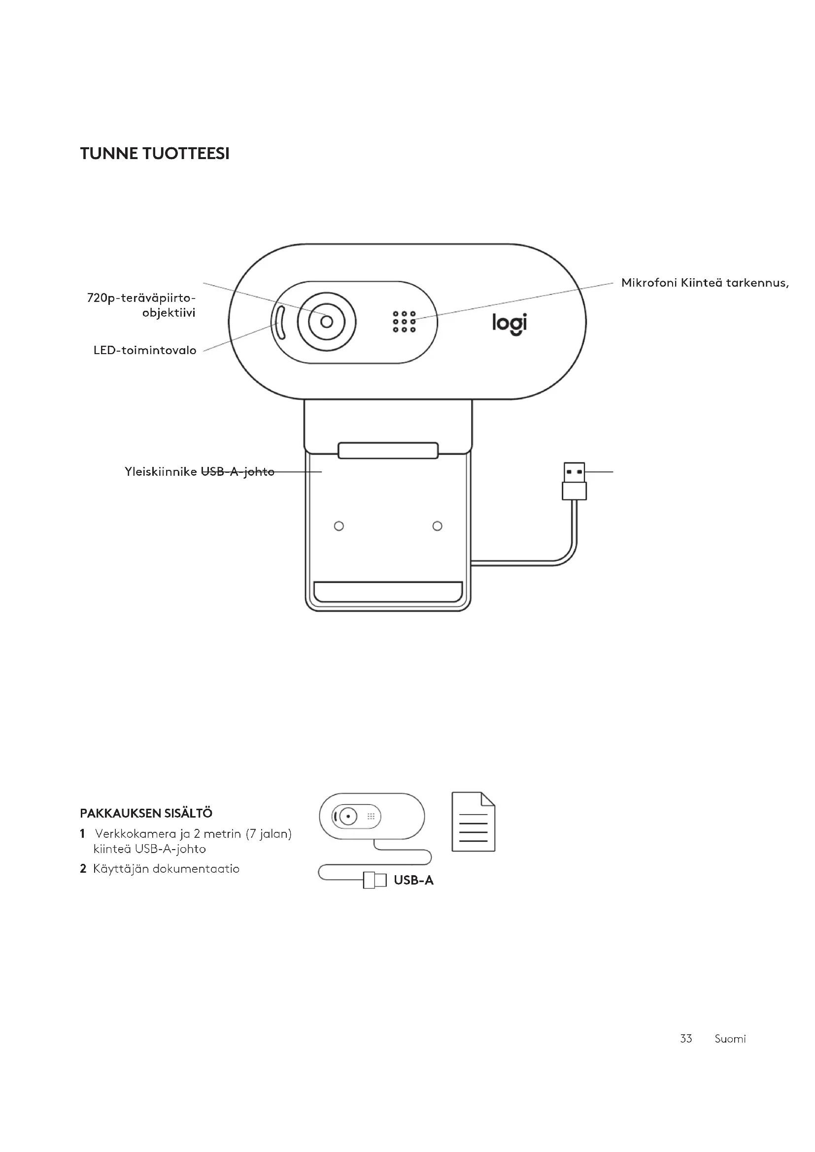 1 Verkkokamera ja 2 metrin (7 jalan) kiinteä USB-A-johto 2 Käyttäjän dokumentaatio 33 SuomiVERKKOKAMERAN KÄYTTÖÖNOTTO 1 Aseta verkkokamera tietokoneen, kannettavan tai näytön päälle valitsemaasi asentoon tai kulmaan.