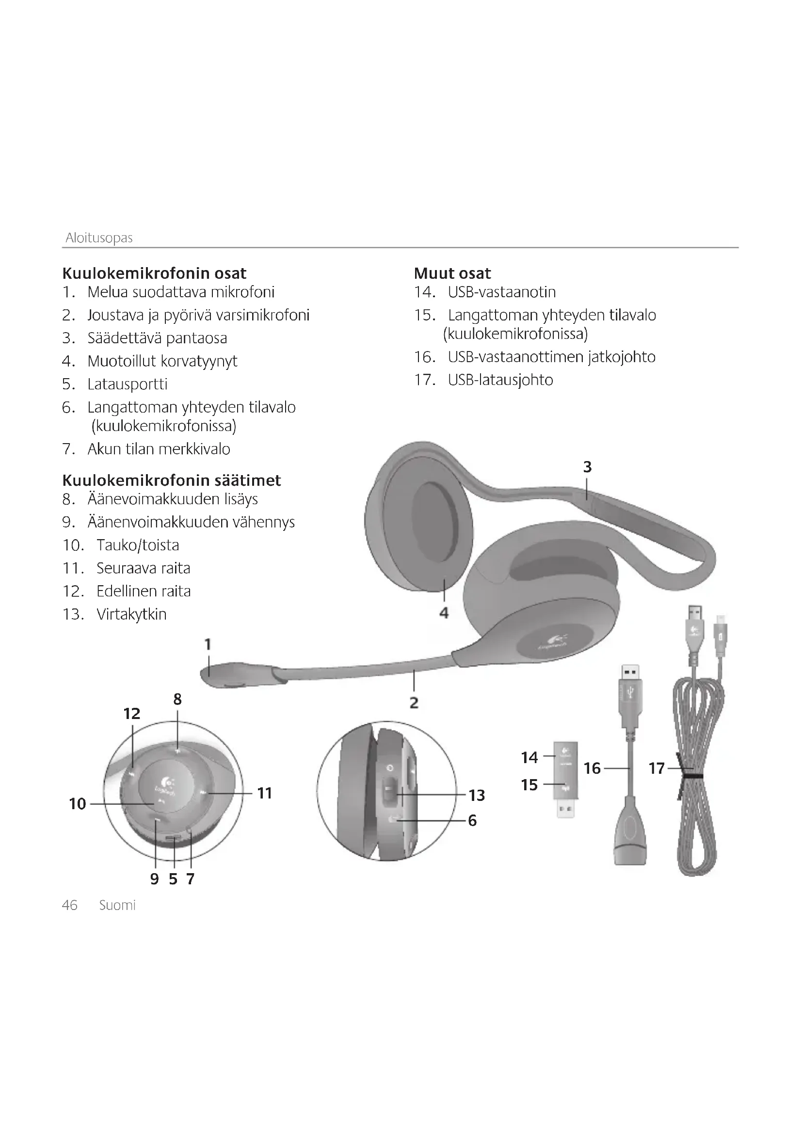 WirelessHeadsetH760 Vinkkejäasennukseen Eiköäänikuuluoikein?Eiköääntäkuulu ollenkaan? SiirräkuulokemikrofoniUSB-vastaanottimen• kantoalueelle.Langattomanyhteydentilavalo palaavihreänä,kunmolemmatlaitteet ovatkantoalueensisällä.Katsovinkkejä vastaanottimensijoittamiseenkohdasta Langattomanyhteydensuorituskyky. Asetakuulokemikrofoniaktiiviseksiäänilaitteeksi• sovelluksessajaWindowsinOhjauspaneelissatai MacOSX:nJärjestelmäasetuksissa. Säädääänenvoimakkuuttajamikrofonin• asetuksiakäyttöjärjestelmässäjasovelluksessa niin,ettääänikuuluu. Suljemediasovellusjakäynnistäseuudelleen.• Joskäytössäonvirratonkeskitin,kokeilekiinnittää• USB-vastaanotin(taivastaanottimenjatkojohto) suoraantietokoneeseen. Eikökuulokemikrofonilataudu? Joskuulokemikrofonissaolevaakuntilavaloeiole• oranssi(jokovilkkuvataijatkuva)silloin,kunse onkiinnitettynätietokoneeseenmukanatulleella USB-latausjohdolla,kuulokemikrofonieisaavirtaa tietokoneenUSB-portista.KokeiletoistaUSB- porttiajakäynnistätaiherätätietokone,jottavoit ladatakuulokemikrofonin. Eivätkömusiikinsäätimettoimi? Musiikinsäätimiäeituetamuissasovelluksissa• kuiniTunesissajaWindowsMediaPlayerissä. Windowsinkäyttäjätvoivatladata• valinnaisenohjelmistonpäivityksen, jollamusiikinsäätimetsaadaantoimimaan, osoitteestawww.logitech.com/support. Saatlisäävinkkejävianetsintäänosoitteestawww.logitech.com Eisuositella Suositellaan Pöytäkoneentaakse Pöytäkoneeneteen KiinnitettynäytöntainäppäimistönUSB-porttiin Toisenvastaanottimenviereen(kannettavat) Jatkojohtoon,kunvieressätoinenvastaanotin AllemetrinetäisyydelleWi-Fi-reitittimestä Langattomanyhteydensuorituskyky50 Ελληνικά Γνωριμία με τη συσκευή