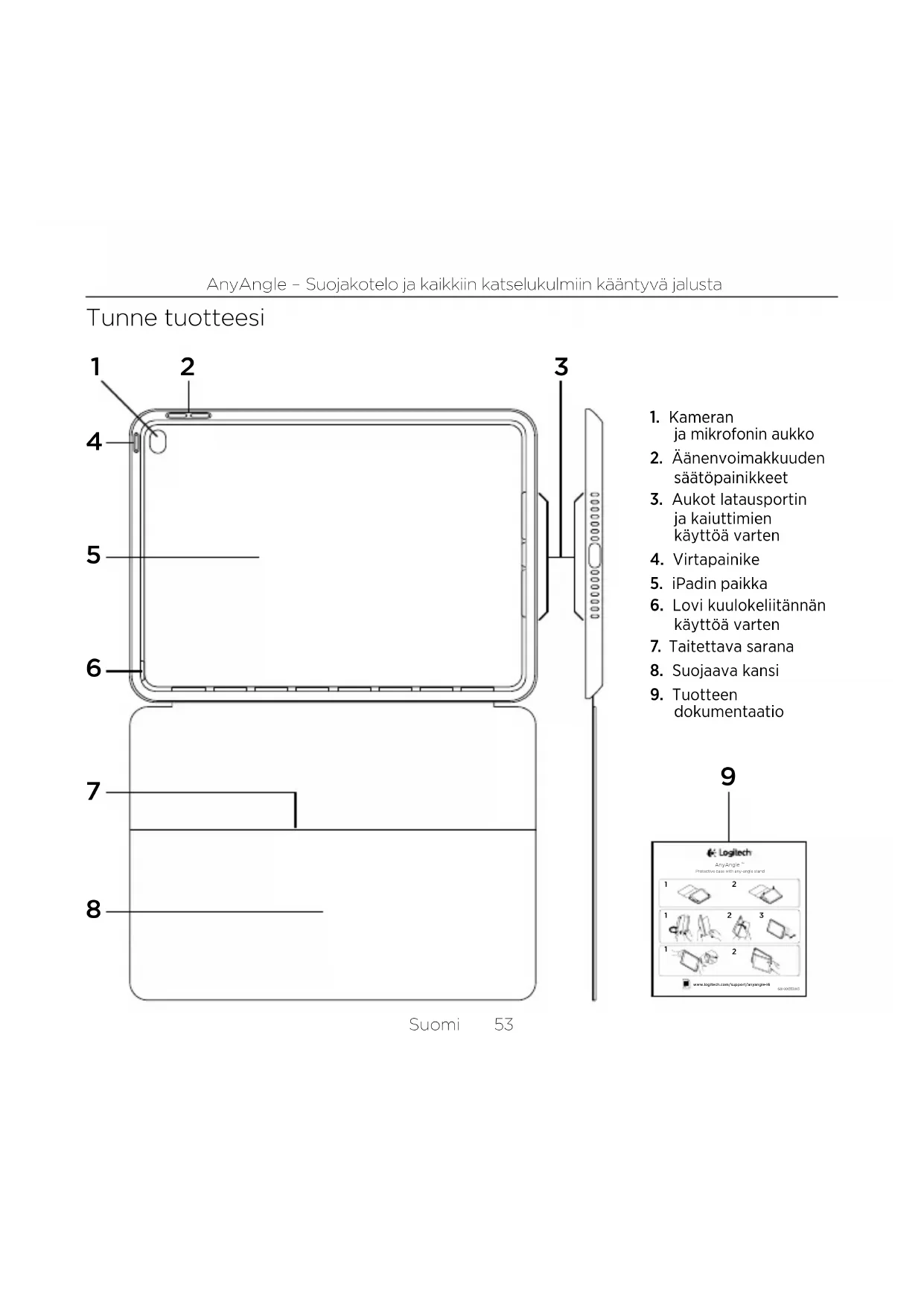 dokumentaatio54 Suomi AnyAngle – Suojakotelo ja kaikkiin katselukulmiin kääntyvä jalusta Suojakotelon käyttöönotto ja käyttäminen iPadin kanssa Suojakotelon käyttöönotto