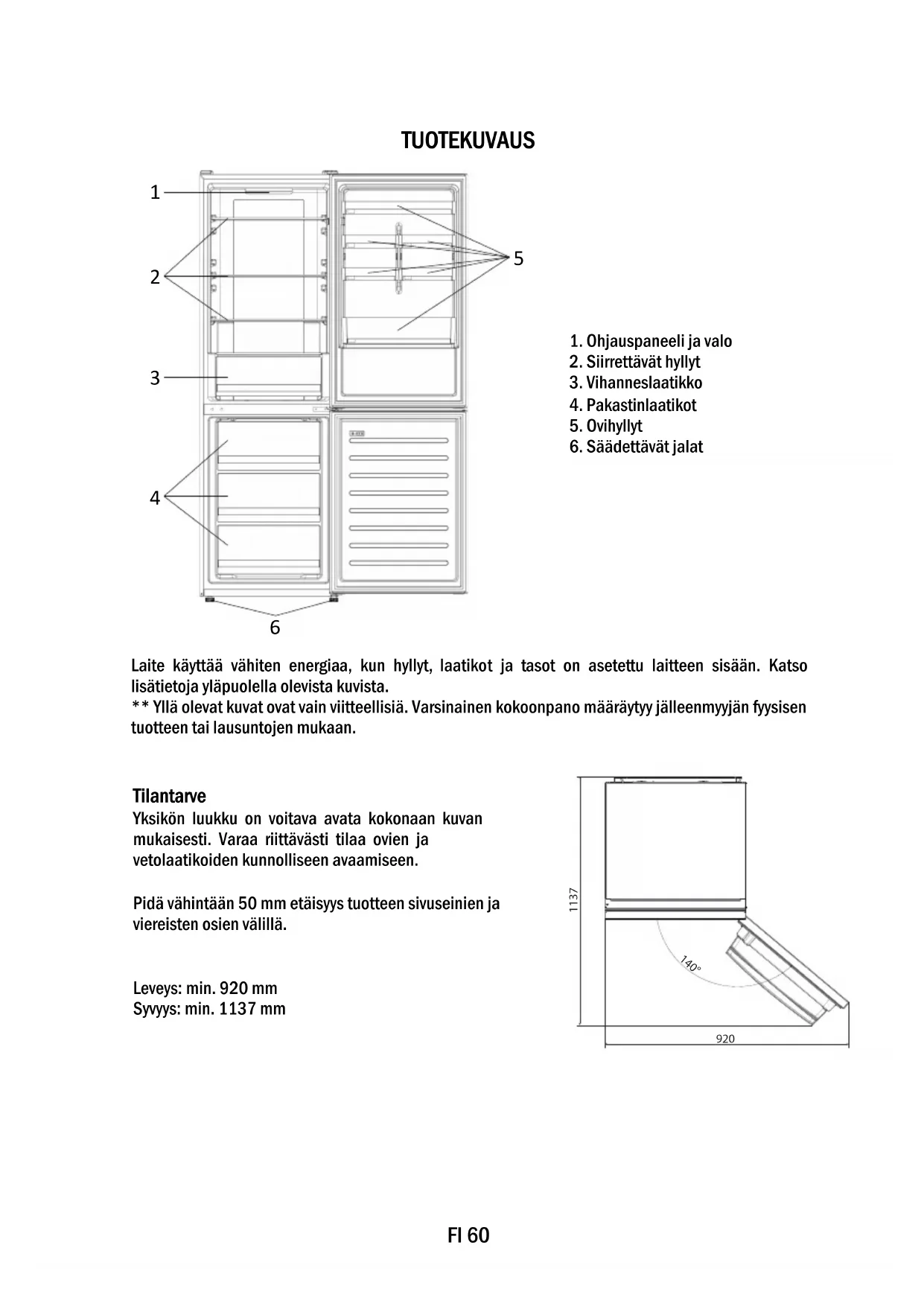 Laite käyttää vähiten energiaa, kun hyllyt, laatikot ja tasot on asetettu laitteen sisään. Katso lisätietoja yläpuolella olevista kuvista. ** Yllä olevat kuvat ovat vain viitteellisiä. Varsinainen kokoonpano määräytyy jälleenmyyjän fyysisen tuotteen tai lausuntojen mukaan. Tilantarve Yksikön luukku on voitava avata kokonaan kuvan mukaisesti. Varaa riittävästi tilaa ovien ja vetolaatikoiden kunnolliseen avaamiseen. Pidä vähintään 50 mm etäisyys tuotteen sivuseinien ja viereisten osien välillä. Leveys: min. 920 mm Syvyys: min. 1137 mm