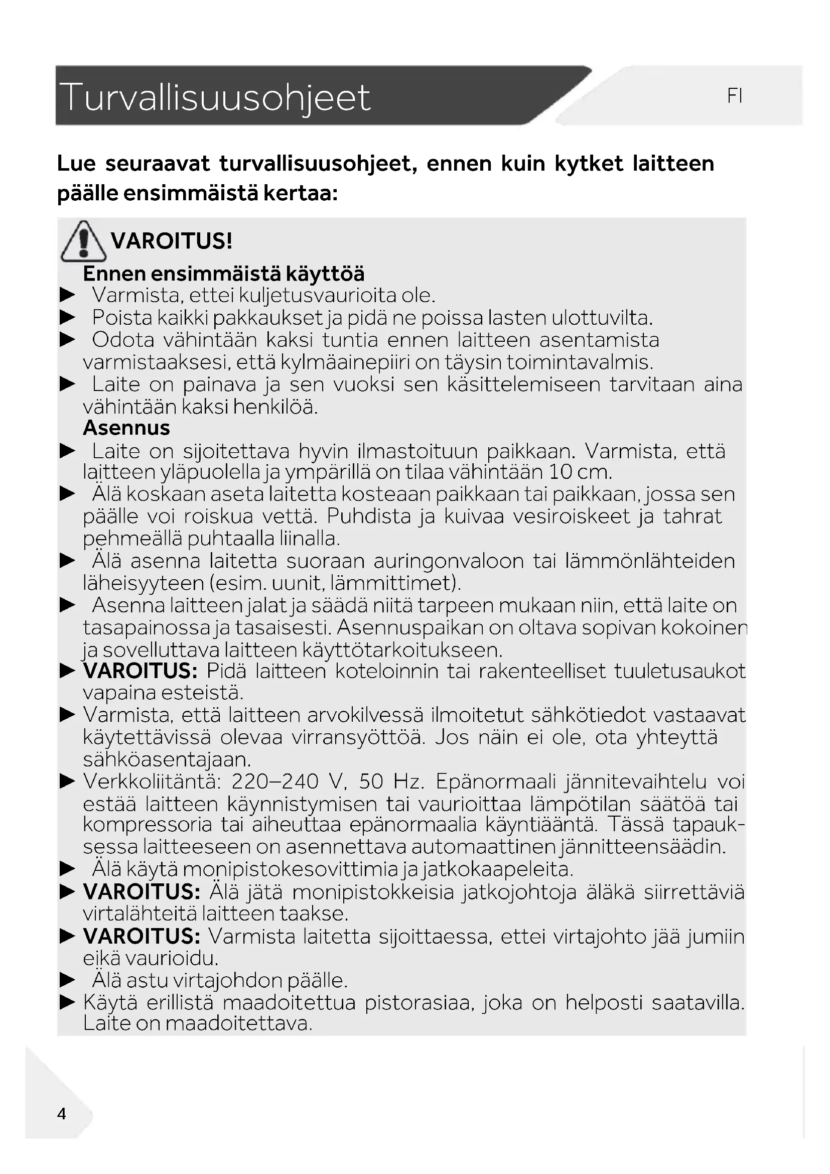 Turvallisuusohjeet Lue seuraavat turvallisuusohjeet, ennen kuin kytket laitteen päälle ensimmäistä kertaa: VAROITUS! Ennen ensimmäistä käyttöä ► Varmista, ettei kuljetusvaurioita ole. ► Poista kaikki pakkaukset ja pidä ne poissa lasten ulottuvilta. ► Odota vähintään kaksi tuntia ennen laitteen asentamista varmistaaksesi, että kylmäainepiiri on täysin toimintavalmis. ► Laite on painava ja sen vuoksi sen käsittelemiseen tarvitaan aina vähintään kaksi henkilöä. Asennus ► Laite on sijoitettava hyvin ilmastoituun paikkaan. Varmista, että laitteen yläpuolella ja ympärillä on tilaa vähintään 10 cm. ► Älä koskaan aseta laitetta kosteaan paikkaan tai paikkaan, jossa sen päälle voi roiskua vettä. Puhdista ja kuivaa vesiroiskeet ja tahrat pehmeällä puhtaalla liinalla. ► Älä asenna laitetta suoraan auringonvaloon tai lämmönlähteiden läheisyyteen (esim. uunit, lämmittimet). ► Asenna laitteen jalat ja säädä niitä tarpeen mukaan niin, että laite on tasapainossa ja tasaisesti. Asennuspaikan on oltava sopivan kokoinen ja sovelluttava laitteen käyttötarkoitukseen. ► VAROITUS: Pidä laitteen koteloinnin tai rakenteelliset tuuletusaukot vapaina esteistä. ► Varmista, että laitteen arvokilvessä ilmoitetut sähkötiedot vastaavat käytettävissä olevaa virransyöttöä. Jos näin ei ole, ota yhteyttä sähköasentajaan. ► Verkkoliitäntä: 220–240 V, 50 Hz. Epänormaali jännitevaihtelu voi estää laitteen käynnistymisen tai vaurioittaa lämpötilan säätöä tai kompressoria tai aiheuttaa epänormaalia käyntiääntä. Tässä tapauk- sessa laitteeseen on asennettava automaattinen jännitteensäädin. ► Älä käytä monipistokesovittimia ja jatkokaapeleita. ► VAROITUS: Älä jätä monipistokkeisia jatkojohtoja äläkä siirrettäviä virtalähteitä laitteen taakse. ► VAROITUS: Varmista laitetta sijoittaessa, ettei virtajohto jää jumiin eikä vaurioidu. ► Älä astu virtajohdon päälle. ► Käytä erillistä maadoitettua pistorasiaa, joka on helposti saatavilla. Laite on maadoitettava.FI Turvallisuusohjeet