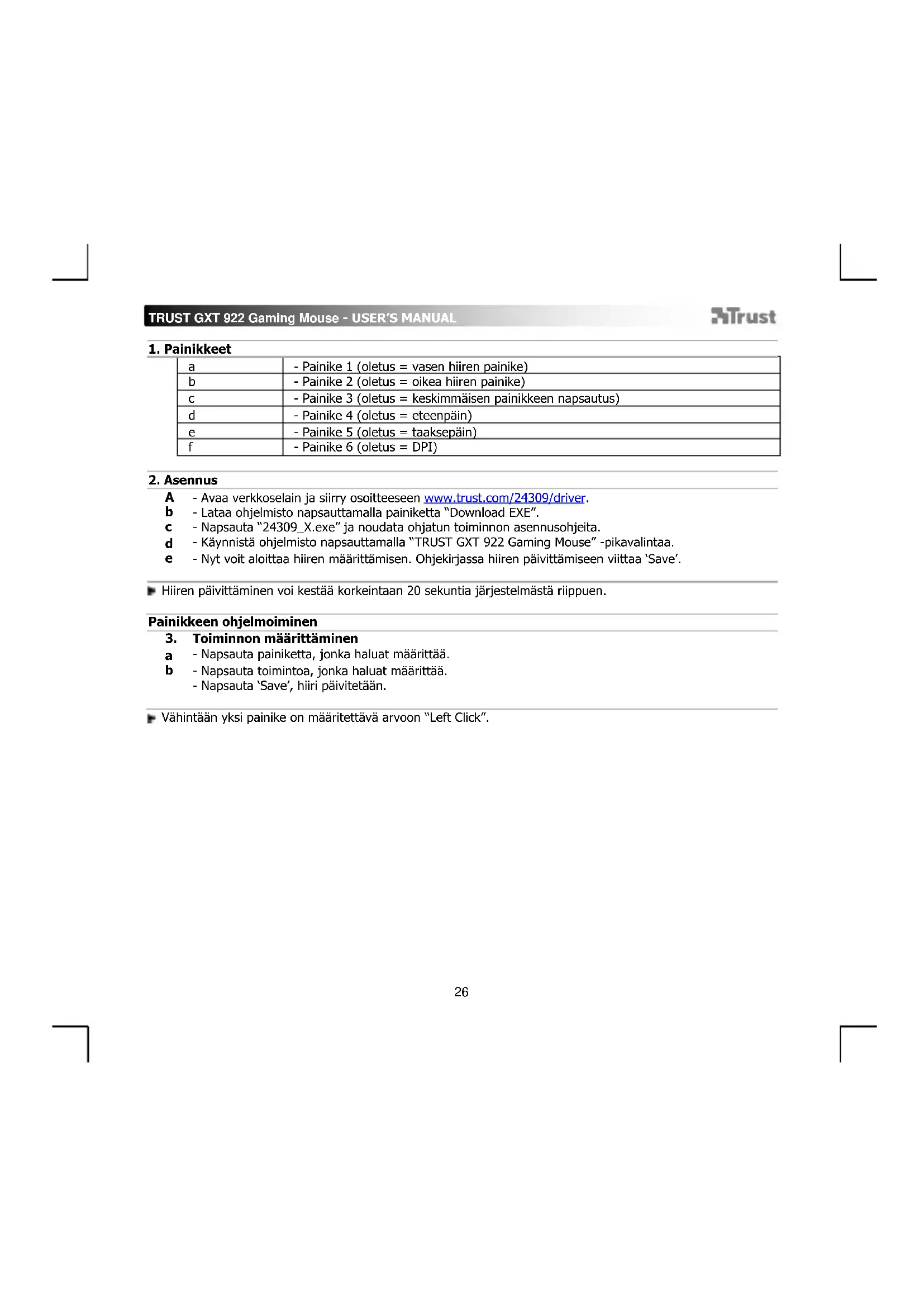 Jos ongelma ei ratkea, ota yhteyttä asiakastukeen osoitteessa www.trust.com/24309/faq.TRUST GXT 922 Gaming Mouse - USER’S MANUAL