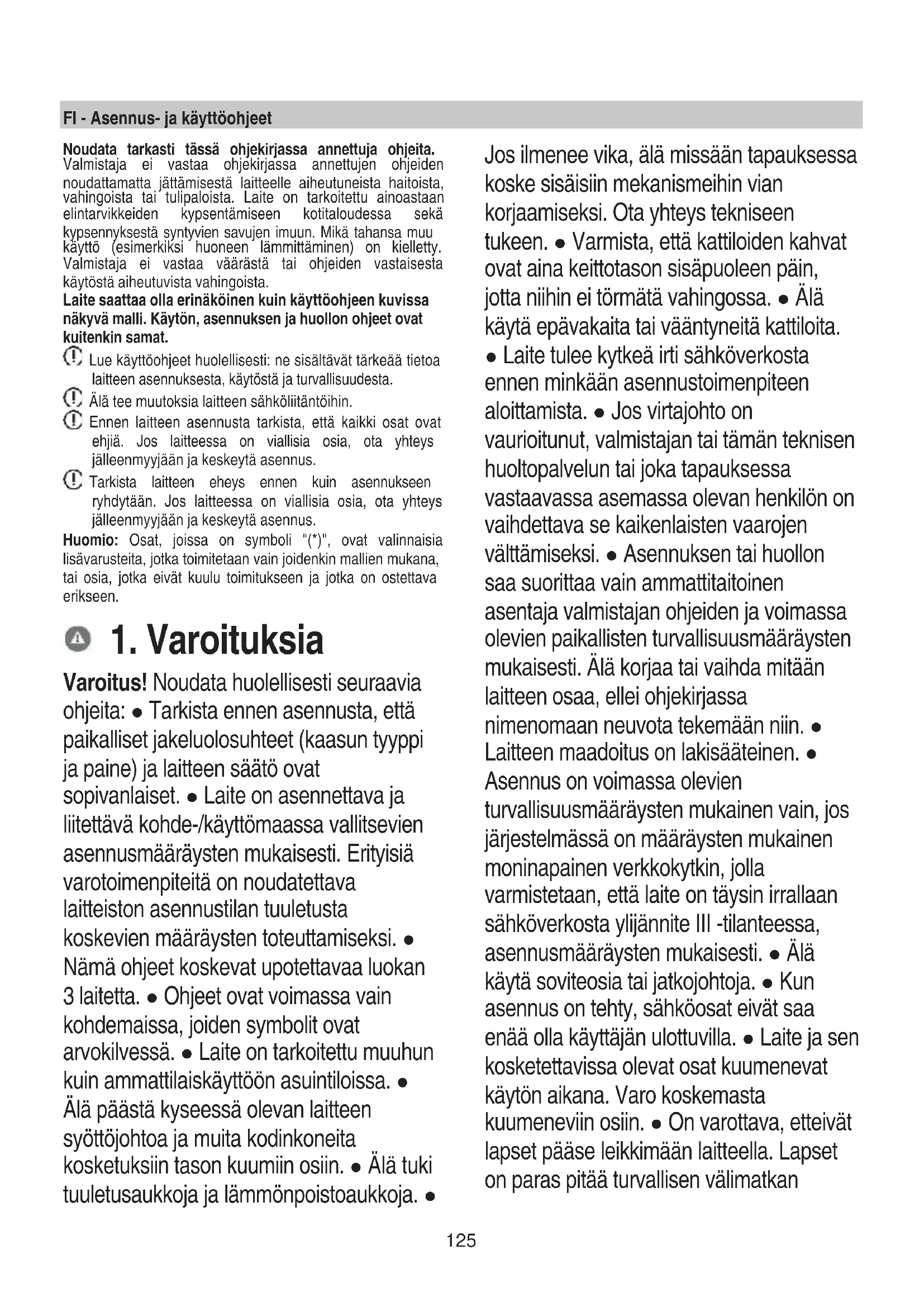 Varoitus! Noudata huolellisesti seuraavia ohjeita: ● Tarkista ennen asennusta, että paikalliset jakeluolosuhteet (kaasun tyyppi ja paine) ja laitteen säätö ovat sopivanlaiset. ● Laite on asennettava ja liitettävä kohde-/käyttömaassa vallitsevien asennusmääräysten mukaisesti. Erityisiä varotoimenpiteitä on noudatettava laitteiston asennustilan tuuletusta koskevien määräysten toteuttamiseksi. ● Nämä ohjeet koskevat upotettavaa luokan 3 laitetta. ● Ohjeet ovat voimassa vain kohdemaissa, joiden symbolit ovat arvokilvessä. ● Laite on tarkoitettu muuhun kuin ammattilaiskäyttöön asuintiloissa. ● Älä päästä kyseessä olevan laitteen syöttöjohtoa ja muita kodinkoneita kosketuksiin tason kuumiin osiin. ● Älä tuki tuuletusaukkoja ja lämmönpoistoaukkoja. ● Jos ilmenee vika, älä missään tapauksessa koske sisäisiin mekanismeihin vian korjaamiseksi. Ota yhteys tekniseen tukeen. ● Varmista, että kattiloiden kahvat ovat aina keittotason sisäpuoleen päin, jotta niihin ei törmätä vahingossa. ● Älä käytä epävakaita tai vääntyneitä kattiloita. ● Laite tulee kytkeä irti sähköverkosta ennen minkään asennustoimenpiteen aloittamista. ● Jos virtajohto on vaurioitunut, valmistajan tai tämän teknisen huoltopalvelun tai joka tapauksessa vastaavassa asemassa olevan henkilön on vaihdettava se kaikenlaisten vaarojen välttämiseksi. ● Asennuksen tai huollon saa suorittaa vain ammattitaitoinen asentaja valmistajan ohjeiden ja voimassa olevien paikallisten turvallisuusmääräysten mukaisesti. Älä korjaa tai vaihda mitään laitteen osaa, ellei ohjekirjassa nimenomaan neuvota tekemään niin. ● Laitteen maadoitus on lakisääteinen. ● Asennus on voimassa olevien turvallisuusmääräysten mukainen vain, jos järjestelmässä on määräysten mukainen moninapainen verkkokytkin, jolla varmistetaan, että laite on täysin irrallaan sähköverkosta ylijännite III -tilanteessa, asennusmääräysten mukaisesti. ● Älä käytä soviteosia tai jatkojohtoja. ● Kun asennus on tehty, sähköosat eivät saa enää olla käyttäjän ulottuvilla. ● Laite ja sen kosketettavissa olevat osat kuumenevat käytön aikana. Varo koskemasta kuumeneviin osiin. ● On varottava, etteivät lapset pääse leikkimään laitteella. Lapset on paras pitää turvallisen välimatkan126 päässä, sillä laitteen kosketettavissa olevat osat voivat kuumentua rajusti käytön aikana. ● Älä koske laitteen lämpövastuksiin käytön aikana tai sen jälkeen. ● Vältä kosketusta pyyhkeiden tai muiden tulenarkojen materiaalien kanssa, kunnes kaikki laitteen osat ovat jäähtyneet. ● Älä laita tulenarkoja materiaaleja laitteen päälle tai sen läheisyyteen. ● Ylikuumentunut rasva tai öljy syttyy helposti palamaan. Ole erityisen tarkkana, kun kypsennät erittäin rasvaisia tai öljyisiä ruokia. ● Jos pinta on halkeillut, sammuta laite estääksesi sähköiskut. ● Laite ei ole tarkoitettu käytettäväksi ulkopuolisen ajastimen tai erillisen kauko-ohjauksen kanssa. ● Älä jätä keittotasoa toimimaan ilman valvontaa. ● ÄLÄ KOSKAAN yritä sammuttaa tulipaloa vedellä. Kytke sen sijaan laite irti sähköverkosta ja peitä liekit esimerkiksi kannella tai sammutushuovalla. Tulipalovaara: älä jätä esineitä keittotasojen päälle. ● Älä käytä höyrypesuria. ● Ennen kuin laitemalli kytketään sähköverkkoon: tarkista tuotekilvestä (joka sijaitsee laitteen alaosassa), että sähköverkon jännite ja teho soveltuvat laitteeseen, ja varmista liitäntäpistorasian soveltuvuus. Epäselvissä tapauksissa ota yhteyttä pätevään sähköasentajaan. Tärkeää: ● Sammuta keittotaso käytön jälkeen ohjauslaitteesta. ● Vähennä lämmön syöttöä nesteen ulostulon välttämiseksi. ● Älä jätä keittotasoa päälle käyttämättömänä, äläkä myöskään jätä tyhjiä keittoastioita kuumalle keittotasolle.