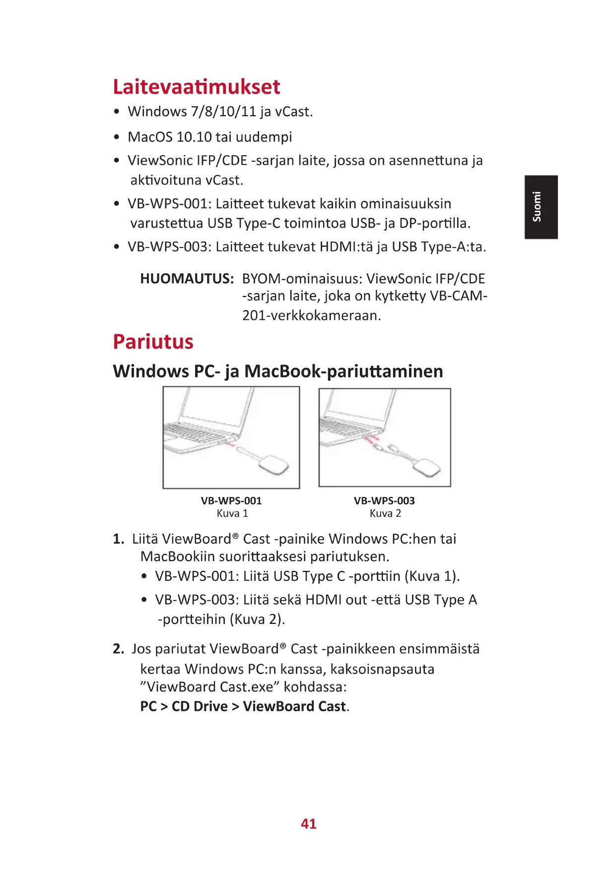 - VB-WPS-003: Laieet tukevat HDMI:tä ja USB Type-A:ta. HUOMAUTUS:ᅠ BYOM-ominaisuus: ViewSonic IFP/CDE -sarjan laite, joka on kytkey VB-CAM- 201-verkkokameraan. Pariutus Windows PC- ja MacBook-pariuaminen VB-WPS-001 Kuva 1 VB-WPS-003 Kuva 2