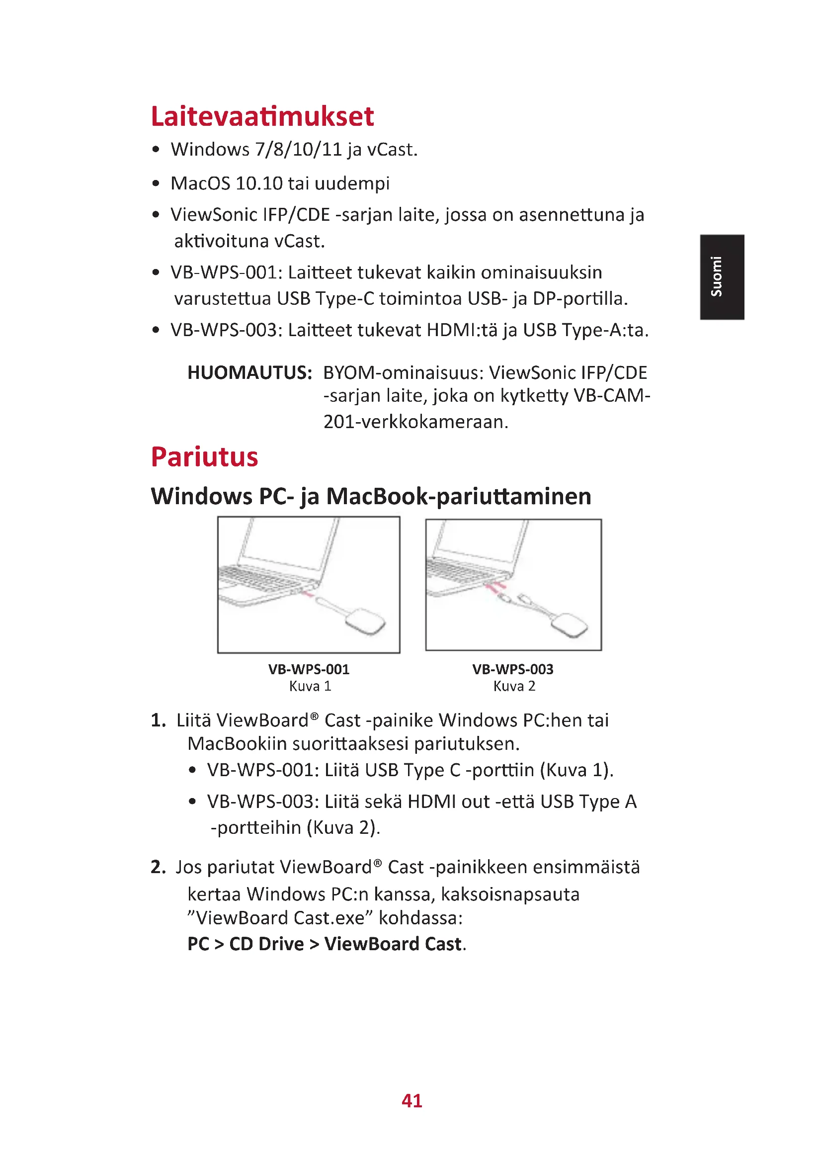 - VB-WPS-003: Laieet tukevat HDMI:tä ja USB Type-A:ta. HUOMAUTUS:ᅠ BYOM-ominaisuus: ViewSonic IFP/CDE -sarjan laite, joka on kytkey VB-CAM- 201-verkkokameraan. Pariutus Windows PC- ja MacBook-pariuaminen VB-WPS-001 Kuva 1 VB-WPS-003 Kuva 2