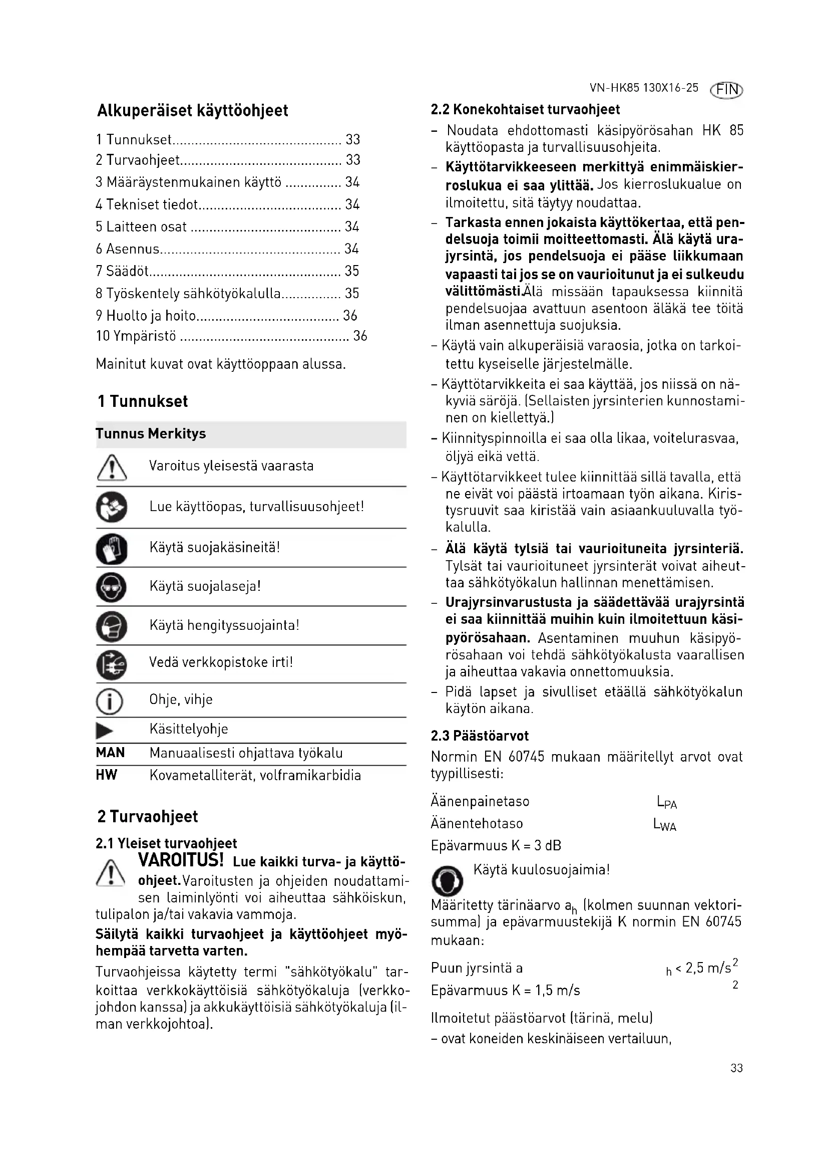 - Noudata ehdottomasti käsipyörösahan HK 85 käytöopasta ja turvallisuusohjeita.
