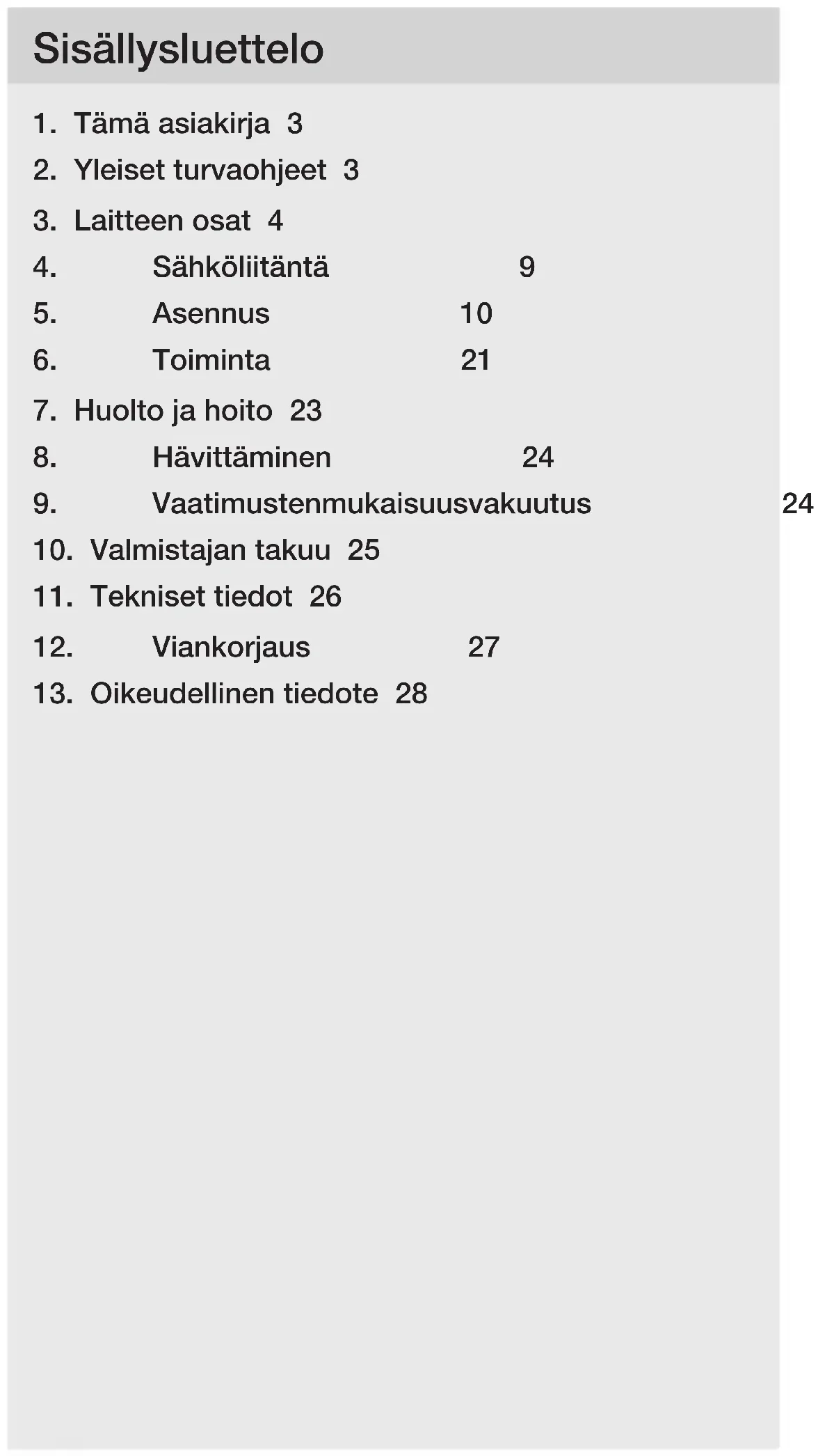 - Puhdista laite vain hieman kostutetulla liinalla ilman puhdistusaineita. Tärkeää: Käyttölaitetta ei voi vaihtaa uuteen.– 24 – Sisällysluettelo