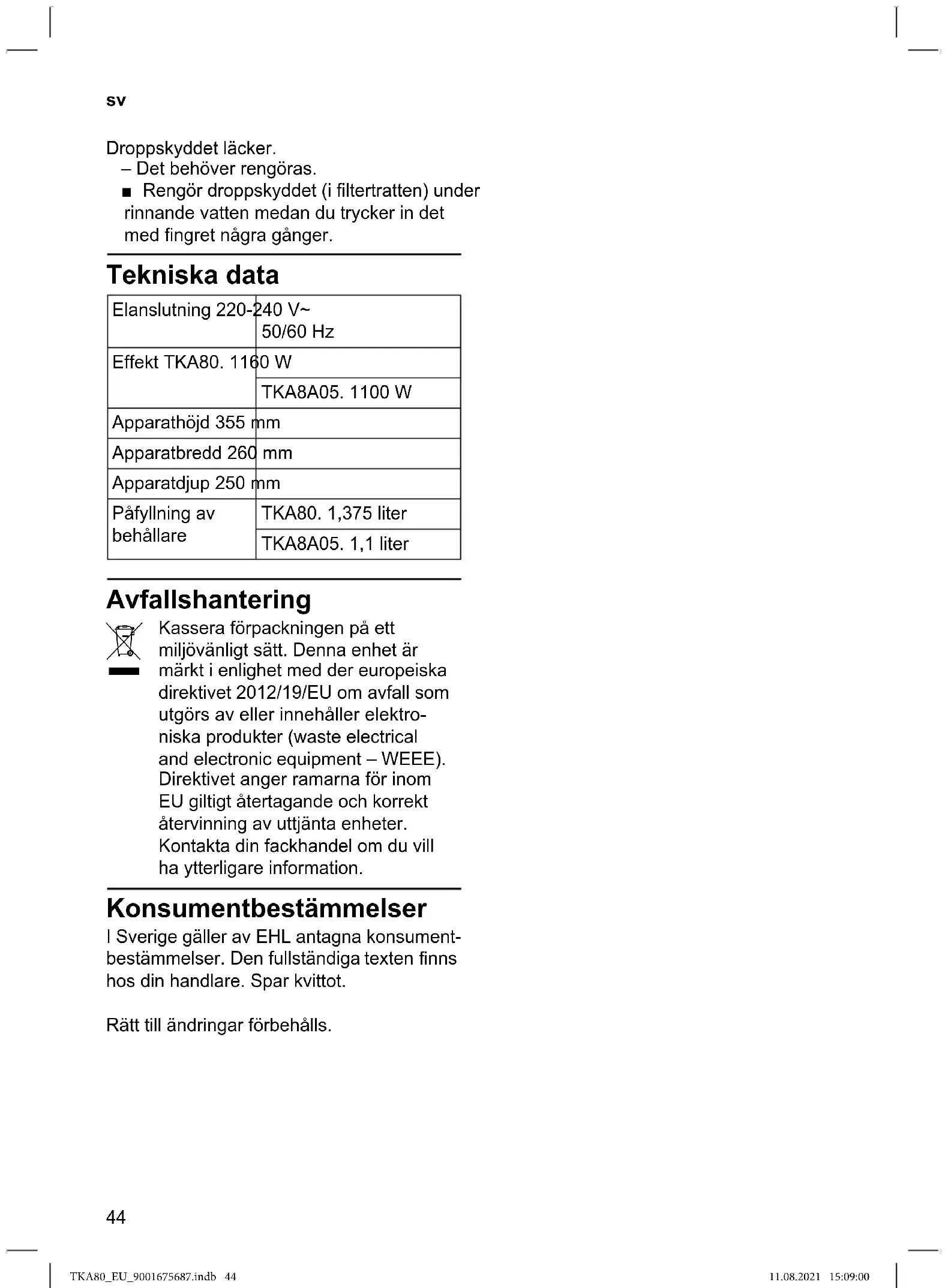 | Vesisäiliön täytömäärä | TKA80. 1,375 L |