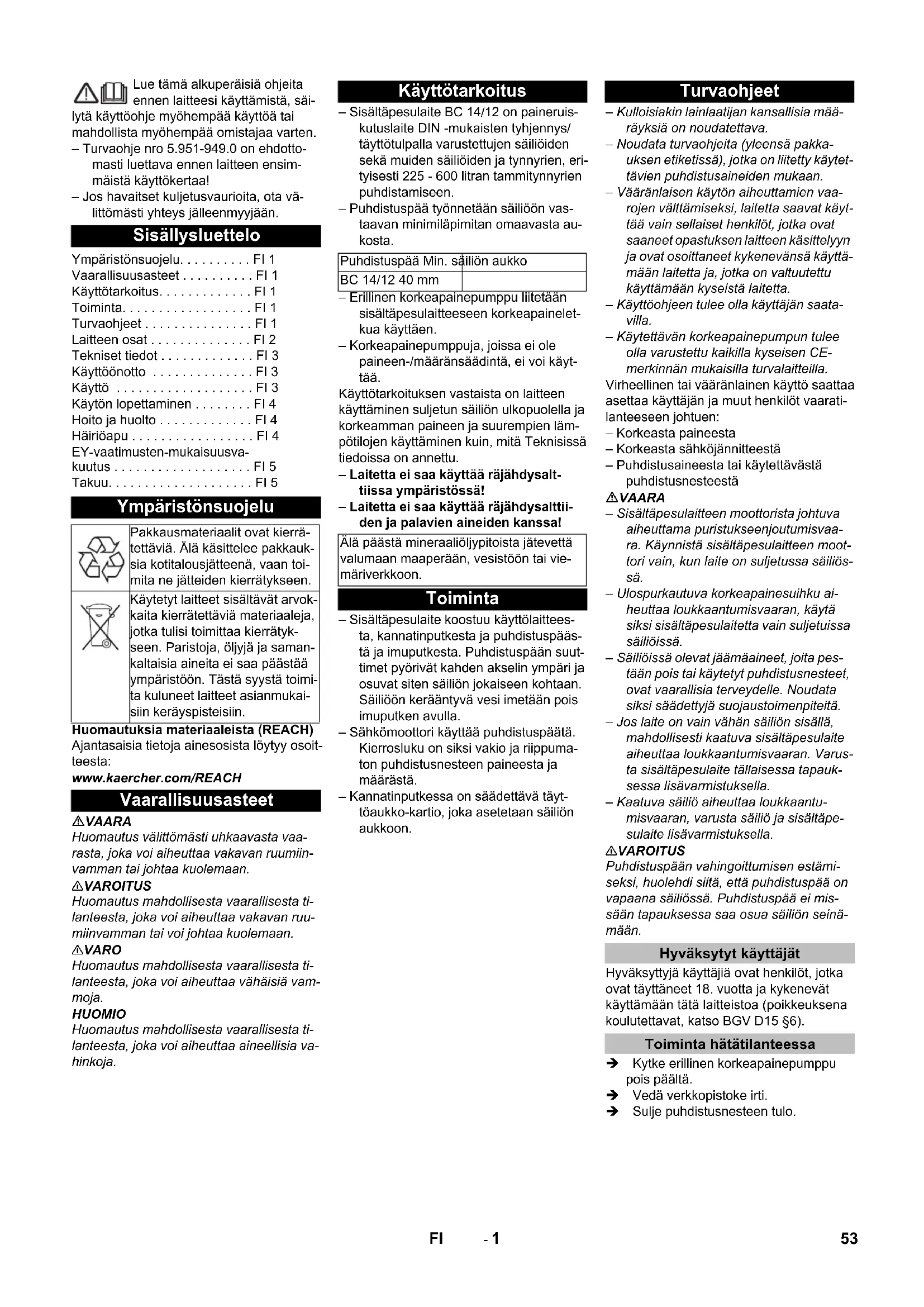 (20-25) Imusuutti- men väri keltainen vihreä sininen Ruiskusuut- timen väri taivaan- sininen punainen liila Imusuutin Ruiskusuuttimet Käyttö Huomautus On pyrittävä siihen, että sisältäpesulaite on pestävän tilan keskellä. 55FI- 4 Työnnä sisältäpesulaite kannatinput- kessa olevan täyttöaukkokartion kans- sa puhdistettavaan kohteeseen. Löysää täyttöaukkokartion ruuvilukitusta. Upotussyvyyden säätö: Työnnä sisältä- puhdistuslaite niin syvälle säiliön auk- koon, että imuputki koskettaa säiliön pohjaa. Kohota sitten sisältäpesulaitet- ta (2-3 mm) niin, että imuputki ei enää kosketa pohjaa. Kiristä täyttöaukkokartion ruuvilukitus. Asenna kannatinputkeen kannatinpidi- ke, jotta sisältäpesulaite pysyy taatusti paikallaan. Yhdistä korkeapainepumppu korkea- paineletkulla sisältäpesulaitteeseen. Yhdistä veden lähtöliittimeen vastaava poistoletku. Yhdistä sisältäpesulaite verkkolaittee- seen, tarvittaessa jatkokaapelia käyttä- en. Työnnä virtapistoke pistorasiaan. Aseta vaihtovipu SPRAY-asentoon. Tällöin suoritetaan pesua sekä imetään samanaikaisesti pois säiliön sisälle ker- tyvää ylimääräistä vettä. Kytke sisältäpesulaite laitekytkimellä päälle. Merkkilamppuun tulee vihreä valo. Avaa puhdistusnesteen tuloventtiili. Käynnistä erillinen korkeapainepump- pu. Käännä vaihtovipu puhdistuksen lopus- sa SUCTION-asentoon, jotta loppuvesi tulee imetyksi pois säiliöstä. Kytke erillinen korkeapainepumppu pois päältä. Sulje puhdistusnesteen tulo. Kytke sisältäpesulaite laitekytkimellä pois päältä. Merkkivalo sammuu. Vedä verkkopistoke irti. Poista sisältäpuhdistaja säiliöstä. Laitteiston käyttöturvallisuus perustuu säännölliseen huoltoon. Käytä ainoastaan valmistajan alkuperäis- varaosia tai osia, joita hän suosittelee, ku- ten – vara- ja kulumisosat – lisävarusteosat – käyttöaineet – Puhdistusaine VAARA Onnettomuusvaara laitteistoon kohdistu- vissa töissä. Ennen kaikkia töitä: Kytke korkeapainepumppu pääkytki- mellä jännitteettömäsi ja varmista pää- kytkin. Sulje puhdistusnesteen tulo. Vedä verkkopistoke irti. Huoltotöitä saavat suorittaa vain koulutetut henkilöt, jotka osaavat käyttää ja huoltaa korkeapainelaitteistoja turvallisesti. Jotta laitteiston luotettava käyttö varmiste- taan, suosittelemme huoltosopimuksen solmimista. Käänny asianomaisen Kärcher -asiakaspalvelun puoleen. Poista epäpuhtaudet puhdistuspään hammastuksen alueelta. Tarkasta ruuvien tiukka kiinnitys. VAARA Onnettomuusvaara laitteistoon kohdistu- vissa töissä. Ennen kaikkia töitä: Kytke korkeapainepumppu pääkytki- mellä jännitteettömäsi ja varmista pää- kytkin. Sulje puhdistusnesteen tulo. Vedä verkkopistoke irti. Käyttäjä Töitä, joissa on merkki "Käyttäjä", saa- vat suorittaa vain perehdytetyt henkilöt, jotka osaavat käyttää ja huoltaa korkea- painelaitteistoja turvallisesti. Sähköalan ammattilaiset Ainoastaan henkilöt, joilla on sähköalan ammatillinen koulutus. Asiakaspalvelu Töitä, joissa on viite "Asiakaspalvelu", saavat suorittaa vain Kärcher -asiakas- palvelun asentajat. 1 Akselitumppi 2 Liukurengastiiviste 3 Kartiopyörä 4 Ruiskusuutin 5 Aluslevy Kierrä akselitumppi ulos ja poista kartio- hammaspyörä tiivisteineen ja aluslevyi- neen. Sivele uuden akselitumpin kierre tiivis- teaineella. Pistä kartiohammaspyörä tiivisteineen ja aluslevyineen akselitumppiin ja kierrä akselitumppi paikalleen. Upotussyvyyden säätö ja kannattimen asennus Letkujen liittäminen Huomautus Poistoletkun läpimitan tulee olla vähintään 17 mm. Jotta vältyttäisiin mahdollisilta pai- nehäviöiltä niin hyvin kuin mahdollistalen, on vältettävä letkun litistymiskohtia ja äkki- näisiä taitoksia. Puhdistaminen Huomautus Säiliön perusteellisen puhdistuksen takaa- miseksi, suosittelemme kahden puhdistus- syklin käyttämistä. Yhden syklin kestoaika on 36 sekuntia. Käytön lopettaminen Huomautus Huuhtele sisältäpesulaitetta ennen käytös- tä poistamista 30 sekunnin ajan ilman puh- distusainetta. Täten estetään tiivisteiden karstaantuminen ja liimautuminen ja siten ennenaikainen kuluminen. Hoito ja huolto Kuka saa suorittaa huoltotöitä? Huoltosopimus Huoltokaavio Päivittäin ennen käyttöä Kuukausittain Häiriöapu Häiriönpoistoon liittyviä huomautuksia Huomautus Sisältäpesulaite on tarkoitettu pyörimään ainoastaan myötäpäivään (vaihdemootto- rista katsoen). Jos verkkolaite vaihdetaan tai sähköliitäntään tehdään toimenpiteitä, sen jälkeen on tarkastettava, pyöriikö si- sältäpesulaite vielä oikeaan suuntaan. Kuka saa korjata häiriöt? Puhdistuspään vaihto 56 FI- 5 Vakuutamme, että alla mainitut tuotteet vastaavat suunnittelultaan ja rakenteeltaan sekä valmistustavaltaan EU-direktiivien asi- anomaisia turvallisuus- ja terveysvaatimuk- sia. Jos tuotteeseen/tuotteisiin tehdään muutoksia, joista ei ole sovittu kanssamme, tämä vakuutus ei ole enää voimassa. Allekirjoittaneet toimivat yrityksen johto- kunnan puolesta ja sen valtakirjalla. Dokumentointivastaava: S. Reiser Alfred Kärcher SE & Co. KG Alfred-Kärcher-Straße 28-40 71364 Winnenden (Germany) Tel.: +49 7195 14-0 Fax: +49 7195 14-2212 Winnenden, 2018/10/01 Kussakin maassa ovat voimassa valtuutta- mamme myyntiorganisaation julkaisemat takuuehdot. Materiaali- ja valmistusvirheis- tä aiheutuvat virheet laitteessa korjaamme takuuaikana maksutta. Takuutapauksessa ota yhteys ostotositteen kanssa jälleen- myyjään tai lähimpään valtuutettuun huol- toon. Vianetsintä Häiriö Mahdollinen syy Korjaus suorittaja Moottori ei pyöri Moottorissa ei jännitettä. Tarkasta sulake, verkkolaite ja johdotus. Sähköalan ammatti- lainen Käämissä oleva lämpösuojakytkin on lauennut. Poista ylikuormituksen aiheuttaja. Sähköalan ammatti- lainen Vikavirtasuojakytkin on lauennut. Poista vian aiheuttaja ja paina lauennut vikavirta- suojakytkin kiinni. Sähköalan ammatti- lai