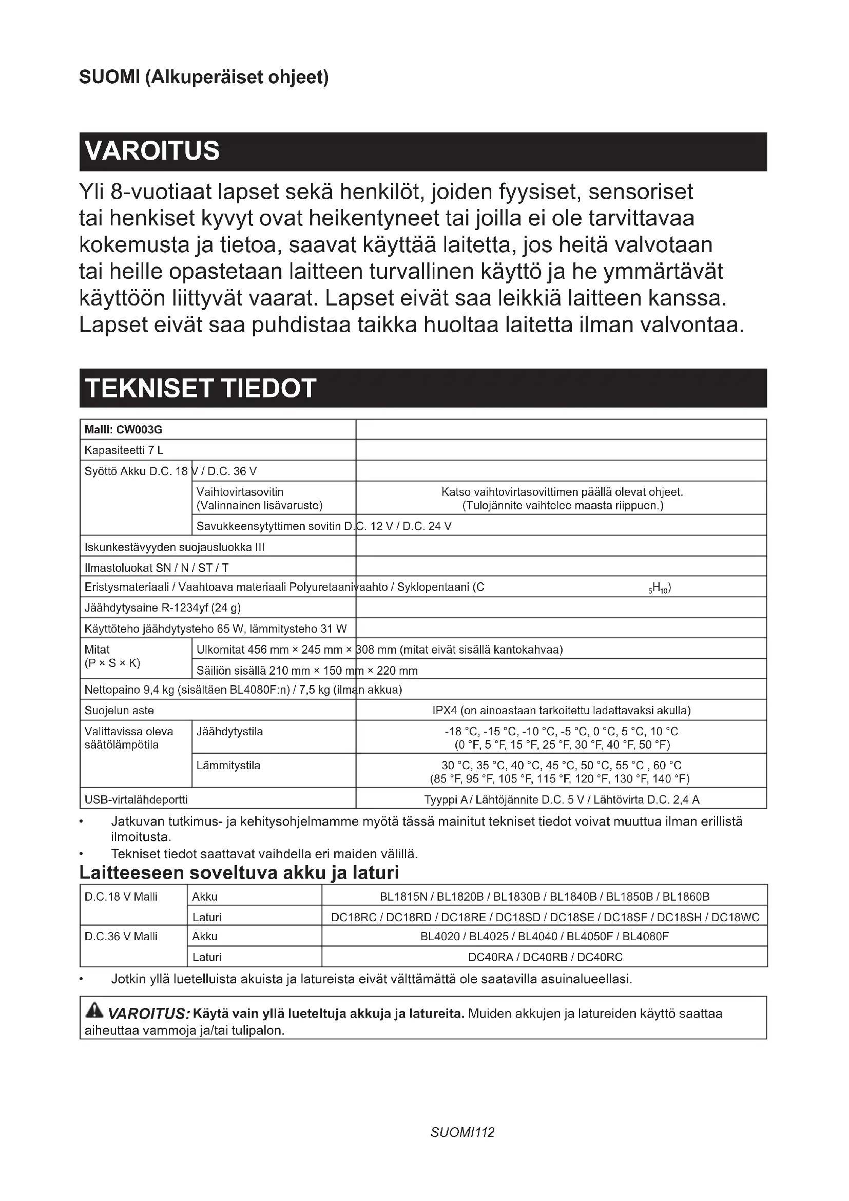 - Ekte Makita-batteri og -lader MERK: Noen elementer i denne listen kan være inkludert i verktøypakken som standardutstyr. Dette kan variere fra land til land.SUOMI112 SUOMI (Alkuperäiset ohjeet) VAROITUS Yli 8-vuotiaat lapset sekä henkilöt, joiden fyysiset, sensoriset tai henkiset kyvyt ovat heikentyneet tai joilla ei ole tarvittavaa kokemusta ja tietoa, saavat käyttää laitetta, jos heitä valvotaan tai heille opastetaan laitteen turvallinen käyttö ja he ymmärtävät käyttöön liittyvät vaarat. Lapset eivät saa leikkiä laitteen kanssa. Lapset eivät saa puhdistaa taikka huoltaa laitetta ilman valvontaa. TEKNISET TIEDOT Malli: CW003GKapasiteetti 7 LSyöttö Akku D.C. 18 V / D.C. 36 VVaihtovirtasovitin (Valinnainen lisävaruste)Katso vaihtovirtasovittimen päällä olevat ohjeet. (Tulojännite vaihtelee maasta riippuen.)Savukkeensytyttimen sovitin D.C. 12 V / D.C. 24 VIskunkestävyyden suojausluokka IIIIlmastoluokat SN / N / ST / TEristysmateriaali / Vaahtoava materiaali Polyuretaanivaahto / Syklopentaani (C