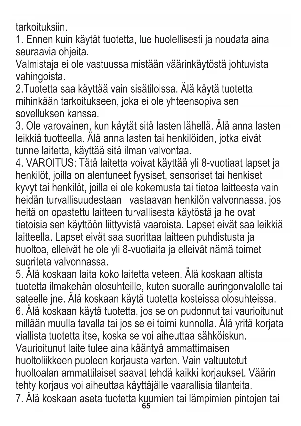 leikkiä tuotteella. Älä anna lasten tai henkilöiden, jotka eivät tunne laitetta, käyttää sitä ilman valvontaa. Valmistaja ei ole vastuussa mistään väärinkäytöstä johtuvista vahingoista.66