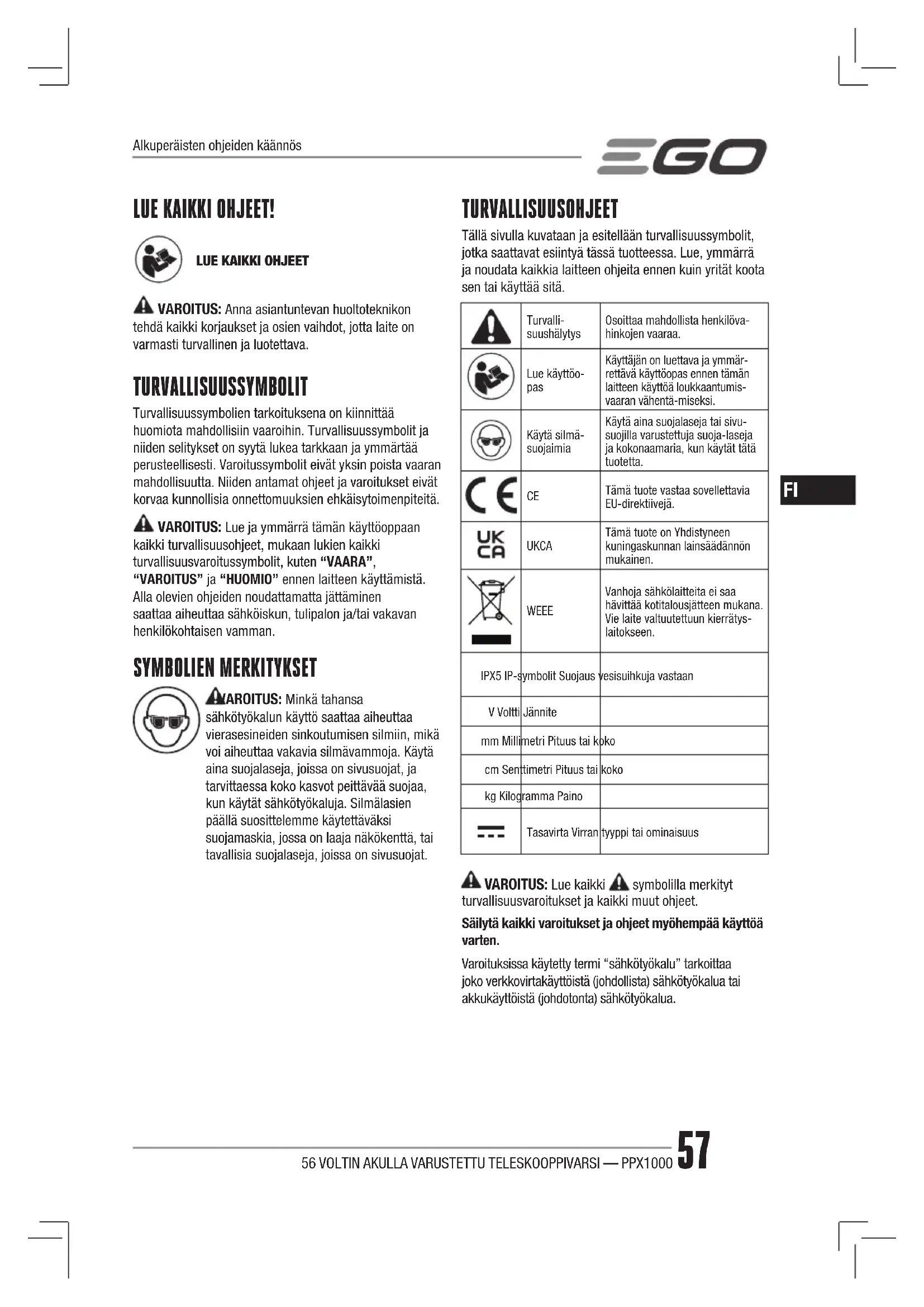VAROITUS: Anna asiantuntevan huoltoteknikon tehdä kaikki korjaukset ja osien vaihdot, jotta laite on varmasti turvallinen ja luotettava. TURVALLISUUSSYMBOLIT Turvallisuussymbolien tarkoituksena on kiinnittää huomiota mahdollisiin vaaroihin. Turvallisuussymbolit ja niiden selitykset on syytä lukea tarkkaan ja ymmärtää perusteellisesti. Varoitussymbolit eivät yksin poista vaaran mahdollisuutta. Niiden antamat ohjeet ja varoitukset eivät korvaa kunnollisia onnettomuuksien ehkäisytoimenpiteitä. VAROITUS: Lue ja ymmärrä tämän käyttöoppaan kaikki turvallisuusohjeet, mukaan lukien kaikki turvallisuusvaroitussymbolit, kuten “VAARA”, “VAROITUS” ja “HUOMIO” ennen laitteen käyttämistä. Alla olevien ohjeiden noudattamatta jättäminen saattaa aiheuttaa sähköiskun, tulipalon ja/tai vakavan henkilökohtaisen vamman. SYMBOLIEN MERKITYKSET VAROITUS: Minkä tahansa sähkötyökalun käyttö saattaa aiheuttaa vierasesineiden sinkoutumisen silmiin, mikä voi aiheuttaa vakavia silmävammoja. Käytä aina suojalaseja, joissa on sivusuojat, ja tarvittaessa koko kasvot peittävää suojaa, kun käytät sähkötyökaluja. Silmälasien päällä suosittelemme käytettäväksi suojamaskia, jossa on laaja näkökenttä, tai tavallisia suojalaseja, joissa on sivusuojat. TURVALLISUUSOHJEET Tällä sivulla kuvataan ja esitellään turvallisuussymbolit, jotka saattavat esiintyä tässä tuotteessa. Lue, ymmärrä ja noudata kaikkia laitteen ohjeita ennen kuin yrität koota sen tai käyttää sitä. Turvalli-suushälytysOsoittaa mahdollista henkilöva-hinkojen vaaraa.Lue käyttöo- pas Käyttäjän on luettava ja ymmär-rettävä käyttöopas ennen tämän laitteen käyttöä loukkaantumis-vaaran vähentä-miseksi.Käytä silmä-suojaimiaKäytä aina suojalaseja tai sivu-suojilla varustettuja suoja-laseja ja kokonaamaria, kun käytät tätä tuotetta. Tämä tuote vastaa sovellettavia EU-direktiivejä. UKCA Tämä tuote on Yhdistyneen kuningaskunnan lainsäädännön mukainen. WEEE Vanhoja sähkölaitteita ei saa hävittää kotitalousjätteen mukana. Vie laite valtuutettuun kierrätys-laitokseen.IPX5 IP-symbolit Suojaus vesisuihkuja vastaanV Voltti Jännitemm Millimetri Pituus tai kokocm Senttimetri Pituus tai kokokg Kilogramma PainoTasavirta Virran tyyppi tai ominaisuus VAROITUS: Lue kaikki symbolilla merkityt turvallisuusvaroitukset ja kaikki muut ohjeet. Säilytä kaikki varoitukset ja ohjeet myöhempää käyttöä varten. Varoituksissa käytetty termi “sähkötyökalu” tarkoittaa joko verkkovirtakäyttöistä (johdollista) sähkötyökalua tai akkukäyttöistä (johdotonta) sähkötyökalua. Alkuperäisten ohjeiden käännös56 VOLTIN AKULLA VARUSTETTU TELESKOOPPIVARSI — PPX1000 58