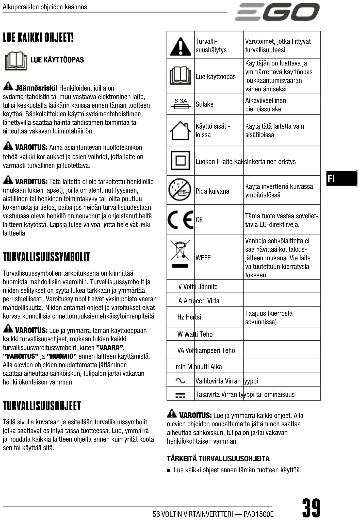 ◾ Lue kaikki ohjeet ennen tämän tuotteen käyttöä. Alkuperäisten ohjeiden käännös56 VOLTIN VIRTAINVERTTERI — PAD1500E40