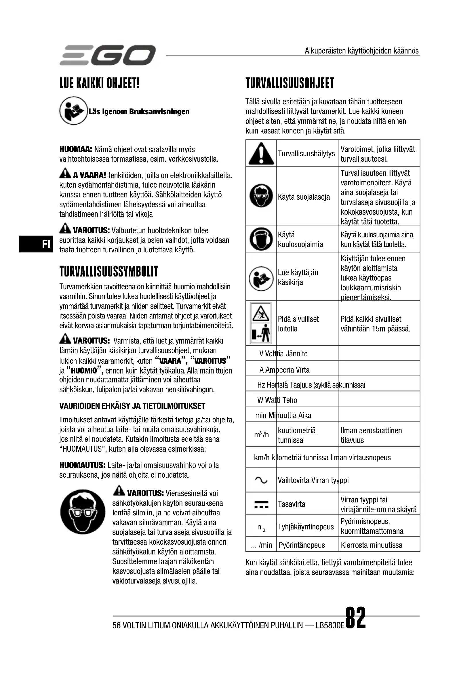 TyhjäkäyntinopeusPyörimisnopeus, kuormittamattomana... /min Pyörintänopeus Kierrosta minuutissaKun käytät sähkölaitetta, tiettyjä varotoimenpiteitä tulee aina noudattaa, joista seuraavassa mainitaan muutamia: LUE KAIKKI OHJEET! Läs Igenom BruksanvisningenHUOMAA: Nämä ohjeet ovat saatavilla myös vaihtoehtoisessa formaatissa, esim. verkkosivustolla. A VAARA!Henkilöiden, joilla on elektroniikkalaitteita, kuten sydämentahdistimia, tulee neuvotella lääkärin kanssa ennen tuotteen käyttöä. Sähkölaitteiden käyttö sydämentahdistimen läheisyydessä voi aiheuttaa tahdistimeen häiriöitä tai vikoja VAROITUS: Valtuutetun huoltoteknikon tulee suorittaa kaikki korjaukset ja osien vaihdot, jotta voidaan taata tuotteen turvallinen ja luotettava käyttö. TURVALLISUUSSYMBOLIT Turvamerkkien tavoitteena on kiinnittää huomio mahdollisiin vaaroihin. Sinun tulee lukea huolellisesti käyttöohjeet ja ymmärtää turvamerkit ja niiden selitteet. Turvamerkit eivät itsessään poista vaaraa. Niiden antamat ohjeet ja varoitukset eivät korvaa asianmukaisia tapaturman torjuntatoimenpiteitä. VAROITUS: Varmista, että luet ja ymmärrät kaikki tämän käyttäjän käsikirjan turvallisuusohjeet, mukaan lukien kaikki vaaramerkit, kuten “VAARA”, “VAROITUS” ja “HUOMIO”, ennen kuin käytät työkalua. Alla mainittujen ohjeiden noudattamatta jättäminen voi aiheuttaa sähköiskun, tulipalon ja/tai vakavan henkilövahingon.VAURIOIDEN EHKÄISY JA TIETOILMOITUKSETIlmoitukset antavat käyttäjälle tärkeitä tietoja ja/tai ohjeita, joista voi aiheutua laite- tai muita omaisuusvahinkoja, jos niitä ei noudateta. Kutakin ilmoitusta edeltää sana “HUOMAUTUS”, kuten alla olevassa esimerkissä:HUOMAUTUS: Laite- ja/tai omaisuusvahinko voi olla seurauksena, jos näitä ohjeita ei noudateta. VAROITUS: Vierasesineitä voi sähkötyökalujen käytön seurauksena lentää silmiin, ja ne voivat aiheuttaa vakavan silmävamman. Käytä aina suojalaseja tai turvalaseja sivusuojilla ja tarvittaessa kokokasvosuojusta ennen sähkötyökalun käytön aloittamista. Suosittelemme laajan näkökentän kasvosuojusta silmälasien päälle tai vakioturvalaseja sivusuojilla.Alkuperäisten käyttöohjeiden käännös56 VOLTIN LITIUMIONIAKULLA AKKUKÄYTTÖINEN PUHALLIN — LB5800E
