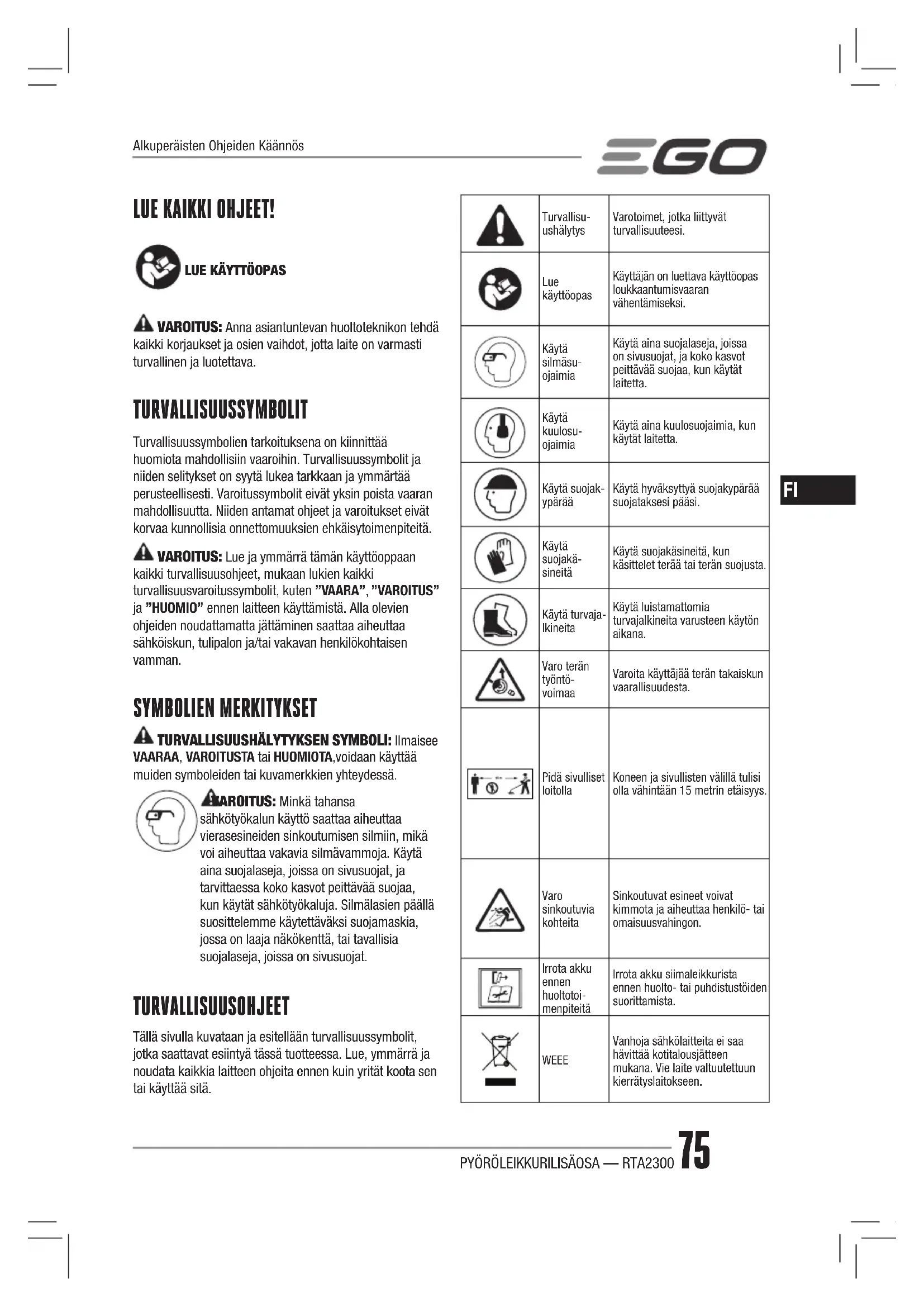 VAROITUS: Anna asiantuntevan huoltoteknikon tehdä kaikki korjaukset ja osien vaihdot, jotta laite on varmasti turvallinen ja luotettava. TURVALLISUUSSYMBOLIT Turvallisuussymbolien tarkoituksena on kiinnittää huomiota mahdollisiin vaaroihin. Turvallisuussymbolit ja niiden selitykset on syytä lukea tarkkaan ja ymmärtää perusteellisesti. Varoitussymbolit eivät yksin poista vaaran mahdollisuutta. Niiden antamat ohjeet ja varoitukset eivät korvaa kunnollisia onnettomuuksien ehkäisytoimenpiteitä. VAROITUS: Lue ja ymmärrä tämän käyttöoppaan kaikki turvallisuusohjeet, mukaan lukien kaikki turvallisuusvaroitussymbolit, kuten ”VAARA”, ”VAROITUS” ja ”HUOMIO” ennen laitteen käyttämistä. Alla olevien ohjeiden noudattamatta jättäminen saattaa aiheuttaa sähköiskun, tulipalon ja/tai vakavan henkilökohtaisen vamman. SYMBOLIEN MERKITYKSET TURVALLISUUSHÄLYTYKSEN SYMBOLI: Ilmaisee VAARAA, VAROITUSTA tai HUOMIOTA,voidaan käyttää muiden symboleiden tai kuvamerkkien yhteydessä. VAROITUS: Minkä tahansa sähkötyökalun käyttö saattaa aiheuttaa vierasesineiden sinkoutumisen silmiin, mikä voi aiheuttaa vakavia silmävammoja. Käytä aina suojalaseja, joissa on sivusuojat, ja tarvittaessa koko kasvot peittävää suojaa, kun käytät sähkötyökaluja. Silmälasien päällä suosittelemme käytettäväksi suojamaskia, jossa on laaja näkökenttä, tai tavallisia suojalaseja, joissa on sivusuojat. TURVALLISUUSOHJEET Tällä sivulla kuvataan ja esitellään turvallisuussymbolit, jotka saattavat esiintyä tässä tuotteessa. Lue, ymmärrä ja noudata kaikkia laitteen ohjeita ennen kuin yrität koota sen tai käyttää sitä. Turvallisu-ushälytysVarotoimet, jotka liittyvät turvallisuuteesi. Lue käyttöopasKäyttäjän on luettava käyttöopas loukkaantumisvaaran vähentämiseksi.Käytä silmäsu-ojaimiaKäytä aina suojalaseja, joissa on sivusuojat, ja koko kasvot peittävää suojaa, kun käytät laitetta.Käytä kuulosu-ojaimiaKäytä aina kuulosuojaimia, kun käytät laitetta.Käytä suojak-ypärääKäytä hyväksyttyä suojakypärää suojataksesi pääsi.Käytä suojakä-sineitäKäytä suojakäsineitä, kun käsittelet terää tai terän suojusta.Käytä turvaja-lkineitaKäytä luistamattomia turvajalkineita varusteen käytön aikana.Varo terän työntö-voimaaVaroita käyttäjää terän takaiskun vaarallisuudesta.Pidä sivulliset loitollaKoneen ja sivullisten välillä tulisi olla vähintään 15 metrin etäisyys.Varo sinkoutuvia kohteitaSinkoutuvat esineet voivat kimmota ja aiheuttaa henkilö- tai omaisuusvahingon.Irrota akku ennen huoltotoi-menpiteitäIrrota akku siimaleikkurista ennen huolto- tai puhdistustöiden suorittamista. WEEE Vanhoja sähkölaitteita ei saa hävittää kotitalousjätteen mukana. Vie laite valtuutettuun kierrätyslaitokseen. Alkuperäisten Ohjeiden KäännösPYÖRÖLEIKKURILISÄOSA — RTA230076