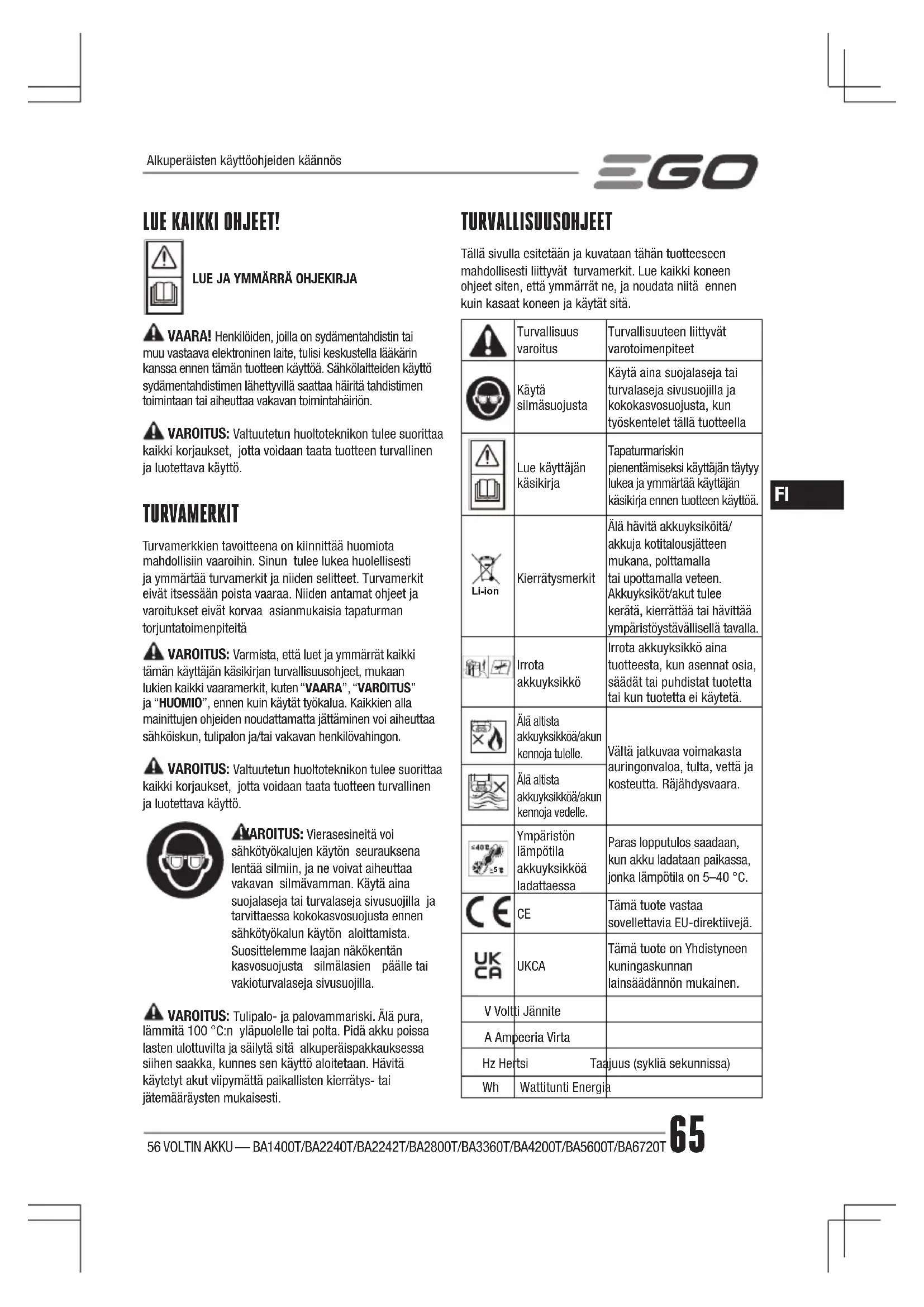 Katso verkkosivuilta osoitteesta egopowerplus.eu EGO-takuukäytännön ehdot ja edellytykset kokonaisuudessaan.56 VOLT BATTERI — BA1400T/BA2240T/BA2242T/BA2800T/BA3360T/BA4200T/BA5600T/BA6720T 71
