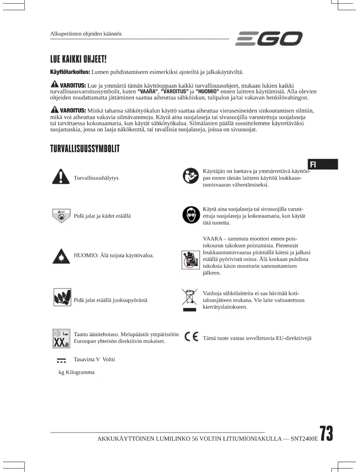 Taattu äänitehotaso. Melupäästöt ympäristöön Euroopan yhteisön direktiivin mukaiset.Tämä tuote vastaa sovellettavia EU-direktiivejäTasavirta V Volttikg KilogrammaAlkuperäisten ohjeiden käännösAKKUKÄYTTÖINEN LUMILINKO 56 VOLTIN LITIUMIONIAKULLA — SNT2400E74