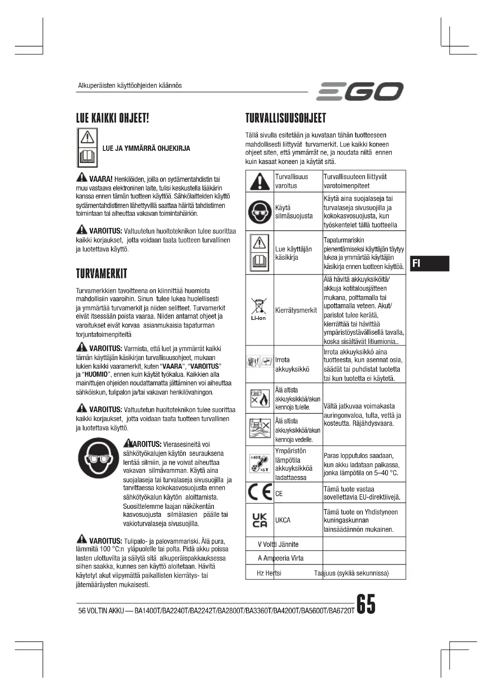 Katso verkkosivuilta osoitteesta egopowerplus.eu EGO-takuukäytännön ehdot ja edellytykset kokonaisuudessaan.56 VOLT BATTERI — BA1400T/BA2240T/BA2242T/BA2800T/BA3360T/BA4200T/BA5600T/BA6720T 71