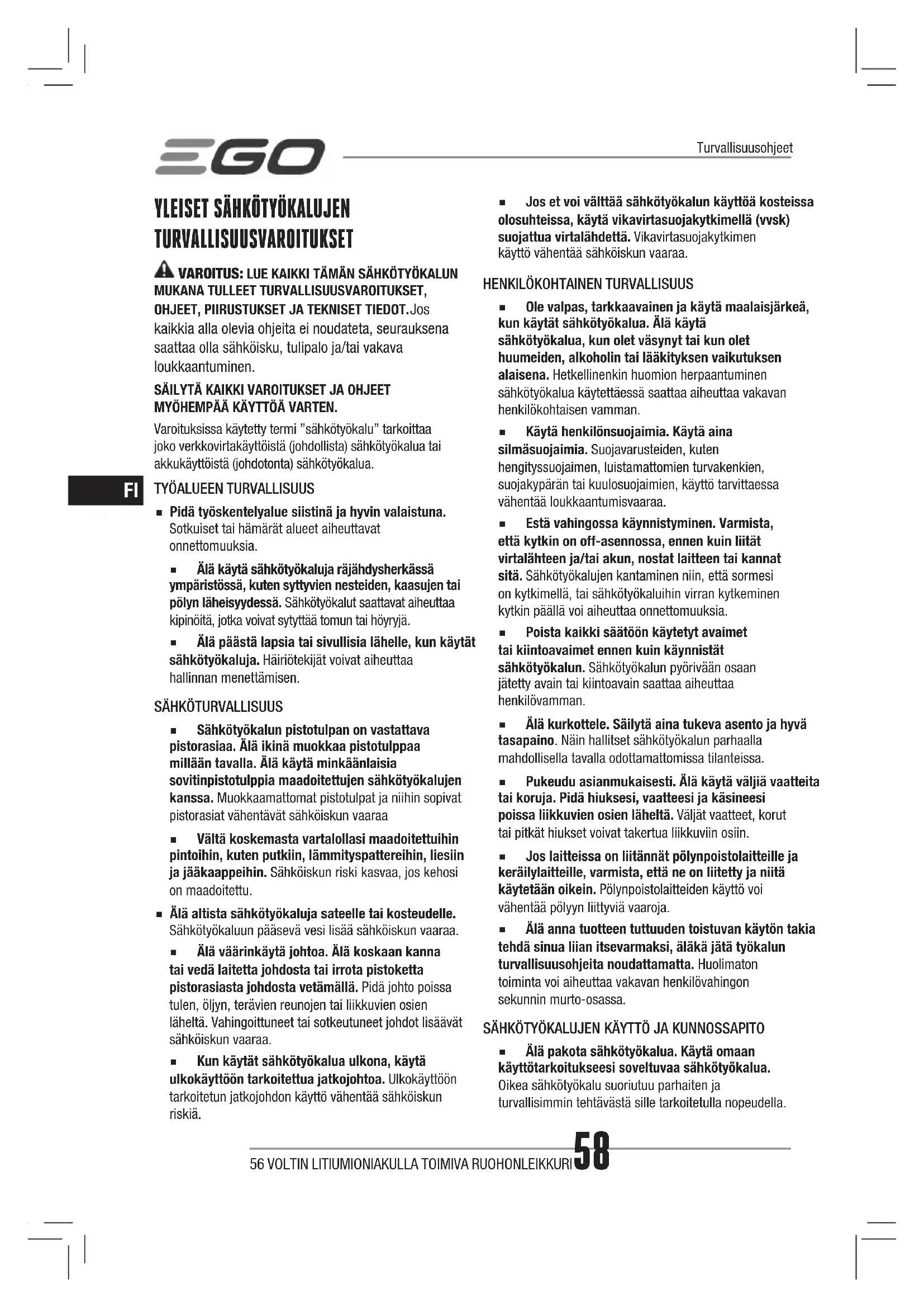 TURVALLISUUSOHJEET VAARA: Tämä laite on tarkoitettu käytettäväksi tämän käyttöoppaan turvallisten käyttöohjeiden mukaisesti. Kuten kaikkien sähkölaitteiden yhteydessä, käyttäjän tekemä virhe tai yleinen huolimattomuus saattaa aiheuttaa vakavan vamman. Tämä laite voi vahingoittaa käsiä tai jalkoja ja singota irtoesineitä. Jos turvallisuusohjeita ei noudateta, seurauksena voi olla vakava vamma tai kuolema. VAROITUS: Kun käytät akkukäyttöisiä ruohonleikkureita, noudata aina perusturvallisuusohjeita. Niiden noudattaminen vähentää tulipalon, sähköiskun ja henkilövamman riskiä.56 VOLTIN LITIUMIONIAKULLA TOIMIVA RUOHONLEIKKURI60