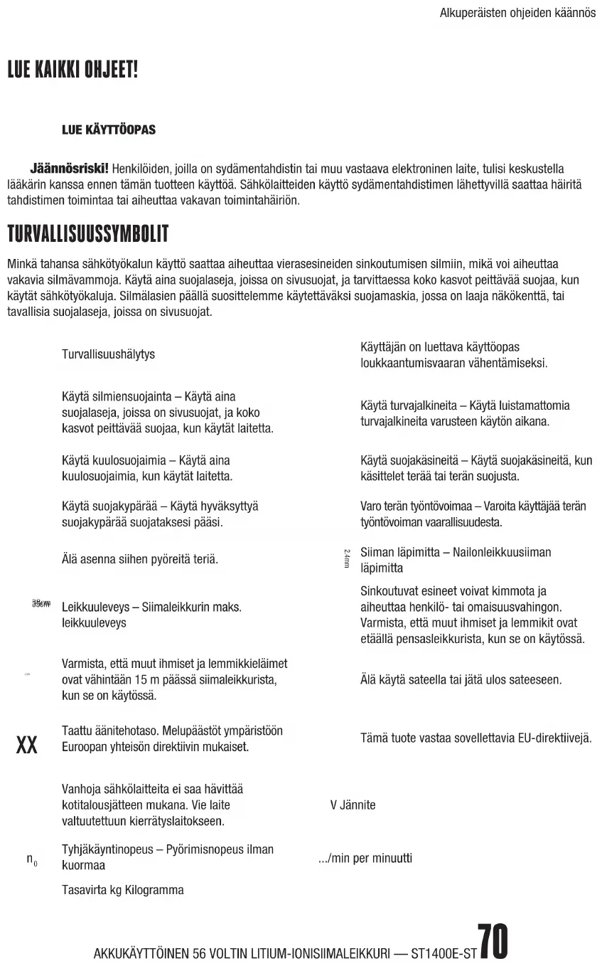 Tyhjäkäyntinopeus – Pyörimisnopeus ilman kuormaa.../min per minuuttiTasavirta kg KilogrammaAlkuperäisten ohjeiden käännösAKKUKÄYTTÖINEN 56 VOLTIN LITIUM-IONISIIMALEIKKURI — ST1400E-ST 71