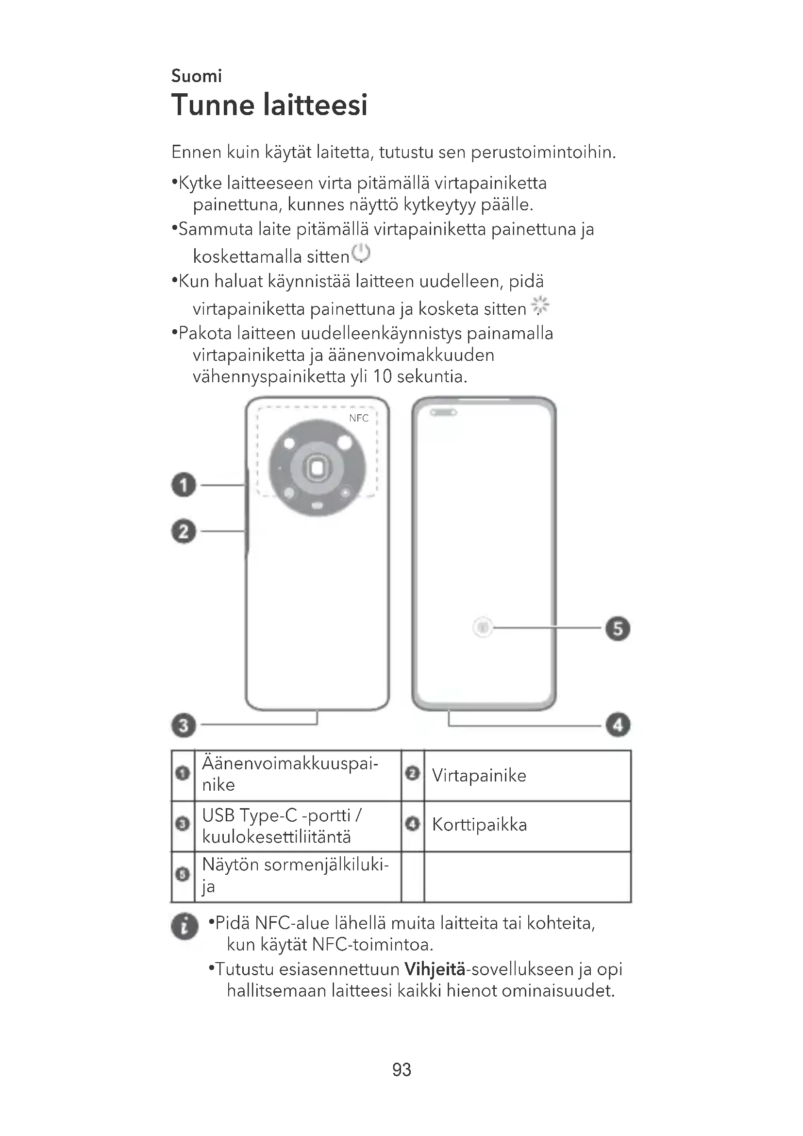 - Pakota laitteen uudelleenkäynnistys painamalla virtapainiketta ja äänenvoimakkuuden vähennyspainiketta yli 10 sekuntia. NFC Äänenvoimakkuuspai- nike Virtapainike USB Type-C -portti / kuulokesettiliitäntä Korttipaikka Näytön sormenjälkiluki-