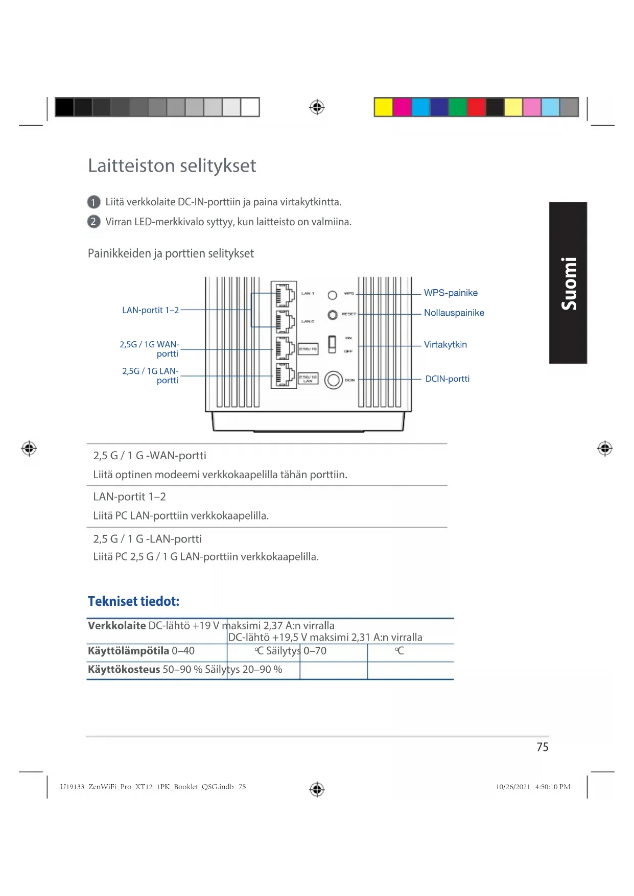 Käyttökosteus 50–90 % Säilytys 20–90 % Tekniset tiedot: LAN-portit 1–22,5G / 1G WAN-portti2,5G / 1G LAN-porttiWPS-painikeNollauspainikeVirtakytkinDCIN-portti 2,5 G / 1 G -WAN-portti Liitä optinen modeemi verkkokaapelilla tähän porttiin. LAN-portit 1–2 Liitä PC LAN-porttiin verkkokaapelilla. 2,5 G / 1 G -LAN-portti Liitä PC 2,5 G / 1 G LAN-porttiin verkkokaapelilla. U19133_ZenWiFi_Pro_XT12_1PK_Booklet_QSG.indb 75U19133_ZenWiFi_Pro_XT12_1PK_Booklet_QSG.indb 75 10/26/2021 4:50:10 PM10/26/2021 4:50:10 PM76 Suomi Valmistautuminen itsenäisen reitittimen asettamiseen