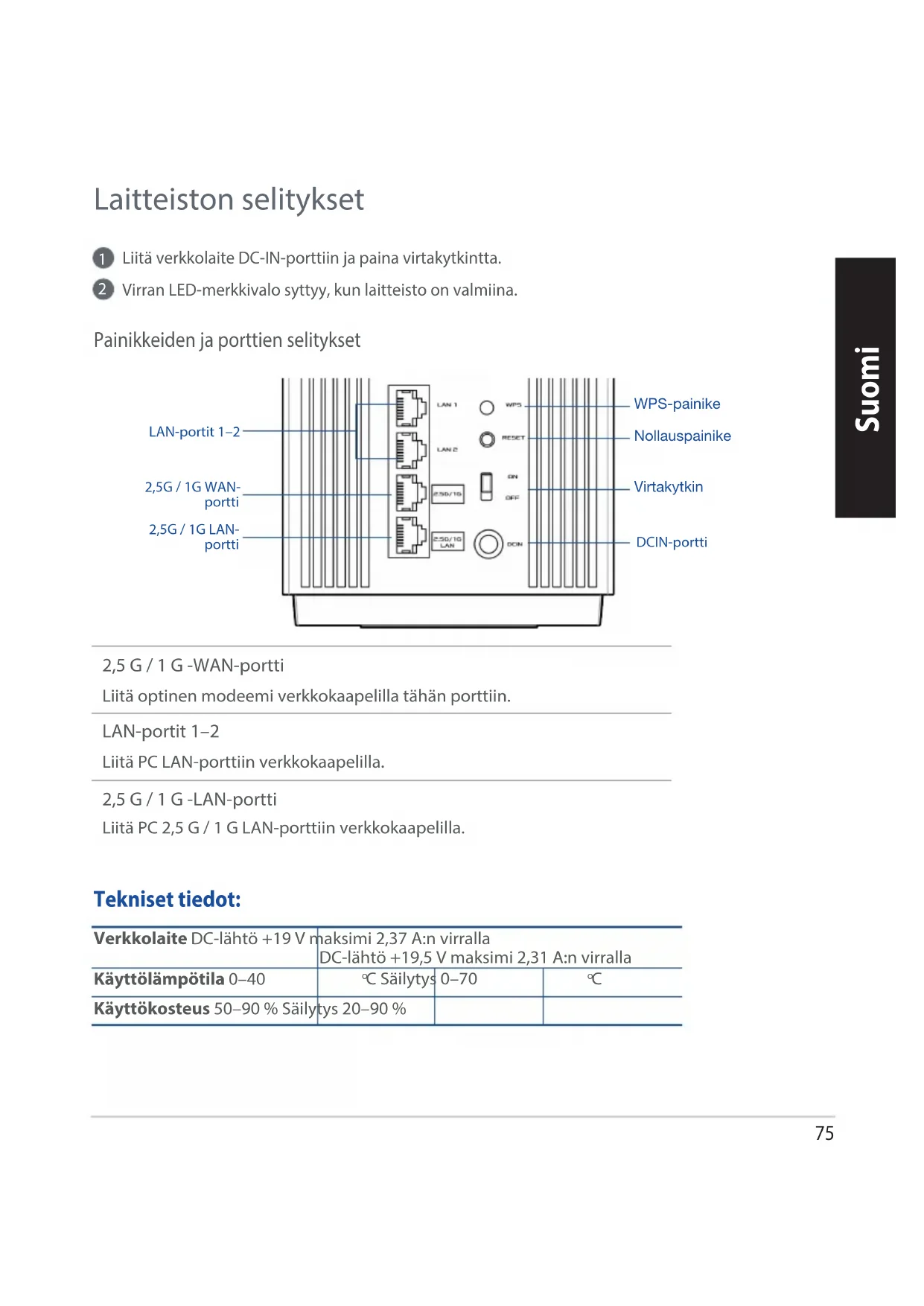 Käyttökosteus 50–90 % Säilytys 20–90 % Tekniset tiedot: LAN-portit 1–22,5G / 1G WAN-portti2,5G / 1G LAN-porttiWPS-painikeNollauspainikeVirtakytkinDCIN-portti 2,5 G / 1 G -WAN-portti Liitä optinen modeemi verkkokaapelilla tähän porttiin. LAN-portit 1–2 Liitä PC LAN-porttiin verkkokaapelilla. 2,5 G / 1 G -LAN-portti Liitä PC 2,5 G / 1 G LAN-porttiin verkkokaapelilla.76 Suomi Valmistautuminen itsenäisen reitittimen asettamiseen