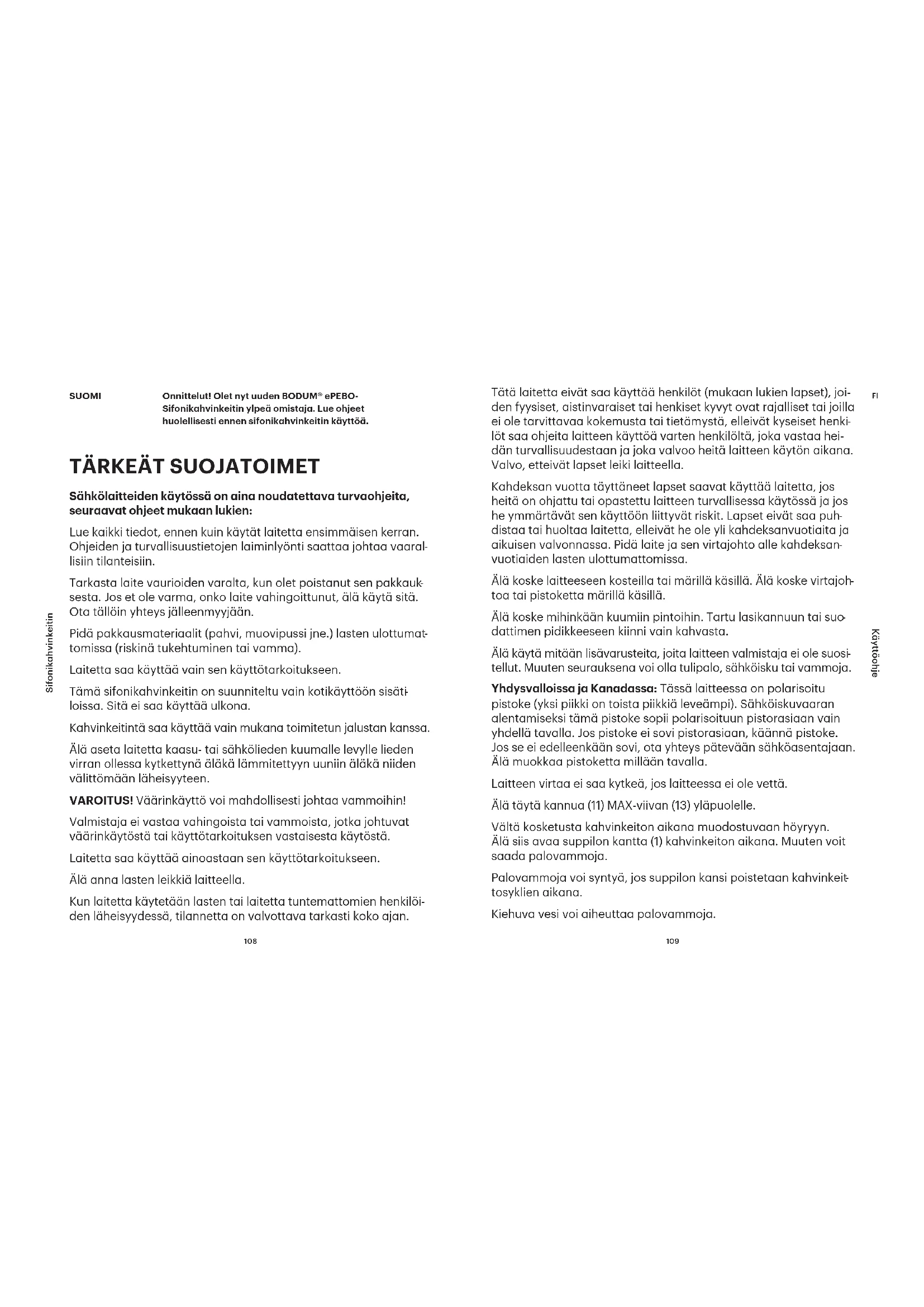 Käyttöohje Sifonikahvinkeitin 114KUNNOSSAPITO JA HOITO Kalkin poisto sifonikahvinkeittimestä Jotta sifonikahvinkeitin toimisi oikein, siihen ei saa päästä muodostumaan kalkkikerrosta. Tarvittava kalkinpoistoväli mää- räytyy veden kovuuden mukaan. Kovuus vaihtelee maittain. Suosittelemme poistamaan kalkin 100 käyttökerran välein. Tärkeää: Jos sifonikahvinkeittimelle ei tehdä kalkinpoistoa, keitin saattaa vaurioitua! Säännöllinen kalkinpoisto voi pidentää laitteen käyttöikää ja takaa sen virheettömän toiminnan. Lisäksi kalkinpoisto vähentää höyryn muodostumista, nopeuttaa kahvinkeittoa ja säästää energiaa. Kalkkijäämät on poistettava myynnissä olevalla kahvinkeitti- mien kalkinpoistoliuoksella tai liuoksella, jossa on etikkaa ja vettä (20% etikkaa ja 80% vettä). Myynnissä olevia kalkinpois- toliuoksia käytettäessä on varmistettava, että ne sopivat kupari- sille kuumennuselementeille sekä silikonimateriaaleille. (Perehdy valmistajan antamiin tietoihin ja annosteluohjeisiin huolellisesti). LAITTEEN PUHDISTUS Älä käytä sifonikahvinkeittimen puhdistamiseen koskaan mitään kemikaaleja, teräsvillaa tai hankaavia puhdistusai- neita. Käytä kannun (11) puhdistamiseen vain kosteaa liinaa. Älä koskaan upota kannua veteen. Muista, että kyseessä on sähkölaite. Huomautus: Irrota sifonikahvinkeitin aina verkkovirrasta ennen puhdistamista. Puhdista sifonikahvinkeitin jokaisen käyttökerran jälkeen. Seuraavat osat voi pestä astianpesukoneessa: 1 Suppilon kansi 12 Mittalusikka 2 Suodatin 15 Sekoituslusikka 3 Suppilo 16 Harjalla 4 Suppilon tiiviste Ennen kuin asetat suodattimen (2) astianpesukoneeseen, varmista, ettei siihen jää kahvijauhetta. Pese kannu lämpimässä ja puhtaassa juoksevassa vedessä. Hankaa sitten kannen sisäpuoli annetulla harjalla (16) saip- puan kanssa. Huuhtele kannu hyvin. Täytä kannu (11) kalkinpoistoliuoksella tai etikan ja veden sekoituksella (älä täytä MAX-merkin (13) yläpuolelle) ja anna liuoksen vaikuttaa jonkin aikaa. Huuhtele sitten kannu perusteellisesti kylmällä ja puhtaalla vedellä vähintään kahdesti. Kaikki muut huoltotyöt on annettava valtuutetun huoltoliik- keen tehtäväksi. SÄILYTYS Irrota sifonikahvinkeitin aina verkkovirrasta, kun se ei ole käytössä. TEKNISET TIEDOT TEKNISET TIEDOT EU-mallin verkkojännite 220240 V~ 5060 Hz Yhdysvaltojen mallin verkkojännite 120 V~ 60 Hz EU-mallin nimellisteho 1 000 W Yhdysvaltojen mallin nimellisteho 1 000 W Johdon pituus Noin 70 cm Tilavuus 1,0 litraa Testausmerkinnät GS, CE, ETL, CETL VALMISTAJAN TAKUU YHDYSVALTOIHIN JA KANADAAN, EU:HUN JA SVEITSIIN. Takuu: BODUM® AG, Sveitsi, takaa ePEBOSifonikahvinkeitin kahdeksi vuodeksi alkuperäisesta ostosta laskien vial- lisia materiaaleja ja toimintahäiriöitä vastaan, jotka voidaan jäljittää suunnittelu- tai valmistusvikoihin. Korjaukset suoritetaan ilmaiseksi, jos takuuehdot täyttyvät. Takaisinmaksu ei ole mahdollista. Takaaja: BODUM® (Sveitsi) AG, Kantonsstrasse 100, Postfach 463, 6234 Triengen. Takuuehdot: Takuutodistuksen on myyjän suoritettava ostohetkellä. Sinun on esitettävä takuutodistus hankkiaksesi takuupalveluja. Mikäli BODUM® tuotteesi vaatii takuupalvelua, ota yhteys BODUM® jälleenmyyjääsi, BODUM®-kaup- paasi, maasi BODUM® jakelijaan, tai vieraile osoitteessa www.bodum.com. BODUM® ei tarjoa takuuta sellaisista vahingoista, jotka aiheutuvat valtuuttamattoman henkilön vääränlaisesta käytöstä, vääränlaisesta käsittelystä, normaalista kulumisesta ja repeämisestä, riittämättömästä tai vääränlaisesta ylläpidosta tai huolenpidosta, vääränlaisesta toiminnasta tai laitteen käytöstä. Tämä Valmistajan Takuu ei vaikuta lailliseen oikeuteesi voimassa olevien sovellettavien kansallislakien alaisena, eikä vaikuta oikeuksiis jälleenmyyjää vastaan heidän myynti/osto-sopimuksesta. YMPÄRISTÖYSTÄVÄLLINEN HÄVITYS Nykyään on laitonta heittää sellaisia sähkölaitteita pois, jotka ovat viallisia tai vanhentuneita yhdessä normaalin jätteen kanssa. Ne on hävitettävä erikseen. Kuluttajalla on mahdollisuus heittää sellaiset laitteet pois yhteisön keräyskeksuksissa ilmaiseksi. Tämänlaisten laitteiden omistajan vaaditaan tuomaan ne keräyspaikoille tai laittamaan ne ulos, kun vastaavia keräyksiä pidetään. Tekemällä tämän pienen henkilökohtaisen ponnistuksen teet oman panostuksesi, joka varmistaa, että arvokkaita hyödykkeitä kierrätetään ja saasteita käsitel