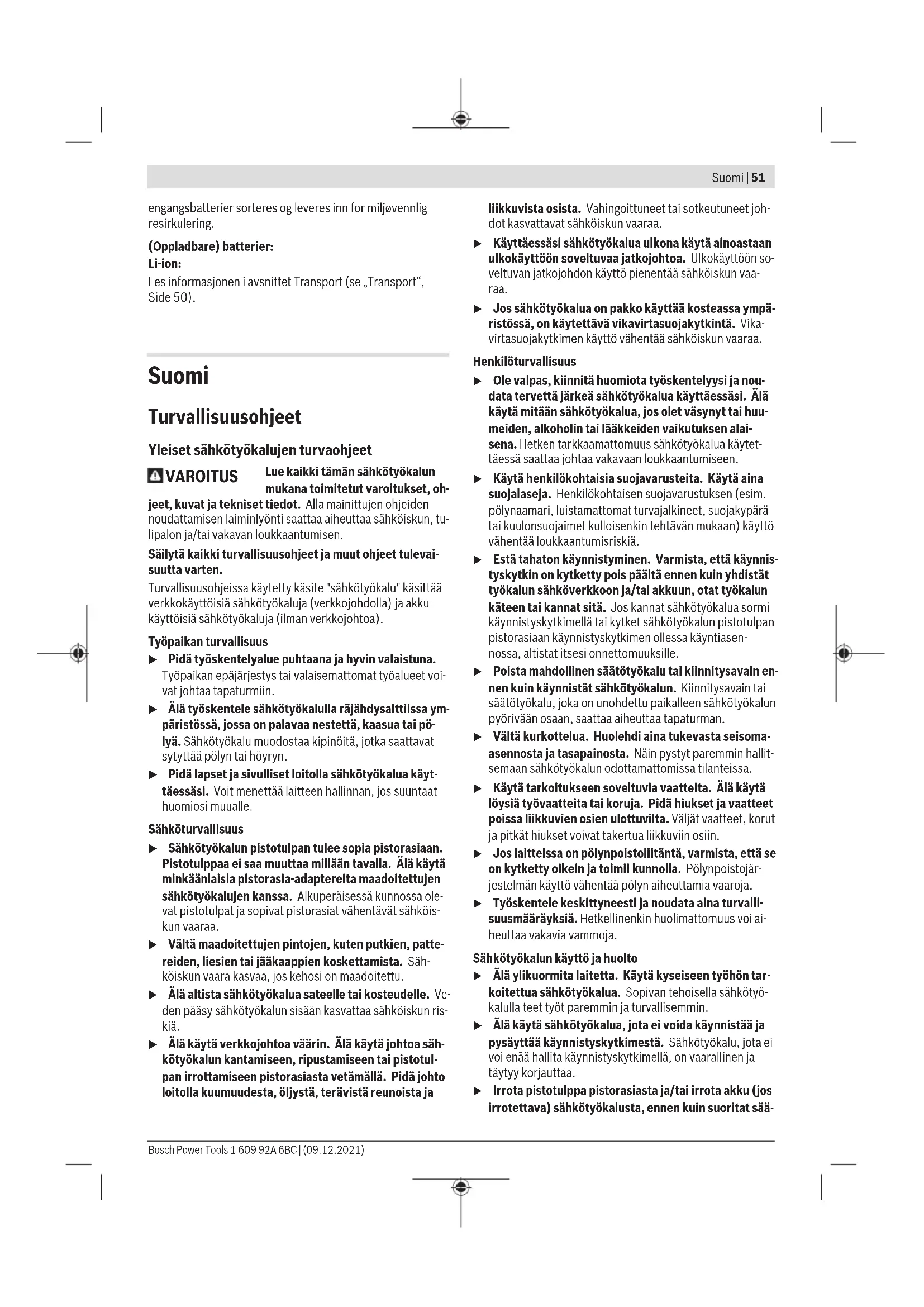 Näissä käyttöohjeissa ilmoitetut tärinä- ja melupäästötiedot on mitattu standardissa määritetyn mittausmenetelmän mu- kaan ja niitä voi käyttää sähkötyökalujen keskinäiseen vertai- luun. Ne soveltuvat myös tärinä- ja melupäästöjen alustavaan arviointiin. Ilmoitetut tärinä- ja melupäästöt vastaavat sähkötyökalun pääasiallisia käyttötapoja. Tärinä- ja melupäästöt saattavat kuitenkin poiketa ilmoitetuista arvoista, jos sähkötyökalua käytetään toisiin töihin, muilla käyttötarvikkeilla tai riittämät- tömästi huollettuna. Tämä saattaa suurentaa koko työsken- telyajan tärinä- ja melupäästöjä huomattavasti. Tärinä- ja melupäästöjen tarkaksi arvioimiseksi on huomioi- tava myös ne ajat, jolloin laite on sammutettuna tai tyhjä- käynnillä. Tämä voi vähentää huomattavasti koko työskente- lyajan tärinä- ja melupäästöjä. Määrittele tarvittavat lisävarotoimenpiteet käyttäjän suojele- miseksi tärinän aiheuttamilta haitoilta (esimerkiksi sähkötyö- kalujen ja käyttötarvikkeiden huolto, käsien pitäminen lämpi- minä ja työprosessien organisointi). Akku Bosch myy akkukäyttöisiä sähkötyökaluja myös ilman akkua. Pakkauksesta näet, sisältyykö akku sähkötyökalusi toimituk- seen. Akun lataminen u Käytä vain teknisissä tiedoissa ilmoitettuja latauslait- teita. Vain nämä latauslaitteet soveltuvat sähkötyökalus- sasi käytettävälle litiumioniakulle. Huomautus: kansainvälisten kuljetusmääräysten mukaisesti Li-ion-akut toimitetaan osittain ladattuina. Akun täyden suo- rituskyvyn varmistamiseksi akku tulee ladata täyteen ennen ensikäyttöä. u Älä paina enää käynnistyskytkintä sähkötyökalun toi- minnan automaattisen katkaisun jälkeen. Akku saattaa vahingoittua. Bosch Power Tools 1 609 92A 6BC | (09.12.2021)54 | Suomi Akun asentaminen Työnnä ladattu akku akun kiinnityskohtaan niin, että se lukit- tuu paikalleen. Akun irrottaminen Kun haluat ottaa akun pois, paina akun vapautuspainiketta ja vedä akku irti. Älä irrota akkua väkisin. Akun lataustilan näyttö Akun lataustilan näyttö ilmoittaa akun lataustilan muutaman sekunnin ajan, kun painat käynnistyskytkimen puoliksi tai ko- konaan pohjaan. LED-valo Kapasiteetti 3vihreääLED-valoa palaa jatkuvasti 75–100% 2vihreää LED-valoa palaa jatkuvasti 40–75% 1vihreä LED-valo palaa jatkuvasti 15–40% 1vihreä valo vilkkuu hitaasti 0–15% Lataustilan näytön 3 LED-valoa sekä painemittarin valo vilk- kuvat samanaikaisesti, jos akun lämpötila ei ole sallitulla käyttölämpötila-alueella ja/tai ylikuormitussuoja on kytkeyty- nyt päälle. Ohjeita akun optimaaliseen käsittelyyn Suojaa akku kosteudelta ja vedeltä. Säilytä akkua vain –20...50°C lämpötilassa. Älä jätä akkua esimerkiksi kuumana kesäpäivänä pitkäksi ajaksi autoon. Huomattavasti lyhentynyt käyntiaika latauksen jälkeen osoit- taa, että akku on elinikänsä lopussa ja täytyy vaihtaa uuteen. Huomioi hävitysohjeet. Asentaminen ja käyttäminen Valitse käyttötarkoitukseen sopiva adapteri: – venttiiliadapteri(13): sopii esim. erilaisille polkupyörän- venttiileille, – palloneula(14): sopii esim. jalkapallon pumppaamiseen, – isoreikäinen adapteri(12): sopii pienten ranta- tai urhei- lutuotteiden (esim. vesipallon) pumppaamiseen. Tavallisille autoventtiileille (joita käytetään myös monissa polkupyörissä) ei tarvita adapteria. Paina tarvikelokeron lukitsinta (15) sisään päin, avaa tarvi- kelokeron kansi(7) ja ota lokerosta käyttökohteeseen so- piva adapteri. Irrota mahdollinen ilmatäytteisen tuotteen venttiilihattu. Paineletkun (10) kääntäminen säilytys- tai käyttöasen- toon (katsokuvaA): – Käännä paineletku (10) käyttöasentoon vapauttamalla se letkupinteistä (9). – Kääntäessäsi paineletkun (10) säilytysasentoon varmista, että letkupinteet (9) tarttuvat siihen. Ilmapumpun kytkeminen venttiiliin (katsokuvaB): – Venttiiliadapteri(13): ruuvaa ensin adapteri kiinni venttii- liin. Ruuvaa sitten adapteri paineletkuun(10) rajoitti- meen asti. – Palloneula(14) ja isoreikäinen adapteri(12): ruuvaa en- sin adapteri paineletkuun(10) rajoittimeen asti. Kiristä sitten paineletku(10) adapterin kanssa venttiiliin. – Jos liitoksessa ei tarvita adapteria, kiristä paineletku(10) venttiiliin. Pumppuun kytketyn tuotteen nykyinen paine (bar/psi) näkyy painemittarissa(1). Pumppaaminen: – Paina käynnistyssalpaa(6) vasemmalle (katso kuvaC). – Paina käynnistyskytkintä(5), jolloin pumppu kytkeytyy päälle ja käynnistää pumppaamisen. Samalla työvalo(11) ja painemittarin valo syttyvät. Älä katso työvaloon, koska se voi aiheuttaa häikäisty- misen. – Kun painemittari(1) näyttää haluamaasi painetta, va- pauta käynnistyskytkin(5). Työvalo(11) ja painemittarin valo sammuvat ja ilmapumppu kytkeytyy pois päältä. – Kun työ on valmis, lukitse käynnistyskytkin painamalla käynnistyssalpaa(6) oikealle (katso kuvaC). Huomautus: keskeytä pitkäkestoissa pumppaustöissä pum- pun toiminta noin 5minuutin kuluttua ja anna letkun sekä adapterin metalliosien jäähtyä vähintään 5minuuttia. Hoito ja huolto Huolto ja puhdistus u Irrota akku ilmapumpusta ennen kaikkia ilmapump- puun liittyviä töitä (esim. huolto, käyttötarvikkeen vaihto jne.) sekä pumpun kuljetuksen ja varastoinnin ajaksi. Käynnistyskytkimen tahaton painallus aiheuttaa loukkaantumisvaaran. u Pidä ilmapumppu ja tuuletusaukot puhtaina vaivatto- man ja turvallisen käytön varmistamiseksi. Asiakaspalvelu ja käyttöneuvonta Asiakaspalvelu vastaa tuotteesi korjausta ja huoltoa sekä va- raosia koskeviin kysymyksiin. Räjäytyskuvat ja varaosatiedot ovat myös verkko-osoitteessa: www.bosch-pt.com Bosch-käyttöneuvontatiimi vastaa mielellään tuotteita ja tar- vikkeita koskeviin kysymyksiin. Ilmoita kaikissa kyselyissä ja varaosatilauksissa 10‑numeroi- nen tuotenumero, joka on ilmoitettu tuotteen mallikilvessä. Suomi Robert Bosc
