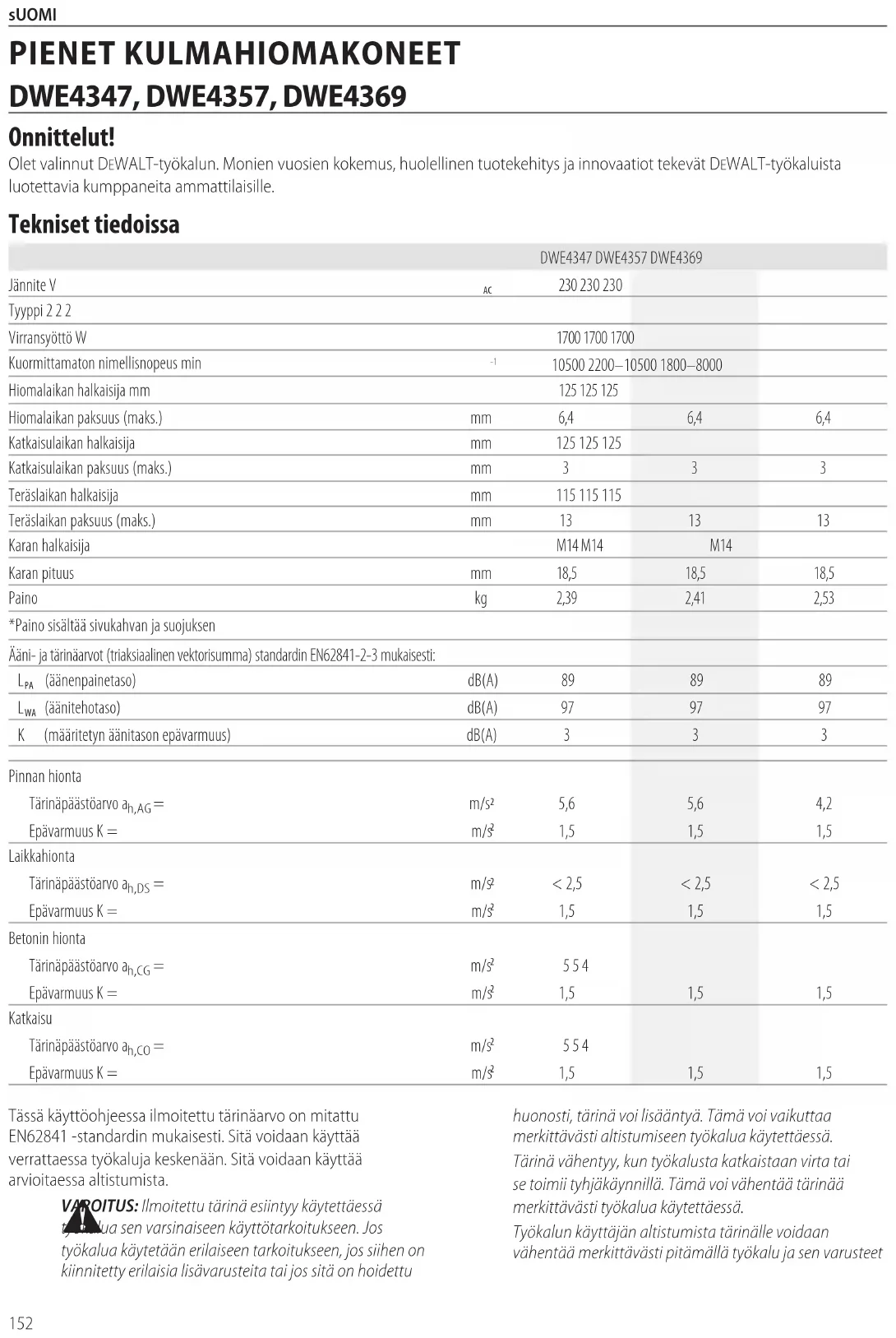VAROITUS: Ilmoitettu tärinä esiintyy käytettäessä työkalua sen varsinaiseen käyttötarkoitukseen. Jos työkalua käytetään erilaiseen tarkoitukseen, jos siihen on kiinnitetty erilaisia lisävarusteita tai jos sitä on hoidettu Suomi (käännetty alkuperäisestä käyttöohjeesta) PIENET KULMAHIOMAKONEET